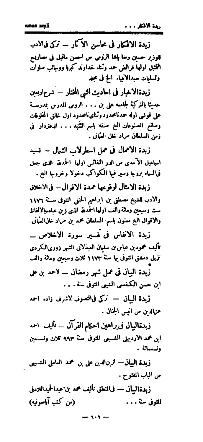 زبدة الأنفاس في تفسير سورة الإخلاص - تأليف محمود بن عباس بن سليمان العبدلاني الشهر زوري الكردي نزيل دمشق المتوفى بها سنة 1173 ثلاث وسبعين ومائة وألف زبدة البيان في عمل شهر رمضان - لأحمد بن علي ابن حسن الكفعمي الشيعي المتوفى سنة..زبدة البيان - تركي في التصوف لأشرف زاده أحمد عز الدين ص أنيس الجنان.