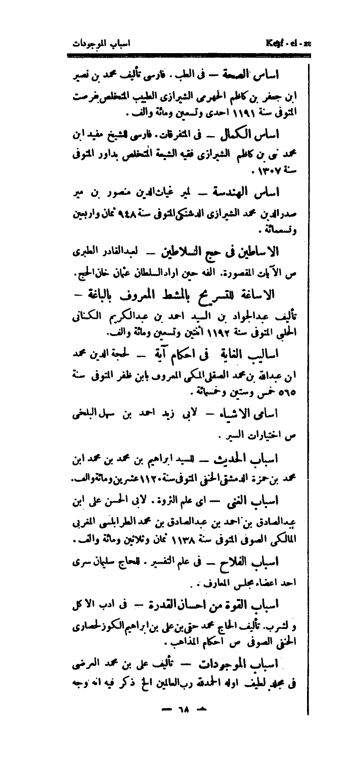 أسباب الموجودات - تأليف علي بن محمد العرضي في مجلد لطيف أوله الحمدلله رب العالمين الخ ذكر فيه أنه وجه