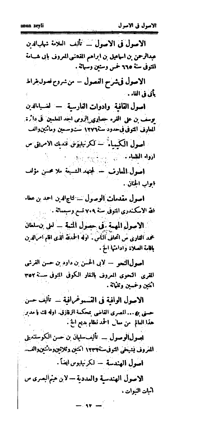 أصول القافية وأدوات الفارسية - لضياء الدين يوسف بن علي القره حصاري الرومي أحد المعلمين في دائرة المعارف المتوفى في حدود سنة 1276 ست وسبعين ومائتين وألف أصول الكيمياء - لكرنيليوس فنديك الآمريقي ص ازواء الظماء.