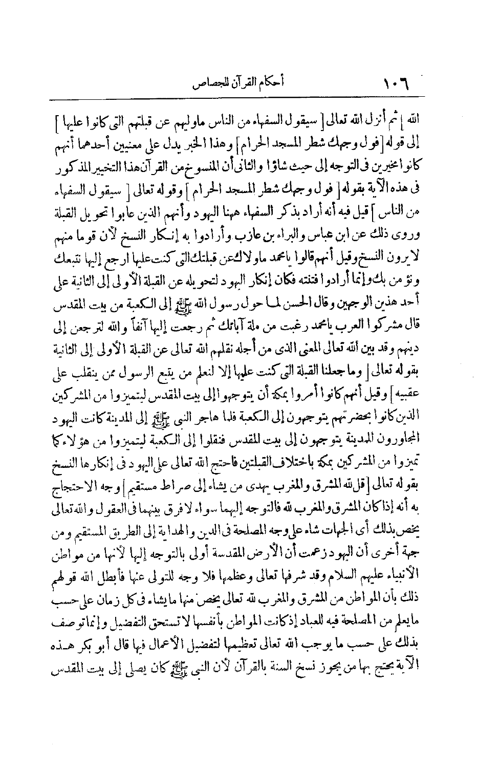 ثُمَّ أَنْزَلَ اللَّهُ تَعَالَى [سَيَقُولُ السُّفَهاءُ مِنَ النَّاسِ مَا وَلَّاهُمْ عَنْ قِبْلَتِهِمُ الَّتِي كانُوا عَلَيْها] إلَى قَوْلِهِ [فَوَلِّ وَجْهَكَ شَطْرَ الْمَسْجِدِ الْحَرامِ] وَهَذَا الْخَبَرُ يَدُلُّ عَلَى مَعْنَيَيْنِ أَحَدُهُمَا أَنَّهُمْ كَانُوا مُخَيَّرِينَ فِي التَّوَجُّهِ إلَى حَيْثُ شَاءُوا وَالثَّانِي أَنَّ الْمَنْسُوخَ مِنْ الْقُرْآنِ هَذَا التَّخْيِيرِ الْمَذْكُورِ فِي هَذِهِ الْآيَةِ بِقَوْلِهِ [فَوَلِّ وَجْهَكَ شَطْرَ الْمَسْجِدِ الْحَرامِ] وقوله تعالى [سَيَقُولُ السُّفَهاءُ مِنَ النَّاسِ] قِيلَ فِيهِ إنَّهُ أَرَادَ بِذِكْرِ السُّفَهَاءِ هَاهُنَا اليهود وأنهم الَّذِينَ عَابُوا تَحْوِيلَ الْقِبْلَةِ وَرُوِيَ ذَلِكَ عَنْ ابْنِ عَبَّاسٍ وَالْبَرَاءِ بْنِ عَازِبٍ وَأَرَادُوا بِهِ إنْكَارَ النَّسْخِ لِأَنَّ قَوْمًا مِنْهُمْ لَا يَرَوْنَ النَّسْخَ وَقِيلَ إنَّهُمْ قَالُوا يَا مُحَمَّدُ مَا وَلَّاك عَنْ قِبْلَتِك الَّتِي كُنْت عَلَيْهَا ارْجِعْ إلَيْهَا نَتَّبِعْك وَنُؤْمِنْ بِك وَإِنَّمَا أَرَادُوا فِتْنَتَهُ فَكَانَ إنْكَارُ الْيَهُودِ لِتَحْوِيلِهِ عَنْ الْقِبْلَةِ الْأُولَى إلَى الثَّانِيَةِ عَلَى أَحَدِ هَذَيْنِ الْوَجْهَيْنِ
