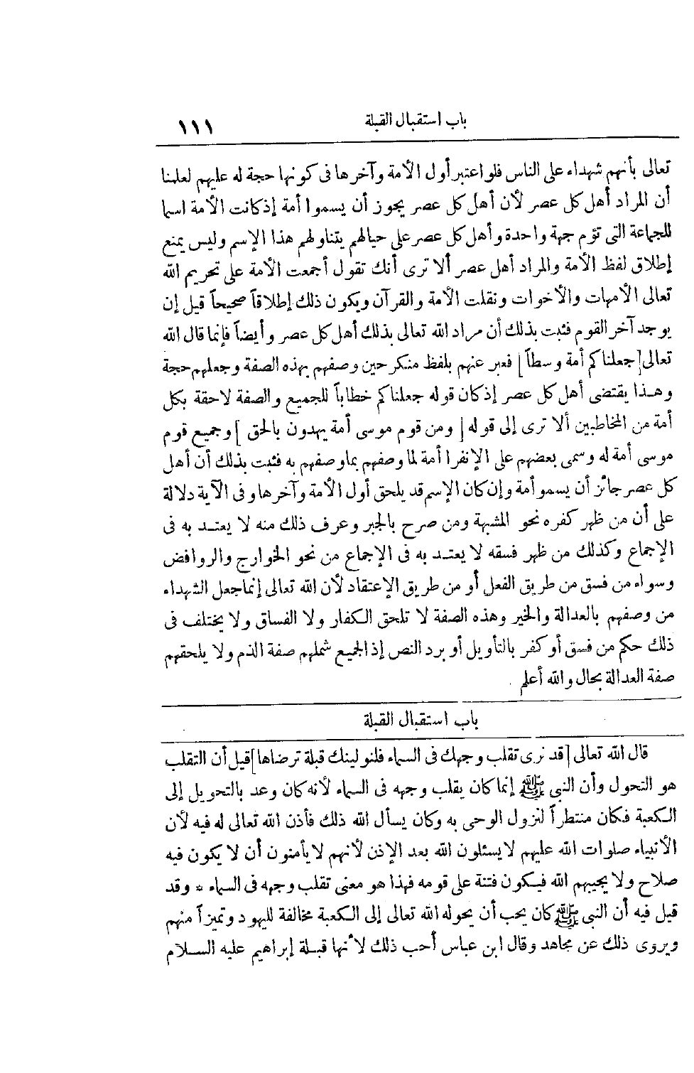 تَعَالَى بِأَنَّهُمْ شُهَدَاءُ عَلَى النَّاسِ فَلَوْ اُعْتُبِرَ أَوَّلُ الْأُمَّةِ وَآخِرُهَا فِي كَوْنِهَا حُجَّةً لَهُ عَلَيْهِمْ لَعَلِمْنَا أَنَّ الْمُرَادَ أَهْلُ كُلِّ عَصْرٍ لِأَنَّ أَهْلَ كُلِّ عَصْرٍ يَجُوزُ أَنْ يُسَمَّوْا أُمَّةً إذْ كَانَتْ الْأُمَّةُ اسْمًا لِلْجَمَاعَةِ الَّتِي تَؤُمُّ جِهَةً وَاحِدَةً وَأَهْلُ كُلِّ عَصْرٍ عَلَى حِيَالِهِمْ يَتَنَاوَلُهُمْ هَذَا الِاسْمُ وَلَيْسَ يَمْنَعُ إطْلَاقَ لَفْظِ الْأُمَّةِ وَالْمُرَادُ أَهْلُ عَصْرٍ أَلَا تَرَى أَنَّك تَقُولُ أَجْمَعَتْ الْأُمَّةِ عَلَى تَحْرِيمِ اللَّهِ تعالى الأمهات والأخوات ونقلت الأمة والقرآن ويكون ذلك إطلاقا صحيحا قيل أَنْ يُوجَدَ آخِرُ الْقَوْمِ فَثَبَتَ بِذَلِكَ أَنَّ مُرَادَ اللَّهِ تَعَالَى بِذَلِكَ أَهْلُ كُلِّ عَصْرٍ وَأَيْضًا فَإِنَّمَا قَالَ اللَّهُ تَعَالَى [جَعَلْناكُمْ أُمَّةً وَسَطاً] فَعَبَّرَ عَنْهُمْ بِلَفْظٍ مُنْكَرٍ حِينَ وَصَفَهُمْ بِهَذِهِ الصِّفَةِ وَجَعْلَهُمْ حُجَّةً وَهَذَا يَقْتَضِي أَهْلَ كُلِّ عصر إذ كان قوله جعلناكم خِطَابًا لِلْجَمِيعِ وَالصِّفَةُ لَاحِقَةٌ بِكُلِّ أُمَّةٍ مِنْ الْمُخَاطَبِينَ أَلَا تَرَى إلَى قَوْلِهِ [وَمِنْ قَوْمِ مُوسى أُمَّةٌ يَهْدُونَ بِالْحَقِ] وَجَمِيعُ قَوْمِ مُوسَى أُمَّةٌ لَهُ وَسَمَّى بَعْضَهُمْ عَلَى الِانْفِرَادِ أُمَّةً لِمَا وَصَفَهُمْ بِمَا وَصَفَهُمْ بِهِ فَثَبَتَ بِذَلِكَ أَنَّ أَهْلَ كُلِّ عَصْرٍ جائز أن يسمو أُمَّةً وَإِنْ كَانَ الِاسْمُ قَدْ يَلْحَقُ أَوَّلَ الْأُمَّةِ وَآخِرَهَا وَفِي الْآيَةِ دَلَالَةٌ عَلَى أَنَّ من ظهر كفره نحو المشبهة وَمَنْ صَرَّحَ بِالْجَبْرِ وَعُرِفَ ذَلِكَ مِنْهُ لَا يُعْتَدُّ بِهِ فِي الْإِجْمَاعِ وَكَذَلِكَ مَنْ ظَهَرَ فِسْقُهُ لَا يُعْتَدُّ بِهِ فِي الْإِجْمَاعِ مِنْ نَحْوِ الْخَوَارِجِ وَالرَّوَافِضِ وَسَوَاءٌ مَنْ فَسَقَ مِنْ طَرِيقِ الْفِعْلِ أَوْ مِنْ طَرِيقِ الِاعْتِقَادِ لِأَنَّ اللَّهَ تَعَالَى إنَّمَا جَعَلَ الشُّهَدَاءَ مَنْ وَصَفَهُمْ بِالْعَدَالَةِ وَالْخَيْرِ وَهَذِهِ الصِّفَةُ لَا تَلْحَقُ الْكُفَّارَ وَلَا الْفُسَّاقَ وَلَا يَخْتَلِفُ فِي ذَلِكَ حُكْمُ مَنْ فَسَقَ أَوْ كَفَرَ بِالتَّأْوِيلِ أَوْ بِرَدِّ النَّصِّ إذْ الْجَمِيعُ شَمِلَهُمْ صِفَةُ الذَّمِّ وَلَا يَلْحَقُهُمْ صِفَةُ الْعَدَالَةِ بِحَالٍ وَاَللَّهُ أَعْلَمُ.