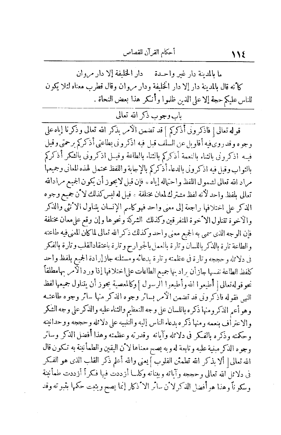 قَوْله تَعَالَى [فَاذْكُرُونِي أَذْكُرْكُمْ] قَدْ تَضَمَّنَ الْأَمْرَ بِذِكْرِ اللَّهِ تَعَالَى وَذِكْرُنَا إيَّاهُ عَلَى وُجُوهٍ وَقَدْ رُوِيَ فِيهِ أَقَاوِيلُ عَنْ السَّلَفِ قِيلَ فِيهِ اُذْكُرُونِي بِطَاعَتِي أَذْكُرْكُمْ بِرَحْمَتِي وَقِيلَ فِيهِ اُذْكُرُونِي بِالثَّنَاءِ بِالنِّعْمَةِ أَذْكُرْكُمْ بِالثَّنَاءِ بِالطَّاعَةِ وَقِيلَ اُذْكُرُونِي بِالشُّكْرِ أَذْكُرْكُمْ بِالثَّوَابِ وَقِيلَ فِيهِ اُذْكُرُونِي بِالدُّعَاءِ أَذْكُرْكُمْ بِالْإِجَابَةِ وَاللَّفْظُ مُحْتَمِلٌ لِهَذِهِ الْمَعَانِي وَجَمِيعُهَا مُرَادُ اللَّهِ تَعَالَى لِشُمُولِ اللَّفْظِ وَاحْتِمَالِهِ إيَّاهُ فَإِنْ قِيلَ لَا يَجُوزُ أَنْ يَكُونَ الْجَمِيعُ مُرَادَ اللَّهِ تَعَالَى بِلَفْظِ وَاحِدٍ لِأَنَّهُ لَفْظٌ مُشْتَرَكٌ لِمَعَانٍ مُخْتَلِفَةٍ قِيلَ لَهُ لَيْسَ كَذَلِكَ لِأَنَّ جَمِيعَ وُجُوهِ الذِّكْرِ عَلَى اخْتِلَافِهَا رَاجِعَةٌ إلَى مَعْنًى وَاحِدٍ فَهُوَ كَاسْمِ الْإِنْسَانِ يَتَنَاوَلُ الْأُنْثَى وَالذَّكَرَ وَالْأُخُوَّةُ تَتَنَاوَلُ الْإِخْوَةَ الْمُتَفَرِّقِينَ وَكَذَلِكَ الشَّرِكَةُ وَنَحْوُهَا وَإِنْ وَقَعَ عَلَى مَعَانٍ مُخْتَلِفَةٍ فَإِنَّ الْوَجْهَ الَّذِي سُمِّيَ بِهِ الْجَمِيعُ مَعْنًى وَاحِدٌ وَكَذَلِكَ ذِكْرُ اللَّهِ تَعَالَى لَمَّا كَانَ الْمَعْنَى فِيهِ طَاعَتَهُ وَالطَّاعَةُ تَارَةً بِالذِّكْرِ بِاللِّسَانِ وَتَارَةً بِالْعَمَلِ بِالْجَوَارِحِ وَتَارَةً بِاعْتِقَادِ الْقَلْبِ وَتَارَةً بِالْفِكْرِ فِي دَلَائِلِهِ وَحُجَجِهِ وَتَارَةً فِي عَظَمَتِهِ وَتَارَةً بِدُعَائِهِ وَمَسْأَلَتِهِ جَازَ إرَادَةُ الْجَمِيعِ بِلَفْظٍ وَاحِدٍ كَلَفْظِ الطَّاعَةِ نَفْسِهَا جَازَ أَنْ يُرَادَ بِهَا جَمِيعُ الطَّاعَاتِ عَلَى اخْتِلَافِهَا إذَا وَرَدَ الْأَمْرُ بِهَا مُطْلَقًا نَحْوُ قَوْله تَعَالَى [أَطِيعُوا اللَّهَ وَأَطِيعُوا الرَّسُولَ] وَكَالْمَعْصِيَةِ يَجُوزُ أَنْ يَتَنَاوَلَ جَمِيعَهَا لَفْظُ النَّهْيِ فقوله فاذكروني قد تضمن الأمر بسائر وجوه الذكر منها سَائِرُ وُجُوهِ طَاعَتِهِ وَهُوَ أَعَمُّ الذِّكْرِ وَمِنْهَا ذِكْرُهُ بِاللِّسَانِ عَلَى وَجْهِ التَّعْظِيمِ وَالثَّنَاءِ عَلَيْهِ وَالذِّكْرِ عَلَى وَجْهِ الشُّكْرِ وَالِاعْتِرَافِ بِنِعَمِهِ وَمِنْهَا ذِكْرُهُ بِدُعَاءِ النَّاسِ إلَيْهِ وَالتَّنْبِيهِ عَلَى دَلَائِلِهِ وَحُجَجِهِ وَوَحْدَانِيِّتِهِ وَحِكْمَتِهِ وَذِكْرُهُ بِالْفِكْرِ فِي دَلَائِلِهِ وَآيَاتِهِ وَقُدْرَتِهِ وَعَظَمَتِهِ وَهَذَا أَفْضَلُ الذِّكْرِ وَسَائِرُ وُجُوهِ الذِّكْرِ مَبْنِيَّةٌ عَلَيْهِ وَتَابِعَةٌ لَهُ وَبِهِ يَصِحُّ مَعْنَاهَا لِأَنَّ الْيَقِينَ وَالطُّمَأْنِينَةَ بِهِ تَكُونُ قَالَ اللَّهُ تَعَالَى [أَلا بِذِكْرِ اللَّهِ تَطْمَئِنُّ الْقُلُوبُ] يَعْنِي وَاَللَّهُ أَعْلَمُ ذِكْرَ الْقَلْبِ الَّذِي هُوَ الْفِكْرُ فِي دَلَائِلِ اللَّهِ تَعَالَى وَحُجَجِهِ وَآيَاتِهِ وَبَيِّنَاتِهِ وَكُلَّمَا ازْدَدْت فِيهَا فِكْرًا ازْدَدْت طُمَأْنِينَةً وَسُكُونًا وَهَذَا هُوَ أَفْضَلُ الذِّكْرِ لِأَنَّ سَائِرَ الْأَذْكَارِ إنَّمَا يَصِحُّ وَيَثْبُتُ حُكْمُهَا بِثُبُوتِهِ