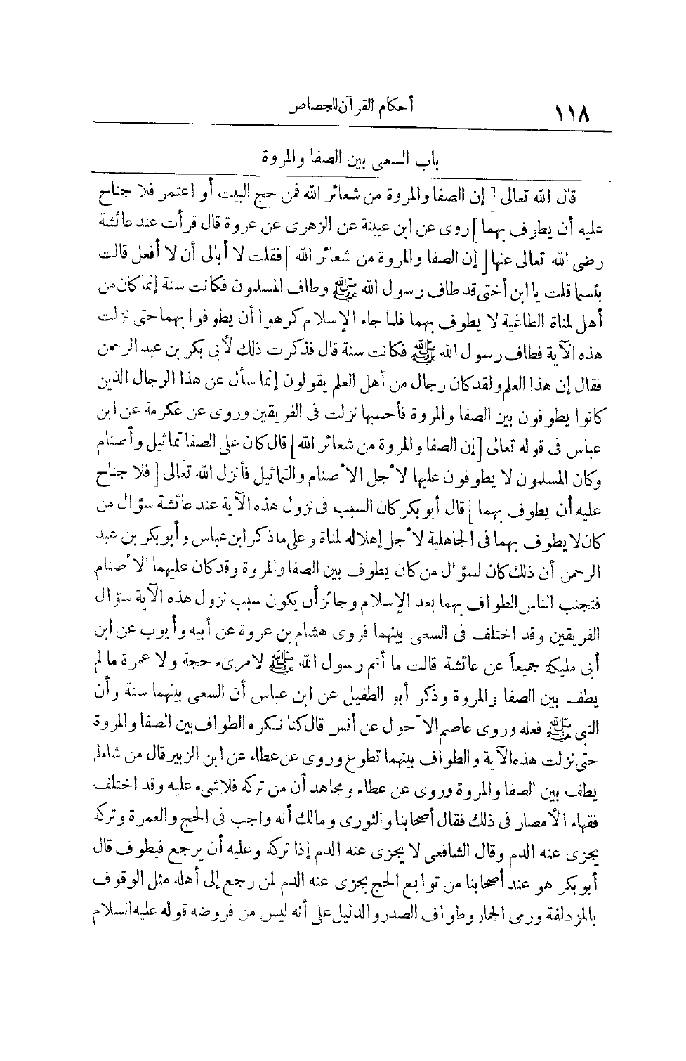 قَالَ فَذَكَرْت ذَلِكَ لِأَبِي بَكْرٍ بْنِ عَبْدِ الرَّحْمَنَ فَقَالَ إنَّ هذا العلم وَلَقَدْ كَانَ رِجَالٌ مِنْ أَهْلِ الْعِلْمِ يَقُولُونَ إنَّمَا سَأَلَ عَنْ هَذَا الرِّجَالُ الَّذِينَ كَانُوا يَطُوفُونَ بَيْنَ الصَّفَا وَالْمَرْوَةِ فَأَحْسَبُهَا نَزَلَتْ فِي الْفَرِيقَيْنِ وَرُوِيَ عَنْ عِكْرِمَةَ عَنْ ابْنِ عَبَّاسٍ فِي قَوْله تَعَالَى [إِنَّ الصَّفا وَالْمَرْوَةَ مِنْ شَعائِرِ اللَّهِ] قَالَ كَانَ عَلَى الصَّفَا تَمَاثِيلُ وَأَصْنَامٌ وَكَانَ الْمُسْلِمُونَ لَا يَطُوفُونَ عَلَيْهَا لِأَجْلِ الْأَصْنَامِ وَالتَّمَاثِيلِ فَأَنْزَلَ اللَّهُ تَعَالَى [فَلا جُناحَ عَلَيْهِ أَنْ يَطَّوَّفَ بِهِما] قَالَ أَبُو بَكْرٍ كَانَ السَّبَبُ فِي نُزُولِ هَذِهِ الْآيَةِ عِنْدَ عَائِشَةَ سُؤَالُ مَنْ كَانَ لَا يَطُوفُ بِهِمَا فِي الْجَاهِلِيَّةِ لِأَجْلِ إهْلَالِهِ لِمَنَاةَ وَعَلَى مَا ذَكَرَ ابْنُ عَبَّاسٍ وَأَبُو بَكْرِ بْنُ عَبْدِ الرَّحْمَنِ أَنَّ ذَلِكَ كَانَ لِسُؤَالِ مَنْ كَانَ يَطُوفُ بَيْنَ الصَّفَا وَالْمَرْوَةِ وَقَدْ كَانَ عَلَيْهِمَا الْأَصْنَامُ فَتَجَنَّبَ النَّاسُ الطَّوَافَ بِهِمَا بَعْدَ الْإِسْلَامِ وَجَائِزٌ أَنْ يَكُونَ سَبَبُ نُزُولِ هَذِهِ الْآيَةِ سُؤَالَ الْفَرِيقَيْنِ وَقَدْ اُخْتُلِفَ فِي السَّعْيِ بَيْنَهُمَا
