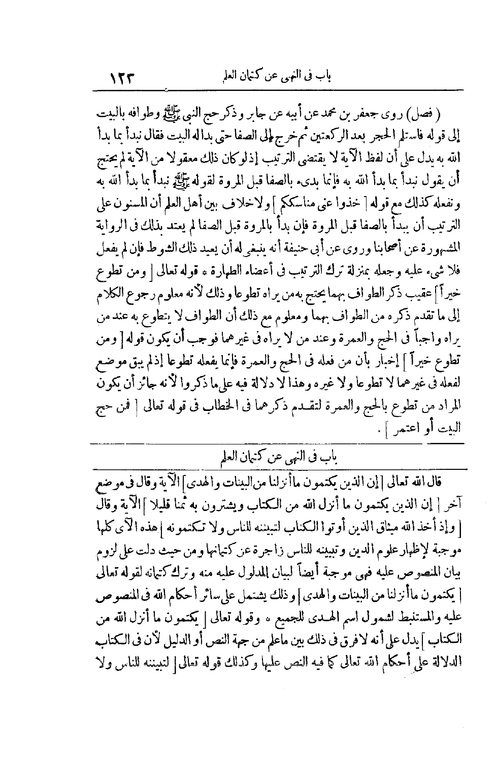 قَالَ اللَّهُ تَعَالَى [إِنَّ الَّذِينَ يَكْتُمُونَ مَا أَنْزَلْنا مِنَ الْبَيِّناتِ وَالْهُدى] الْآيَةَ وَقَالَ فِي مَوْضِعٍ آخَرَ [إِنَّ الَّذِينَ يَكْتُمُونَ مَا أَنْزَلَ اللَّهُ مِنَ الْكِتابِ وَيَشْتَرُونَ بِهِ ثَمَناً قَلِيلًا] الْآيَةَ وَقَالَ [وَإِذْ أَخَذَ اللَّهُ مِيثاقَ الَّذِينَ أُوتُوا الْكِتابَ لَتُبَيِّنُنَّهُ لِلنَّاسِ وَلا تَكْتُمُونَهُ] هَذِهِ الْآيُ كُلُّهَا مُوجِبَةٌ لِإِظْهَارِ عُلُومِ الدِّينِ وَتَبْيِينِهِ لِلنَّاسِ زَاجِرَةٌ عَنْ كِتْمَانِهَا وَمِنْ حَيْثُ دَلَّتْ عَلَى لُزُومِ بَيَانِ الْمَنْصُوصِ عَلَيْهِ فَهِيَ مُوجِبَةٌ أَيْضًا لِبَيَانِ الْمَدْلُولِ عَلَيْهِ مِنْهُ وَتَرْكِ كِتْمَانِهِ لِقَوْلِهِ تَعَالَى [يَكْتُمُونَ مَا أَنْزَلْنا مِنَ الْبَيِّناتِ وَالْهُدى] وَذَلِكَ يَشْتَمِلُ عَلَى سَائِرِ أَحْكَامِ اللَّهِ فِي الْمَنْصُوصِ عَلَيْهِ وَالْمُسْتَنْبَطِ لِشُمُولِ اسْمِ الْهُدَى لِلْجَمِيعِ وقَوْله تَعَالَى [يَكْتُمُونَ مَا أَنْزَلَ اللَّهُ مِنَ الْكِتابِ] يَدُلُّ عَلَى أَنَّهُ لَا فَرْقَ فِي ذَلِكَ بَيْنَ مَا عُلِمَ مِنْ جِهَةِ النَّصِّ أَوْ الدَّلِيلِ لِأَنَّ فِي الْكِتَابِ الدَّلَالَةَ عَلَى أَحْكَامِ اللَّهِ تَعَالَى كَمَا فِيهِ النَّصُّ عَلَيْهَا وَكَذَلِكَ قوله تعالى [لَتُبَيِّنُنَّهُ لِلنَّاسِ وَلا تَكْتُمُونَهُ]