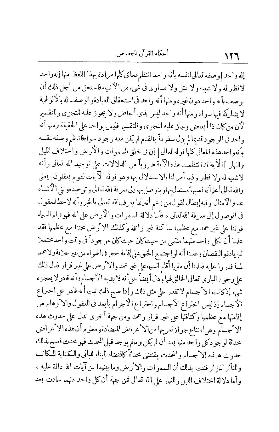 قَوْله تَعَالَى [إِنَّ فِي خَلْقِ السَّماواتِ وَالْأَرْضِ وَاخْتِلافِ اللَّيْلِ وَالنَّهارِ] الْآيَة قَدْ انْتَظَمَتْ هَذِهِ الْآيَةُ ضُرُوبًا مِنْ الدَّلَالَات عَلَى تَوْحِيدِ اللَّهِ تَعَالَى وَأَنَّهُ لَا شَبِيهَ لَهُ وَلَا نَظِيرَ وَفِيهَا أَمْرٌ لَنَا بِالِاسْتِدْلَالِ بِهَا وَهُوَ قَوْلُهُ [لَآياتٍ لِقَوْمٍ يَعْقِلُونَ] يَعْنِي وَاَللَّهُ تَعَالَى أَعْلَمُ أَنَّهُ نَصَبَهَا لِيَسْتَدِلّ بِهَا وَيَتَوَصَّلَ بِهَا إلَى مَعْرِفَةِ اللَّهِ تَعَالَى وَتَوْحِيدِهِ وَنَفْيِ الْأَشْبَاهِ عَنْهُ وَالْأَمْثَالِ وَفِيهِ إبْطَالٌ لِقَوْلِ مَنْ زَعَمَ أَنَّهُ إنَّمَا يُعْرَفُ اللَّهُ تَعَالَى بِالْخَبَرِ وَأَنَّهُ لَا حَظَّ لِلْعُقُولِ فِي الْوُصُولِ إلَى مَعْرِفَةِ اللَّه تَعَالَى فَأَمَّا دَلَالَةُ السَّمَوَات وَالْأَرْضِ عَلَى اللَّهِ فَهُوَ قِيَامُ السَّمَاءِ فَوْقنَا عَلَى غَيْرِ عَمْد مَعَ عَظْمهَا سَاكِنَةً غَيْرَ زَائِلَةٍ وَكَذَلِكَ الْأَرْض تَحْتَنَا مَعَ عَظْمِهَا فَقَدْ عَلِمْنَا أَنَّ لِكُلِّ وَاحِدٍ مِنْهُمَا مُنْتَهَى من حيث كان حَيْثُ كَانَ مَوْجُودًا فِي وَقْتٍ وَاحِدٍ مُحْتَمِلًا لِلزِّيَادَةِ وَالنُّقْصَانِ وَعَلِمْنَا أَنَّهُ لَوْ اجْتَمَعَ الْخَلْقُ عَلَى إقَامَةِ حَجَرٍ فِي الْهَوَاءِ مِنْ غَيْرِ عَلَاقَةٍ وَلَا عَمْد لَمَا قَدَرُوا عَلَيْهِ فَعَلِمْنَا أَنَّ مُقِيمَا أَقَامَ السَّمَاءَ عَلَى غَيْرِ عَمْد وَالْأَرْضَ عَلَى غَيْرِ قَرَارٍ فَدَلَّ ذَلِكَ عَلَى وُجُودِ الْبَارِي تَعَالَى الْخَالِقِ لَهُمَا وَدَلَّ أَيْضًا عَلَى أَنَّهُ لَا يُشْبِهُ الْأَجْسَامَ وَأَنَّهُ قَادِرٌ لَا يَعْجِزُهُ شَيْءٌ إذْ كَانَتْ الْأَجْسَامُ لَا تَقْدِرُ عَلَى مِثْلِ ذَلِكَ وَإِذَا صَحَّ ذَلِكَ ثَبَتَ أَنَّهُ قَادِرٌ عَلَى اخْتِرَاعِ الْأَجْسَامِ إذْ لَيْسَ اخْتِرَاعُ الْأَجْسَامِ وَاخْتِرَاعُ الْأَجْرَامِ بِأَبْعَد فِي الْعُقُولِ وَالْأَوْهَامِ مِنْ إقَامَتهَا مَعَ عَظْمهَا وَكَثَافَتِهَا عَلَى غَيْرِ قَرَار وَعَمَدٍ وَمِنْ جِهَةٍ أُخْرَى تَدُلّ عَلَى حُدُوثِ هَذِهِ الْأَجْسَامِ وَهِيَ امْتِنَاعُ جَوَازِ تَعَرِّيهَا مِنْ الْأَعْرَاضِ الْمُتَضَادَّةِ وَمَعْلُومٌ أَنَّ هَذِهِ الْأَعْرَاض مُحْدَثَةٌ لِوُجُودِ كُلِّ وَاحِد مِنْهَا بَعْد أَنَّ لَمْ يَكُنْ وَمَا لَمْ يُوجَدْ قَبْلَ الْمُحْدَثِ فَهُوَ مُحْدَثٌ فَصَحَّ بِذَلِكَ حُدُوثُ هَذِهِ الْأَجْسَامِ وَالْمُحْدَثُ يَقْتَضِي مُحَدِّثًا كَاقْتِضَاءِ الْبِنَاءِ للبانى والكتابة للكاتب والتأثر لِلْمُؤَثَّرِ فَثَبَتَ بِذَلِكَ أَنَّ السَّمَوَات وَالْأَرْضِ وَمَا بَيْنَهُمَا مِنْ آيَات اللَّهِ دَالَّةٌ عَلَيْهِ وَأَمَّا دَلَالَةُ اخْتِلَافِ اللَّيْلِ وَالنَّهَارِ عَلَى اللَّهِ تَعَالَى فَمِنْ جِهَةٍ أَنَّ كُلِّ وَاحِدٍ مِنْهُمَا حَادِثٌ بعد