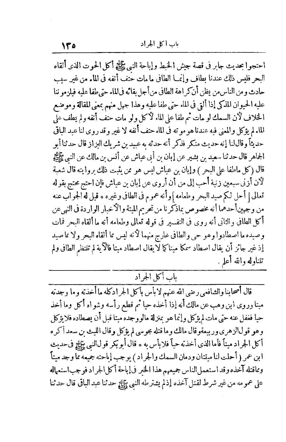 يُوجِبُ إبَاحَتَهُ جَمِيعَهُ مِمَّا وُجِدَ مَيِّتًا وَمِمَّا قَتَلَهُ آخِذُهُ وَقَدْ اسْتَعْمَلَ النَّاسُ جَمِيعُهُمْ هَذَا الْخَبَرَ فِي إبَاحَةِ أَكْلِ الْجَرَادِ فَوَجَبَ اسْتِعْمَالُهُ عَلَى عُمُومِهِ مِنْ غَيْرِ شَرْطٍ لِقَتْلِ آخِذِهِ إذْ لَمْ يَشْتَرِطْهُ النَّبِيُّ صَلَّى اللَّهُ عَلَيْهِ وَسَلَّمَ