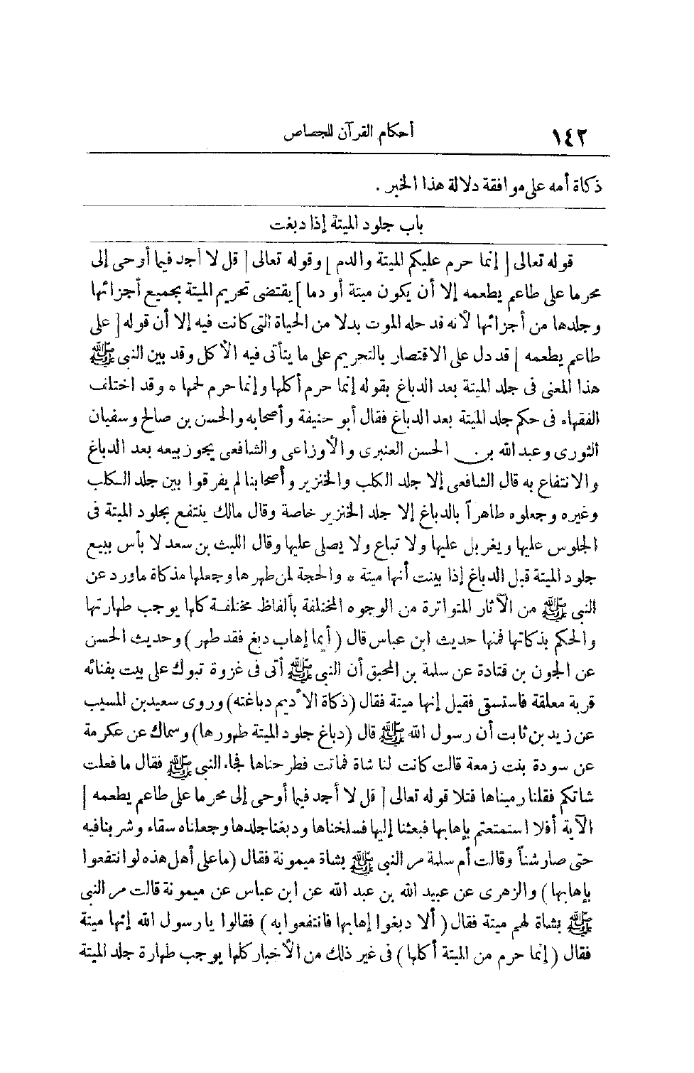 قَوْله تَعَالَى [إِنَّما حَرَّمَ عَلَيْكُمُ الْمَيْتَةَ وَالدَّمَ] وقَوْله تَعَالَى [قُلْ لا أَجِدُ فِي مَا أُوحِيَ إِلَيَّ مُحَرَّماً عَلى طاعِمٍ يَطْعَمُهُ إِلَّا أَنْ يَكُونَ مَيْتَةً أَوْ دَماً] يَقْتَضِي تَحْرِيمَ الْمَيْتَةِ بِجَمِيعِ أَجْزَائِهَا وَجِلْدُهَا مِنْ أَجْزَائِهَا لِأَنَّهُ قَدْ حَلَّهُ الْمَوْتُ بَدَلًا مِنْ الْحَيَاةِ الَّتِي كَانَتْ فِيهِ إلَّا أَنَّ قَوْلَهُ [عَلى طاعِمٍ يَطْعَمُهُ] قَدْ دَلَّ عَلَى الِاقْتِصَارِ بِالتَّحْرِيمِ عَلَى مَا يتأتى فيه الأكل وَقَدْ بَيَّنَ النَّبِيُّ صَلَّى اللَّهُ عَلَيْهِ وَسَلَّمَ هَذَا الْمَعْنَى فِي جِلْدِ الْمَيْتَةِ بَعْدَ الدِّبَاغِ