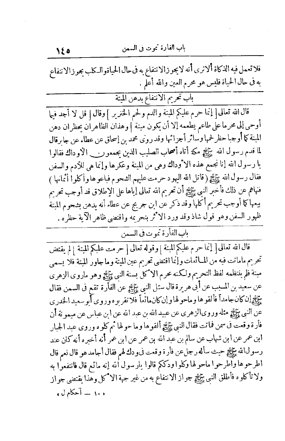 قَالَ اللَّهُ تَعَالَى [إِنَّما حَرَّمَ عَلَيْكُمُ الْمَيْتَةَ وَالدَّمَ وَلَحْمَ الْخِنْزِيرِ] وَقَالَ [قُلْ لا أَجِدُ فِي مَا أُوحِيَ إِلَيَّ مُحَرَّماً عَلى طاعِمٍ يَطْعَمُهُ إِلَّا أَنْ يَكُونَ مَيْتَةً] وَهَذَانِ الظَّاهِرَانِ يَحْظُرَانِ دُهْنَ الْمَيْتَةِ كَمَا أَوْجَبَا حَظْرَ لَحْمِهَا وَسَائِرِ أَجْزَائِهَا
