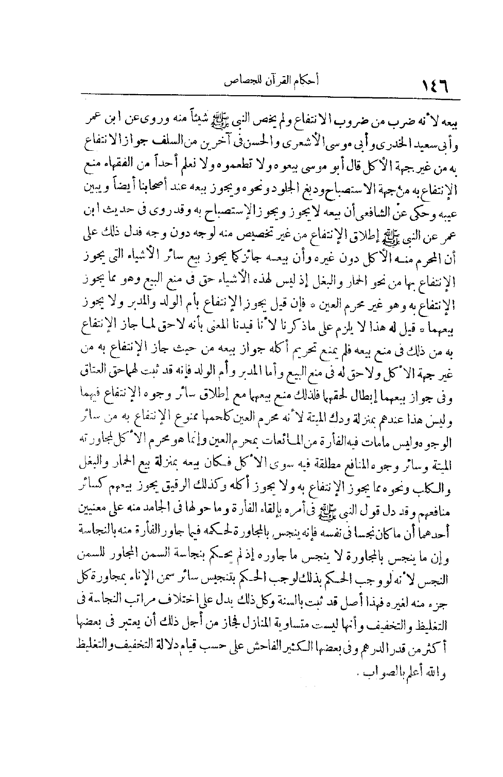بَيْعِهِ لِأَنَّهُ ضَرْبٌ مِنْ ضُرُوبِ الِانْتِفَاعِ وَلَمْ يَخُصَّ النَّبِيُّ صَلَّى اللَّهُ عَلَيْهِ وَسَلَّمَ شَيْئًا مِنْهُ وَرُوِيَ عَنْ ابْنِ عُمَرَ وَأَبِي سَعِيدٍ الْخُدْرِيِّ وَأَبِي مُوسَى الْأَشْعَرِيِّ وَالْحَسَنِ فِي آخَرِينَ مِنْ السَّلَف جَوَازُ الِانْتِفَاعِ بِهِ مِنْ غَيْرِ جِهَةِ الْأَكْلِ قَالَ أَبُو مُوسَى بِيعُوهُ وَلَا تَطْعَمُوهُ وَلَا نَعْلَمُ أَحَدًا مِنْ الْفُقَهَاءِ مَنَعَ الِانْتِفَاعَ بِهِ مِنْ جِهَةِ الِاسْتِصْبَاحِ وَدَبْغِ الْجُلُودِ وَنَحْوِهِ وَيَجُوزُ بَيْعُهُ عِنْدَ أَصْحَابِنَا أَيْضًا وَيُبَيَّنُ عَيْبُهُ وَحُكِيَ عَنْ الشَّافِعِيِّ أَنَّ بَيْعَهُ لَا يَجُوزُ وَيَجُوزُ الِاسْتِصْبَاحُ بِهِ وَقَدْ رُوِيَ فِي حَدِيثُ ابْنِ عُمَرَ عَنْ النَّبِيِّ صَلَّى اللَّهُ عَلَيْهِ وَسَلَّمَ إطْلَاقُ الِانْتِفَاعِ مِنْ غَيْرِ تَخْصِيصٍ مِنْهُ لِوَجْهٍ دُونَ وَجْهٍ فَدَلَّ ذَلِكَ عَلَى أَنَّ الْمُحَرَّمَ مِنْهُ الْأَكْلُ دُونَ غَيْرِهِ وَأَنَّ بَيْعَهُ جَائِزٌ كَمَا يَجُوزُ بَيْعُ سَائِرَ الْأَشْيَاءِ الَّتِي يَجُوزُ الِانْتِفَاعُ بِهَا مِنْ نَحْوِ الْحِمَارِ وَالْبَغْلِ إذْ لَيْسَ لِهَذِهِ الْأَشْيَاءِ حَقٌّ فِي مَنْعِ الْبَيْعِ وَهُوَ مِمَّا يَجُوزُ الِانْتِفَاعُ بِهِ وَهُوَ غَيْرُ مُحَرَّمِ الْعَيْنِ فَإِنْ قِيلَ يَجُوزُ الِانْتِفَاعُ بِأُمِّ الْوَلَدِ وَالْمُدَبَّرِ وَلَا يَجُوزُ بَيْعُهُمَا قِيلَ لَهُ هَذَا لَا يَلْزَمُ عَلَى مَا ذَكَرْنَا لِأَنَّا قَيَّدْنَا الْمَعْنَى بِأَنَّهُ لَا حَقَّ لِمَا جَازَ الِانْتِفَاعُ بِهِ مِنْ ذَلِكَ فِي مَنْعِ بَيْعِهِ فَلَمْ يَمْنَعْ تَحْرِيمُ أَكْلِهِ جَوَازَ بَيْعِهِ مِنْ حَيْثُ جَازَ الِانْتِفَاعُ بِهِ مِنْ غَيْرِ جِهَةِ الْأَكْلِ وَلَا حَقَّ لَهُ فِي مَنْعِ الْبَيْعِ وَأَمَّا الْمُدَبَّرُ وَأُمُّ الْوَلَدِ فَإِنَّهُ قَدْ ثَبَتَ لَهُمَا حَقُّ الْعَتَاقِ وَفِي جَوَازِ بَيْعِهِمَا إبْطَالٍ لِحَقِّهِمَا فَلِذَلِكَ مُنِعَ بَيْعُهُمَا مَعَ إطْلَاقِ سَائِر وُجُوهِ الِانْتِفَاعِ فِيهِمَا وَلَيْسَ هَذَا عِنْدَهُمْ بِمَنْزِلَةِ وَدَكِ الْمَيْتَةِ لِأَنَّهُ مُحَرَّمُ الْعَيْنِ كَلَحْمِهَا مَمْنُوعٍ الِانْتِفَاعُ بِهِ مِنْ سَائِرِ الْوُجُوهِ وَلَيْسَ مَا مَاتَ فِيهِ الْفَأْرَةُ مِنْ الْمَائِعَاتِ بِمُحَرَّمِ الْعَيْنِ وَإِنَّمَا هُوَ مُحَرَّمُ الْأَكْلِ لِمُجَاوَرَتِهِ الْمَيْتَةَ وَسَائِرُ وُجُوهِ الْمَنَافِعِ مُطْلَقَةٌ فِيهِ سِوَى الْأَكْلِ فَكَانَ بَيْعُهُ بِمَنْزِلَةِ بَيْعِ الْحِمَارِ وَالْبَغْلِ وَالْكَلْبِ وَنَحْوِهِ مِمَّا يَجُوزُ الِانْتِفَاعِ بِهِ وَلَا يَجُوزُ أَكْلُهُ وَكَذَلِكَ الرَّقِيقُ يَجُوزُ بَيْعُهُمْ كَسَائِرِ مَنَافِعِهِمْ وَقَدْ دَلَّ