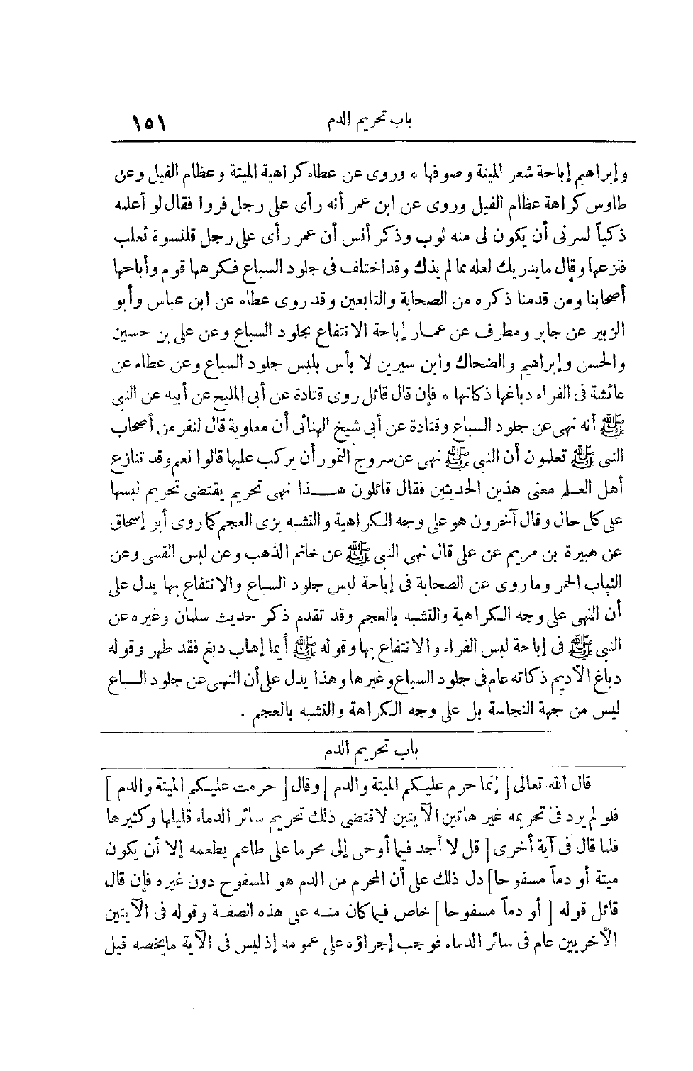 قَالَ اللَّهُ تَعَالَى [إِنَّما حَرَّمَ عَلَيْكُمُ الْمَيْتَةَ وَالدَّمَ] وقال [حُرِّمَتْ عَلَيْكُمُ الْمَيْتَةُ وَالدَّمُ] فَلَوْ لَمْ يَرِدْ فِي تَحْرِيمِهِ غَيْرُ هَاتَيْنِ الْآيَتَيْنِ لَاقْتَضَى ذَلِكَ تَحْرِيمَ سَائِرِ الدِّمَاءِ قَلِيلِهَا وَكَثِيرِهَا فَلَمَّا قَالَ فِي آيَةٍ أُخْرَى [قُلْ لا أَجِدُ فِي مَا أُوحِيَ إِلَيَّ مُحَرَّماً عَلى طاعِمٍ يَطْعَمُهُ إِلَّا أَنْ يَكُونَ مَيْتَةً أَوْ دَماً مَسْفُوحاً] دَلَّ ذَلِكَ عَلَى أَنَّ الْمُحَرَّمَ مِنْ الدَّمِ هُوَ الْمَسْفُوحُ دُونَ غَيْرِهِ فَإِنْ قَالَ قَائِلٌ قوله [أَوْ دَماً مَسْفُوحاً] خَاصٌّ فِيمَا كَانَ مِنْهُ عَلَى هَذِهِ الصِّفَةِ وَقَوْلُهُ فِي الْآيَتَيْنِ الْأُخْرَيَيْنِ عَامٌّ فِي سَائِرِ الدِّمَاءِ فَوَجَبَ إجْرَاؤُهُ عَلَى عُمُومِهِ إذْ لَيْسَ فِي الْآيَةِ مَا يَخُصُّهُ قِيلَ
