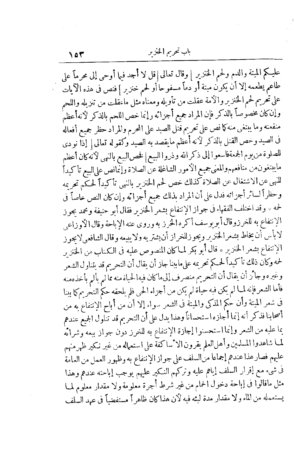 وَقَالَ تَعَالَى [قُلْ لا أَجِدُ فِي مَا أُوحِيَ إِلَيَّ مُحَرَّماً عَلى طاعِمٍ يَطْعَمُهُ إِلَّا أَنْ يَكُونَ مَيْتَةً أَوْ دَماً مَسْفُوحاً أَوْ لَحْمَ خِنزِيرٍ] فَنَصَّ فِي هَذِهِ الْآيَاتِ عَلَى تَحْرِيمِ لَحْمِ الْخِنْزِيرِ وَالْأُمَّةُ عَقَلَتْ مِنْ تَأْوِيلِهِ وَمَعْنَاهُ مِثْلَ مَا عَقَلَتْ مِنْ تَنْزِيلِهِ وَاللَّحْمُ وَإِنْ كَانَ مَخْصُوصًا بِالذِّكْرِ فَإِنَّ الْمُرَادَ جَمِيعُ أَجْزَائِهِ وَإِنَّمَا خَصَّ اللَّحْمَ بِالذِّكْرِ لِأَنَّهُ أَعْظَمُ مَنْفَعَتِهِ وَمَا يُبْتَغَى مِنْهُ كَمَا نَصَّ عَلَى تَحْرِيمِ قَتْلِ الصَّيْدِ عَلَى الْمُحْرِمِ وَالْمُرَادُ حَظْرُ جَمِيعِ أَفْعَالِهِ فِي الصَّيْدِ وَخَصَّ الْقَتْلَ بِالذِّكْرِ لِأَنَّهُ أَعْظَمُ مَا يُقْصَدُ بِهِ الصَّيْدُ وَكَقَوْلِهِ تَعَالَى [إِذا نُودِيَ لِلصَّلاةِ مِنْ يَوْمِ الْجُمُعَةِ فَاسْعَوْا إِلى ذِكْرِ اللَّهِ وَذَرُوا الْبَيْعَ] فَخَصَّ الْبَيْعَ بِالنَّهْيِ لِأَنَّهُ كَانَ أَعْظَمَ مَا يَبْتَغُونَ مِنْ مَنَافِعِهِمْ وَالْمَعْنِيُّ جَمِيعُ الْأُمُورِ الشَّاغِلَةِ عَنْ الصَّلَاةِ وَإِنَّمَا نَصَّ عَلَى الْبَيْعِ تَأْكِيدًا لِلنَّهْيِ عَنْ الِاشْتِغَالِ عَنْ الصَّلَاةِ كَذَلِكَ خَصَّ لَحْمَ الْخِنْزِيرِ بِالنَّهْيِ تَأْكِيدًا لِحُكْمِ تَحْرِيمِهِ وَحَظْرًا لِسَائِرِ أَجْزَائِهِ فَدَلَّ عَلَى أَنَّ الْمُرَادَ بِذَلِكَ جَمِيعُ أَجْزَائِهِ وَإِنْ كَانَ النَّصُّ خَاصًّا فِي لَحْمِهِ وَقَدْ اخْتَلَفَ الْفُقَهَاءُ فِي جَوَازِ الِانْتِفَاعِ بِشَعْرِ الْخِنْزِيرِ فَقَالَ أَبُو حَنِيفَةَ وَمُحَمَّدٌ يَجُوزُ الانتفاع به لِلْخَرَزِ وَقَالَ أَبُو يُوسُفَ أَكْرَهُ الْخَرَزَ بِهِ وَرُوِيَ عَنْهُ الْإِبَاحَةُ وَقَالَ الْأَوْزَاعِيُّ لَا بَأْسَ أَنْ يُخَاطَ بِشَعْرِ الْخِنْزِيرِ وَيَجُوزُ لِلْخَرَّازِ أَنْ يَشْتَرِيَهُ وَلَا يَبِيعَهُ وَقَالَ الشَّافِعِيُّ لَا يَجُوزُ الِانْتِفَاعُ بِشَعْرِ الْخِنْزِيرِ قَالَ أَبُو بَكْرٍ لَمَّا كَانَ الْمَنْصُوصُ عَلَيْهِ فِي الْكِتَابِ مِنْ الْخِنْزِيرِ لَحْمَهُ وَكَانَ ذَلِكَ تَأْكِيدًا لِحُكْمِ تَحْرِيمِهِ عَلَى مَا بَيَّنَّا جَازَ أَنْ يُقَالَ إنَّ التَّحْرِيمَ قَدْ يَتَنَاوَلُ الشَّعْرَ وَغَيْرَهُ وَجَائِزٌ أَنْ يُقَالَ إنَّ التَّحْرِيمَ مُنْصَرِفٌ إلَى مَا كَانَ فِيهِ الْحَيَاةُ مِنْهُ مِمَّا لَمْ يَأْلَمْ بِأَخْذِهِ مِنْهُ فَأَمَّا الشَّعْرُ فَإِنَّهُ لَمَّا لَمْ يَكُنْ فِيهِ حَيَاةٌ لَمْ يَكُنْ مِنْ أَجْزَاءِ الْحَيِّ فَلَمْ يَلْحَقْهُ حُكْمُ التَّحْرِيمِ كَمَا بَيَّنَّا فِي شَعْرِ الْمَيْتَةِ وَأَنَّ حُكْمَ الْمُذَكَّى وَالْمَيْتَةِ فِي الشَّعْرِ سَوَاءٌ إلَّا أَنَّ مَنْ أَبَاحَ الِانْتِفَاعَ بِهِ مِنْ أَصْحَابِنَا فَذَكَرَ أَنَّهُ إنَّمَا أَجَازَهُ اسْتِحْسَانًا وَهَذَا يَدُلُّ عَلَى أَنَّ التَّحْرِيمَ قَدْ تَنَاوَلَ الْجَمِيعَ عِنْدَهُمْ بِمَا عَلَيْهِ مِنْ الشَّعْرِ وَإِنَّمَا اسْتَحْسَنُوا إجَازَةَ الِانْتِفَاعِ بِهِ لِلْخَرَزِ دُونَ جَوَازِ بَيْعِهِ وَشِرَائِهِ لَمَّا شَاهَدُوا الْمُسْلِمِينَ وَأَهْلَ الْعِلْمِ يُقِرُّونَ الْأَسَاكِفَةَ عَلَى اسْتِعْمَالِهِ مِنْ غَيْرِ نَكِيرٍ ظَهَرَ مِنْهُمْ عَلَيْهِمْ فَصَارَ هَذَا عِنْدَهُمْ إجْمَاعًا مِنْ السَّلَفِ عَلَى جَوَازِ الِانْتِفَاعِ بِهِ وَظُهُورُ الْعَمَلِ مِنْ الْعَامَّةِ فِي شَيْءٍ مَعَ إقْرَارِ السَّلَفِ إيَّاهُمْ عَلَيْهِ وَتَرْكِهِمْ النَّكِيرَ عَلَيْهِمْ يُوجِبُ إبَاحَتَهُ عِنْدَهُمْ وَهَذَا مِثْلُ مَا قَالُوا فِي إبَاحَةِ دُخُولِ الْحَمَّامِ مِنْ غَيْرِ شَرْطِ أُجْرَةٍ مَعْلُومَةٍ وَلَا مِقْدَارٍ مَعْلُومٍ لِمَا يَسْتَعْمِلُهُ مِنْ الْمَاءِ وَلَا مِقْدَارِ مُدَّةِ لُبْث