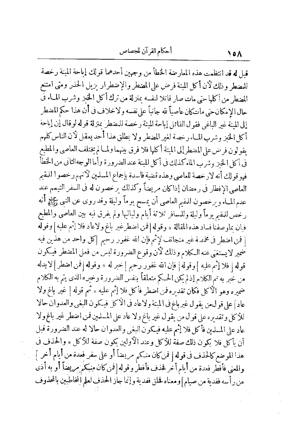 وَلَمْ يُفَرِّقْ فِيهِ بَيْنَ الْعَاصِي وَالْمُطِيعِ فَبَانَ بِمَا وَصَفْنَا فَسَادُ هَذِهِ الْمَقَالَةِ وَقَوْلُهُ [فَمَنِ اضْطُرَّ غَيْرَ باغٍ وَلا عادٍ فَلا إِثْمَ عَلَيْهِ] وَقَوْلُهُ [فَمَنِ اضْطُرَّ فِي مَخْمَصَةٍ غَيْرَ مُتَجانِفٍ لِإِثْمٍ فَإِنَّ اللَّهَ غَفُورٌ رَحِيمٌ] كُلُّ وَاحِدٍ مِنْ هَذَيْنِ فِيهِ ضَمِيرٌ لَا يَسْتَغْنِي عَنْهُ الْكَلَامُ وَذَلِكَ لِأَنَّ وُقُوعَ الضَّرُورَةِ لَيْسَ مِنْ فِعْلِ الْمُضْطَرِّ فَيَكُونُ قَوْلُهُ [فَلا إِثْمَ عَلَيْهِ] وقوله [فَإِنَّ اللَّهَ غَفُورٌ رَحِيمٌ] خبر له وقوله [فَمَنِ اضْطُرَّ] لا بدله من خبر به تم الْكَلَامُ إذْ لَمْ يَكُنِ الْحُكْمُ مُتَعَلِّقًا بِنَفْسِ الضَّرُورَة وَخَبَرُهُ الَّذِي يَتِمُّ بِهِ الْكَلَامُ ضَمِيرُهُ وَهُوَ الْأَكْلُ فَكَأَنَّ تَقْدِيرَهُ فَمَنْ اُضْطُرَّ فَأَكَلَ فَلَا إثْمَ عَلَيْهِ ثُمَّ قَوْلُهُ [غَيْرَ باغٍ وَلا عادٍ] على قول من يقول غير باغ في الميتة ولا عاد فِي الْأَكْلِ فَيَكُونُ الْبَغْيُ وَالْعُدْوَانُ حَالًا لِلْأَكْلِ وَتَقْدِيرُهُ عَلَى قَوْلِ مَنْ يَقُولُ غَيْرَ بَاغٍ ولا عاد عَلَى الْمُسْلِمِينَ فَمَنْ اُضْطُرَّ غَيْرَ بَاغٍ وَلَا عَادٍ عَلَى الْمُسْلِمِينَ فَأَكَلَ فَلَا إثْمَ عَلَيْهِ فَيَكُونُ الْبَغْيُ وَالْعُدْوَانُ حَالًا لَهُ عِنْدَ الضَّرُورَة قَبْلَ أَنْ يَأْكُلَ فَلَا يَكُونُ ذَلِكَ صِفَةً لِلْأَكْلِ وَعِنْدَ الْأَوَّلِينَ يَكُونُ صِفَةً لِلْأَكْلِ وَالْحَذْفُ فِي هَذَا الْمَوْضِعِ كَالْحَذْفِ فِي قَوْلِهِ [فَمَنْ كانَ مِنْكُمْ مَرِيضاً أَوْ عَلى سَفَرٍ فَعِدَّةٌ مِنْ أَيَّامٍ أُخَرَ] وَالْمَعْنَى فَأَفْطَرَ فَعِدَّةٌ مِنْ أَيَّامٍ أُخَرَ فَحَذَفَ فَأَفْطَرَ وَقَوْلُهُ [فَمَنْ كانَ مِنْكُمْ مَرِيضاً أَوْ بِهِ أَذىً مِنْ رَأْسِهِ فَفِدْيَةٌ مِنْ صِيامٍ] وَمَعْنَاهُ فَحَلَقَ فَفِدْيَةٌ وَإِنَّمَا جَازَ الْحَذْفُ لِعِلْمِ المخاطبين بالمحذوف