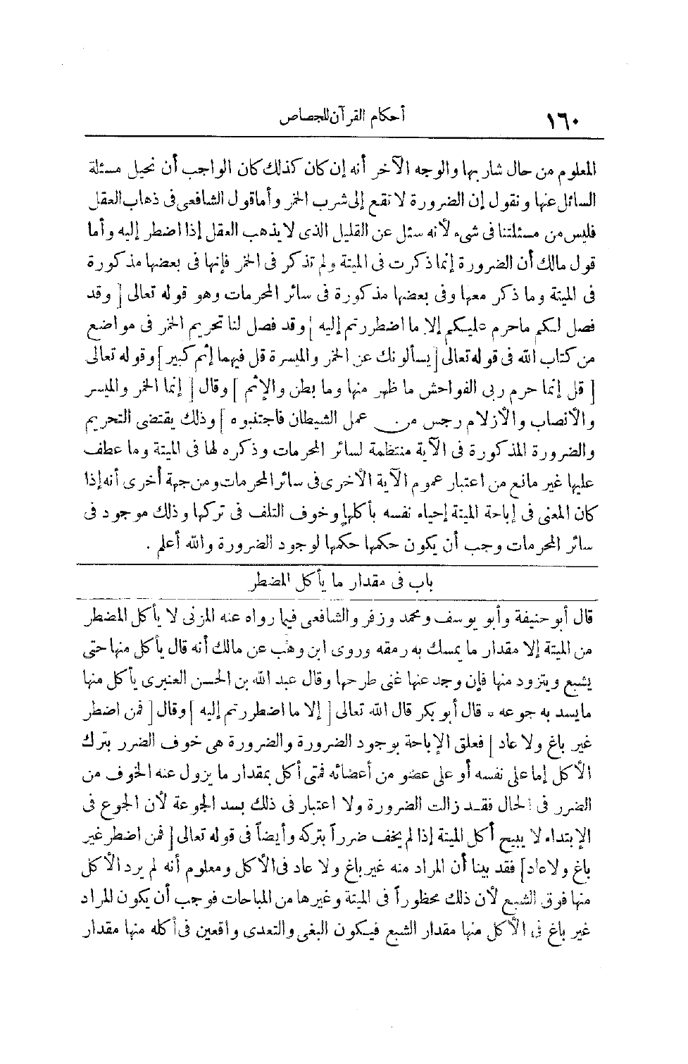 الْمَعْلُومِ مِنْ حَالِ شَارِبِهَا وَالْوَجْهُ الْآخَرُ أَنَّهُ إنْ كَانَ كَذَلِكَ كَانَ الْوَاجِبُ أَنْ نُحِيلَ مَسْأَلَةَ السَّائِلِ عَنْهَا وَنَقُولَ إنَّ الضَّرُورَهْ لَا تَقَعُ إلَى شُرْبِ الْخَمْرِ وَأَمَّا قَوْلُ الشَّافِعِيَّ فِي ذَهَابِ الْعَقْلِ فَلَيْسَ مِنْ مَسْأَلَتِنَا فِي شَيْءٍ لِأَنَّهُ سُئِلَ عَنْ الْقَلِيلِ الَّذِي لَا يُذْهِبُ الْعَقْلَ إذَا اُضْطُرَّ إلَيْهِ وَأَمَّا قَوْلُ مَالِكٍ إنَّ الضَّرُورَةَ إنَّمَا ذُكِرَتْ فِي الْمَيْتَةِ وَلَمْ تُذْكَرْ فِي الْخَمْرِ فَإِنَّهَا فِي بَعْضِهَا مَذْكُورَةً فِي الْمَيْتَةِ وَمَا ذُكِرَ مَعَهَا وَفِي بَعْضِهَا مَذْكُورَةٌ فِي سَائِرِ الْمُحَرَّمَاتِ وَهُوَ قَوْله تَعَالَى [وَقَدْ فَصَّلَ لَكُمْ مَا حَرَّمَ عَلَيْكُمْ إِلَّا مَا اضْطُرِرْتُمْ إِلَيْهِ] وَقَدْ فَصَّلَ لَنَا تَحْرِيمَ الْخَمْرِ فِي مَوَاضِعَ من كتاب الله في قوله تعالى [يَسْئَلُونَكَ عَنِ الْخَمْرِ وَالْمَيْسِرِ قُلْ فِيهِما إِثْمٌ كَبِيرٌ] وقَوْله تَعَالَى [قُلْ إِنَّما حَرَّمَ رَبِّيَ الْفَواحِشَ ما ظَهَرَ مِنْها وَما بَطَنَ وَالْإِثْمَ] وَقَالَ [إِنَّمَا الْخَمْرُ وَالْمَيْسِرُ وَالْأَنْصابُ وَالْأَزْلامُ رِجْسٌ مِنْ عَمَلِ الشَّيْطانِ فَاجْتَنِبُوهُ] وَذَلِكَ يَقْتَضِي التَّحْرِيمَ وَالضَّرُورَةُ الْمَذْكُورَةُ فِي الْآيَةِ مُنْتَظِمَةٌ لِسَائِرِ الْمُحَرَّمَاتِ وَذِكْرُهُ لَهَا فِي الْمَيْتَةِ وَمَا عُطِفَ عَلَيْهَا غَيْرُ مَانِعٍ مِنْ اعْتِبَارِ عُمُومِ الْآيَةِ الْأُخْرَى فِي سَائِرِ الْمُحَرَّمَاتِ وَمِنْ جِهَةٍ أُخْرَى أَنَّهُ إذَا كَانَ الْمَعْنَى فِي إبَاحَةِ الْمَيْتَةِ إحْيَاءَ نَفْسِهِ بِأَكْلِهَا وَخَوْفِ التَّلَفِ فِي تَرْكِهَا وَذَلِكَ مَوْجُودٌ فِي سَائِرِ الْمُحَرَّمَاتِ وَجَبَ أَنْ يَكُونَ حُكْمُهَا حُكْمَهَا لِوُجُودِ الضَّرُورَةِ وَاَللَّهُ أَعْلَمُ.