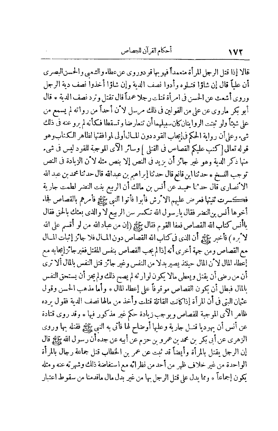 فأخبر صلّى الله عليه وسلم أَنَّ الَّذِي فِي كِتَابِ اللَّهِ الْقِصَاصُ دُونَ الْمَالِ فَلَا جَائِزٌ إثْبَاتُ الْمَالِ مَعَ الْقِصَاصِ وَمِنْ جِهَةٍ أُخْرَى أَنَّهُ إذَا لَمْ يَجِبْ القصاص بنفس المقتل فَغَيْرُ جَائِزٍ إيجَابُهُ مَعَ إعْطَاءِ الْمَالِ لِأَنَّ الْمَالَ حِينَئِذٍ يَصِيرُ بَدَلًا مِنْ النَّفْسِ وَغَيْرُ جَائِزٍ قَتْلُ النَّفْس بِالْمَالِ أَلَا تَرَى أَنَّ مَنْ رَضِيَ أَنْ يُقْتَلَ وَيُعْطَى مَالًا يَكُونُ لِوَارِثِهِ لَمْ يَصِحَّ ذَلِكَ وَلَمْ يَجُزْ أَنْ يَسْتَحِقَّ النَّفْسَ بِالْمَالِ فَبَطَل أَنْ يَكُونَ الْقِصَاصُ مَوْقُوفًا عَلَى إعْطَاءٍ الْمَالِ وَأَمَّا مَذْهَبُ الْحَسَنِ وَقَوْلُ عُثْمَانَ الْبَتِّيِّ فِي أَنَّ الْمَرْأَةَ إذَا كَانَتْ الْقَاتِلَةَ قُتِلَتْ وَأُخِذَ مِنْ مَالِهَا نِصْفُ الدِّيَةِ فَقَوْلٌ يَرُدُّهُ ظَاهِرُ الْآي الْمُوجِبَةِ لِلْقِصَاصِ وَيُوجِبُ زِيَادَةَ حُكْمٍ غَيْرِ مَذْكُورٍ فِيهَا