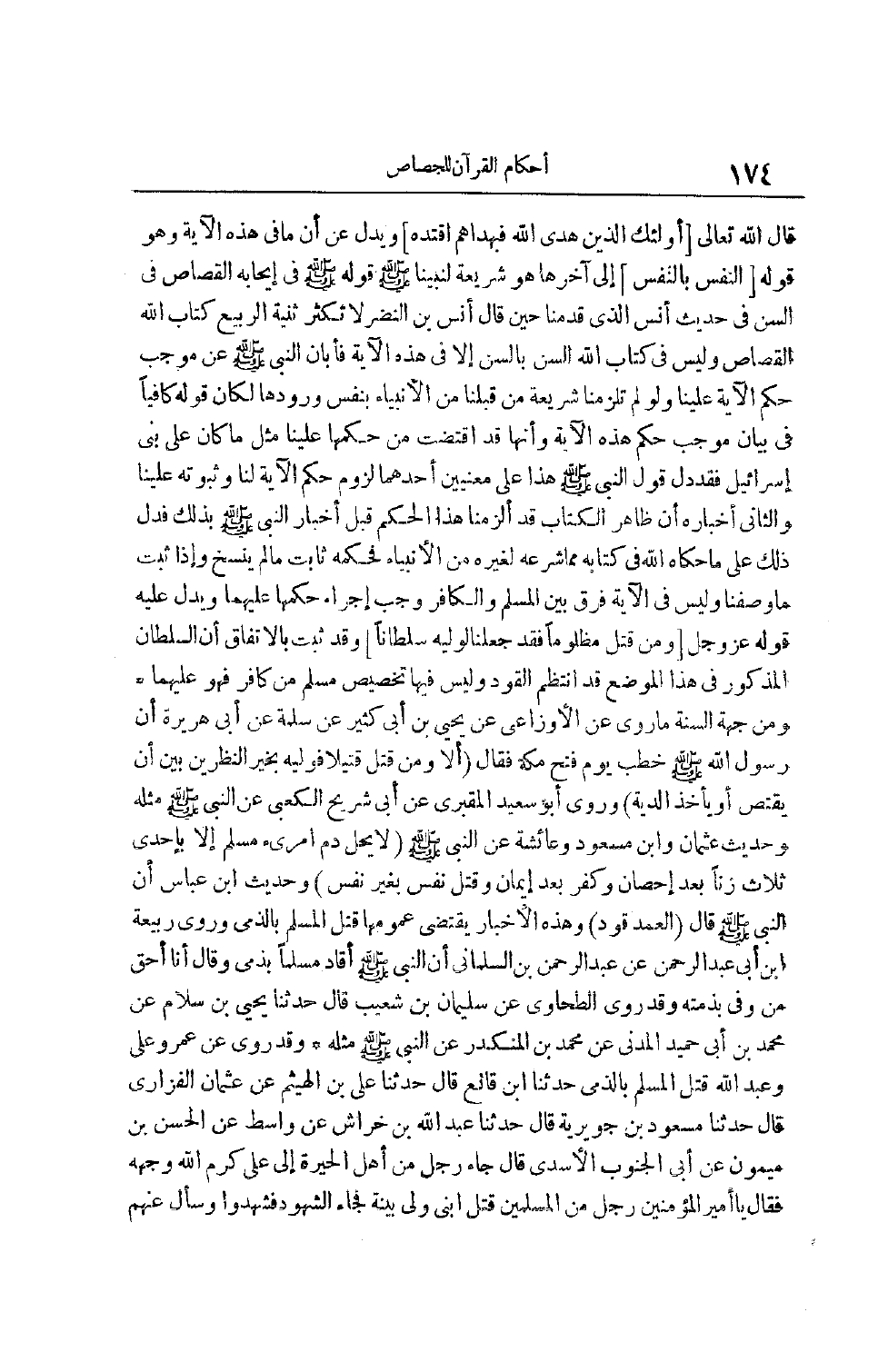 قَالَ اللَّهُ تَعَالَى [أُولئِكَ الَّذِينَ هَدَى اللَّهُ فَبِهُداهُمُ اقْتَدِهْ] ويدل عن أَنَّ مَا فِي هَذِهِ الْآيَةِ وَهُوَ قَوْلُهُ [النَّفْسَ بِالنَّفْسِ] إلى آخرها هو شريعة لنبينا صلّى الله عليه وسلم قوله صلّى الله عليه وسلم فِي إيجَابِهِ الْقِصَاصَ فِي السِّنِّ فِي حَدِيثِ أنس الذي قدمنا حين قال أنس بن النضر لا تكثر ثَنِيَّةُ الرُّبَيِّعِ كِتَابُ اللَّهِ الْقِصَاصُ وَلَيْسَ فِي كِتَابِ اللَّهِ السِّنُّ بِالسِّنِّ إلَّا فِي هَذِهِ الآية فَأَبَانَ النَّبِيُّ صَلَّى اللَّهُ عَلَيْهِ وَسَلَّمَ عَنْ مُوجِبِ حُكْمِ الْآيَةِ عَلَيْنَا وَلَوْ لَمْ تَلْزَمْنَا شَرِيعَةُ مِنْ قَبْلَنَا مِنْ الْأَنْبِيَاءِ بِنَفْسِ وُرُودِهَا لَكَانَ قَوْلُهُ كَافِيًا فِي بَيَانِ مُوجَبِ حُكْمِ هَذِهِ الْآيَةِ وَأَنَّهَا قَدْ اقْتَضَتْ مِنْ حُكْمِهَا عَلَيْنَا مِثْلَ مَا كَانَ عَلَى بَنِي إسْرَائِيلَ فقد دَلَّ قَوْلُ النَّبِيِّ صَلَّى اللَّهُ عَلَيْهِ وَسَلَّمَ هَذَا عَلَى مَعْنَيَيْنِ أَحَدُهُمَا لُزُومُ حُكْمِ الْآيَةِ لَنَا وَثُبُوتُهُ عَلَيْنَا وَالثَّانِي إخْبَارُهُ أَنَّ ظَاهِرَ الْكِتَابِ قَدْ أَلْزَمَنَا هَذَا الْحُكْمَ قَبْلَ إخْبَارِ النبي صلّى الله عليه وسلم بِذَلِكَ فَدَلَّ ذَلِكَ عَلَى مَا حَكَاهُ اللَّهُ فِي كِتَابِهِ مِمَّا شَرَّعَهُ لِغَيْرِهِ مِنْ الْأَنْبِيَاءِ فَحُكْمُهُ ثَابِتٌ مَا لَمْ يُنْسَخْ وَإِذَا ثَبَتَ مَا وَصَفْنَا وَلَيْسَ فِي الْآيَةِ فَرْقٌ بَيْنَ الْمُسْلِمِ وَالْكَافِرِ وَجَبَ إجْرَاءُ حُكْمِهَا عَلَيْهِمَا وَيَدُلُّ عَلَيْهِ قَوْلُهُ عَزَّ وَجَلَّ [وَمَنْ قُتِلَ مَظْلُوماً فَقَدْ جَعَلْنا لِوَلِيِّهِ سُلْطاناً] وَقَدْ ثَبَتَ بِالِاتِّفَاقِ أَنَّ السُّلْطَانَ الْمَذْكُورَ فِي هَذَا الْمَوْضِعِ قَدْ انْتَظَمَ الْقَوَدَ وَلَيْسَ فِيهَا تَخْصِيصْ مُسْلِمٍ مِنْ كَافِرٍ فَهُوَ عَلَيْهِمَا وَمِنْ جِهَةِ السُّنَّةِ مَا