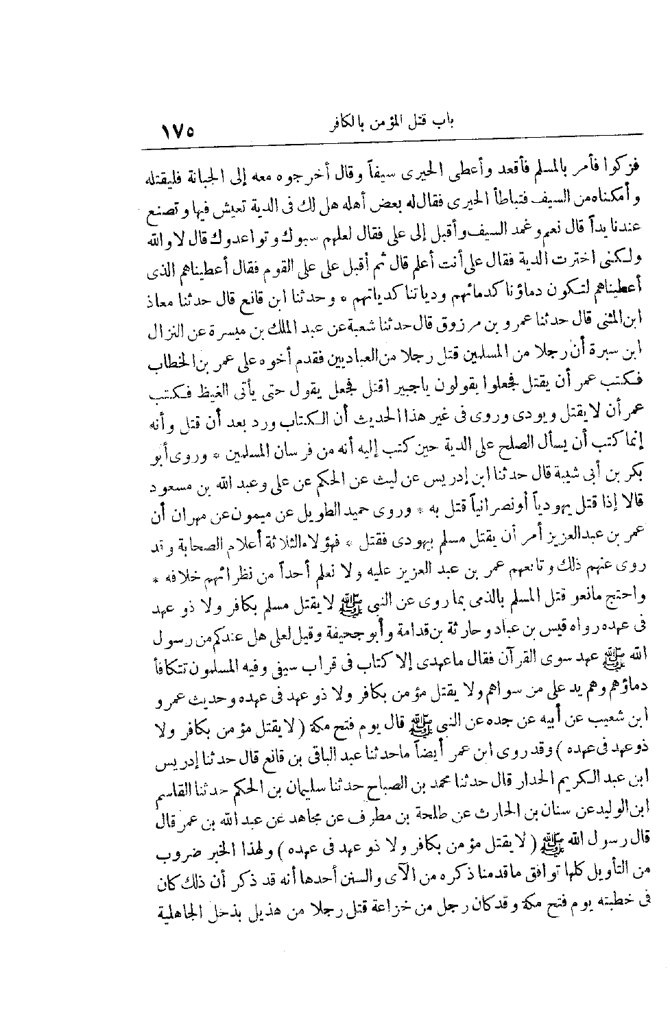 وحديث عمرو ابن شُعَيْبٍ عَنْ أَبِيهِ عَنْ جَدِّهِ عَنْ النَّبِيِّ صَلَّى اللَّهُ عَلَيْهِ وَسَلَّمَ قَالَ يَوْمَ فَتْحِ مَكَّةَ (لَا يُقْتَلُ مُؤْمِنٌ بِكَافِرٍ وَلَا ذُو عَهْدٍ فِي عَهْدِهِ)