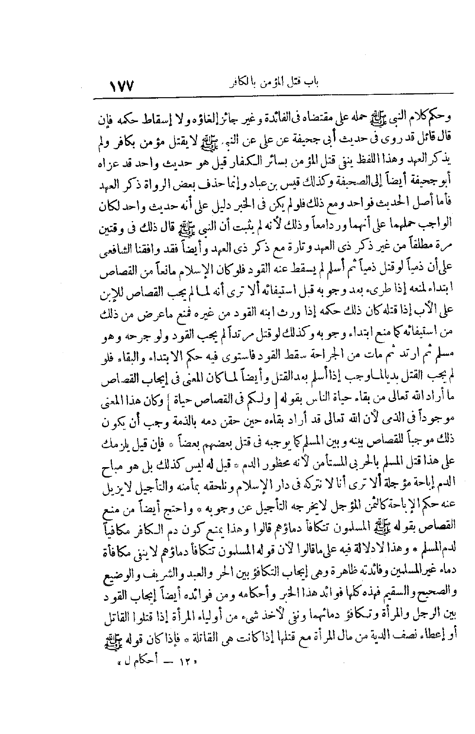 وَلَمْ يَذْكُرْ الْعَهْدَ وَهَذَا اللَّفْظُ يَنْفِي قَتْلَ الْمُؤْمِنِ بِسَائِرِ الْكُفَّارِ قِيلَ هُوَ حَدِيثٌ وَاحِدٌ قَدْ عَزَاهُ أَبُو جُحَيْفَةَ أَيْضًا إلَى الصَّحِيفَةِ وَكَذَلِكَ قَيْسُ بْنُ عَبَّادٍ وَإِنَّمَا حَذَفَ بَعْضُ الرُّوَاةِ ذِكْرَ الْعَهْدِ فَأَمَّا أَصْلُ الْحَدِيثِ فَوَاحِدٌ وَمَعَ ذَلِكَ فَلَوْ لَمْ يَكُنْ فِي الْخَبَرِ دَلِيلٌ عَلَى أَنَّهُ حَدِيثٌ وَاحِدٌ لَكَانَ الْوَاجِبُ حَمْلَهُمَا عَلَى أَنَّهُمَا وَرَدَا مَعًا وَذَلِكَ لِأَنَّهُ لَمْ يَثْبُتْ أَنَّ النَّبِيَّ صَلَّى اللَّهُ عَلَيْهِ وَسَلَّمَ قَالَ ذَلِكَ فِي وَقْتَيْنِ مَرَّةً مُطْلَقًا مِنْ غَيْرِ ذِكْرِ ذِي الْعَهْدِ وَتَارَةً مَعَ ذِكْرِ ذِي الْعَهْدِ وَأَيْضًا فَقَدْ وَافَقْنَا الشَّافِعِيَّ عَلَى أَنَّ ذِمِّيًّا لَوْ قَتَلَ ذِمِّيًّا ثُمَّ أَسْلَمَ لَمْ يَسْقُطْ عَنْهُ الْقَوَدُ فَلَوْ كَانَ الْإِسْلَامُ مَانِعًا مِنْ الْقِصَاصِ ابْتِدَاءً لَمَنَعَهُ إذَا طُرِئَ بَعْدَ وُجُوبِهِ قَبْلَ اسْتِيفَائِهِ أَلَا تَرَى أَنَّهُ لَمَّا لَمْ يَجِبْ الْقِصَاصِ لِلِابْنِ عَلَى الْأَبِ إذَا قَتَلَهُ كَانَ ذَلِكَ حُكْمَهُ إذَا وَرِثَ ابْنُهُ الْقَوَدَ مِنْ غَيْرِهِ فَمَنَعَ مَا عَرَضَ مِنْ ذَلِكَ مِنْ اسْتِيفَائِهِ كَمَا مَنَعَ ابْتِدَاءَ وُجُوبِهِ وَكَذَلِكَ لَوْ قَتَلَ مُرْتَدًّا لَمْ يَجِبْ الْقَوَدُ وَلَوْ جَرَحَهُ وَهُوَ مُسْلِمٌ ثُمَّ ارْتَدَّ ثُمَّ مَاتَ مِنْ الْجِرَاحَةِ سَقَطَ الْقَوَدُ فَاسْتَوَى فِيهِ حُكْمُ الِابْتِدَاءِ وَالْبَقَاءِ فَلَوْ لَمْ يَجِبْ الْقَتْلُ بَدِيًّا لَمَا وَجَبَ إذَا أَسْلَمَ بَعْدَ الْقَتْلِ وَأَيْضًا لَمَّا كَانَ الْمَعْنَى فِي إيجَابِ الْقِصَاصِ مَا أَرَادَ اللَّهُ تَعَالَى مِنْ بَقَاءِ حَيَاةِ النَّاسِ بقوله [وَلَكُمْ فِي الْقِصاصِ حَياةٌ] وَكَانَ هَذَا الْمَعْنَى مَوْجُودًا فِي الذِّمِّيِّ لِأَنَّ اللَّهَ تَعَالَى قَدْ أَرَادَ بَقَاءَهُ حِينَ حَقَنَ دَمَهُ بِالذِّمَّةِ وَجَبَ أَنْ يَكُونَ ذَلِكَ مُوجِبًا لِلْقِصَاصِ بَيْنَهُ وَبَيْنَ الْمُسْلِمِ كَمَا يُوجِبُهُ فِي قَتْلِ بَعْضِهِمْ بَعْضًا فَإِنْ قِيلَ يَلْزَمُكَ عَلَى هَذَا قَتْلُ الْمُسْلِمِ بِالْحَرْبِيِّ الْمُسْتَأْمَنِ لِأَنَّهُ مَحْظُورُ الدَّمِ قِيلَ لَهُ لَيْسَ كَذَلِكَ بَلْ هُوَ مُبَاحٌ الدَّمِ إبَاحَةً مُؤَجَّلَةً أَلَا تَرَى أَنَّا لَا نَتْرُكُهُ فِي دَارِ الْإِسْلَامِ وَنُلْحِقُهُ بِمَأْمَنِهِ وَالتَّأْجِيلُ لَا يُزِيلُ عَنْهُ حُكْمَ الْإِبَاحَةِ كَالثَّمَنِ الْمُؤَجَّلِ لَا يُخْرِجُهُ التَّأْجِيلُ عَنْ وُجُوبِهِ وَاحْتَجَّ أيضا من منع القصاص