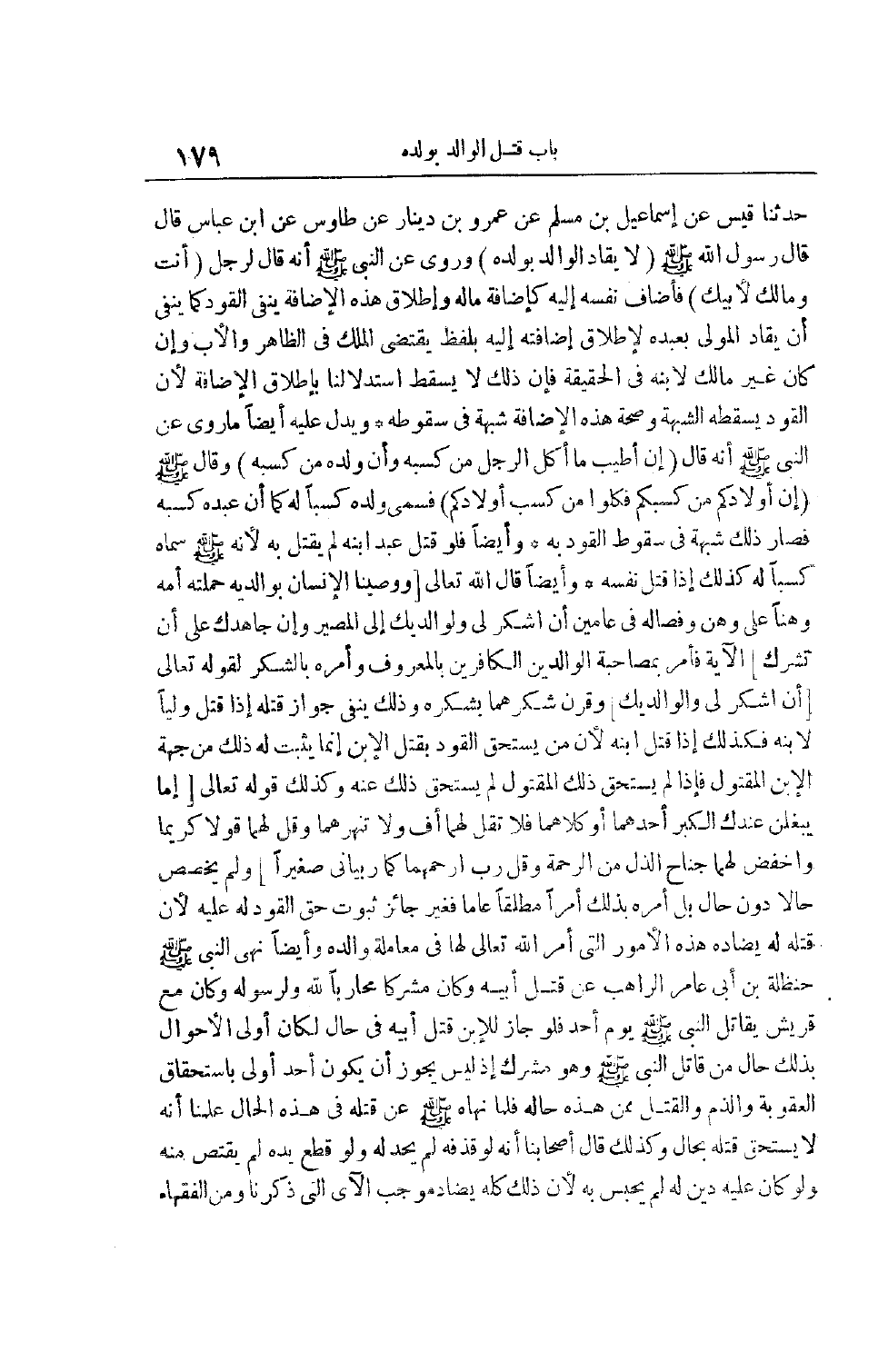 حَدَّثَنَا قَيْسٌ عَنْ إسْمَاعِيلَ بْنِ مُسْلِمٍ عَنْ عَمْرِو بْنِ دِينَارٍ عَنْ طَاوُسٍ عَنْ ابْنِ عَبَّاسٍ قَالَ قَالَ رسول الله صلى الله عَلَيْهِ وَسَلَّمَ (لَا يُقَادُ الْوَالِدُ بِوَلَدِهِ)