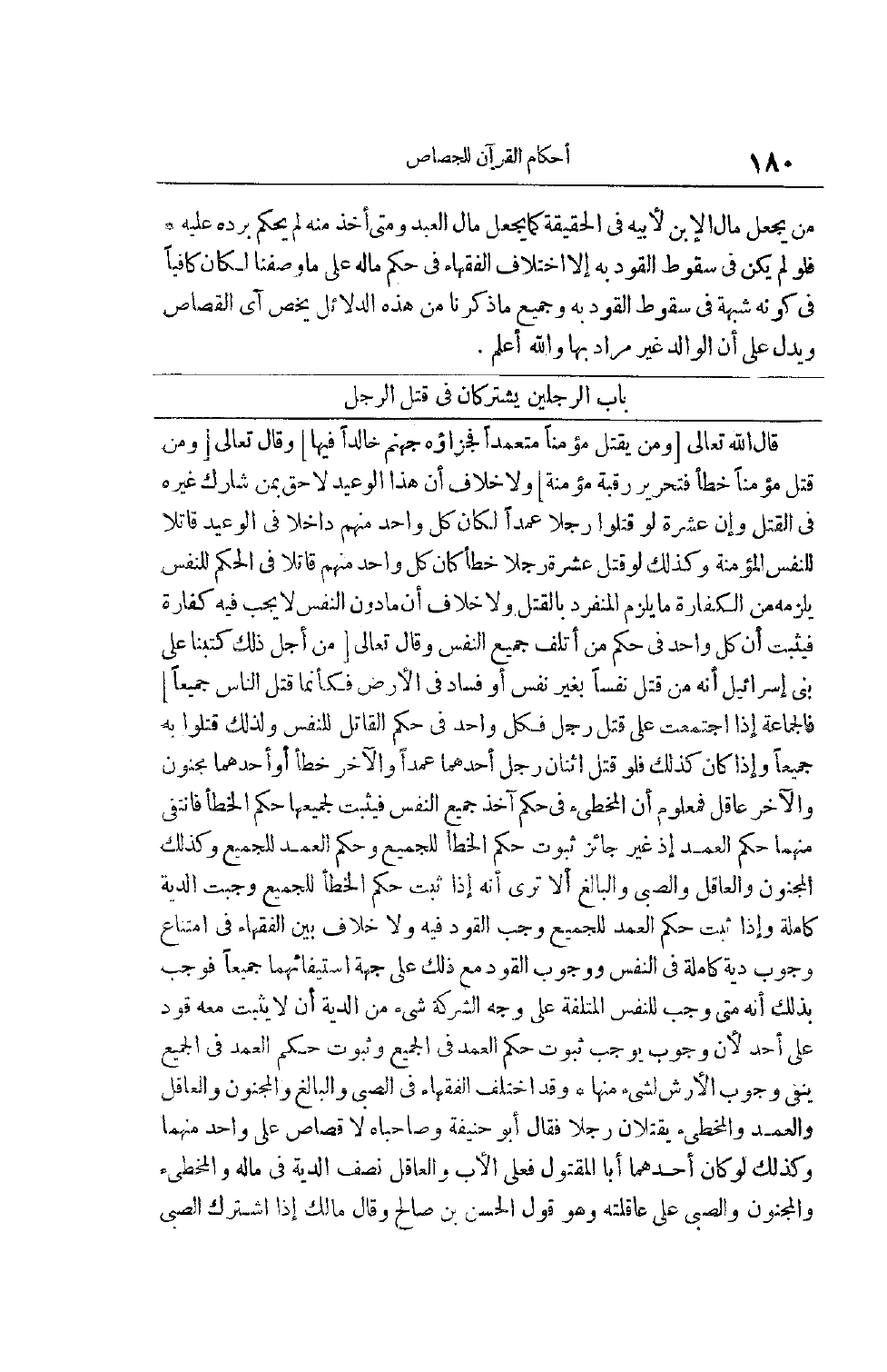 قَالَ اللَّهُ تَعَالَى [وَمَنْ يَقْتُلْ مُؤْمِناً مُتَعَمِّداً فَجَزاؤُهُ جَهَنَّمُ خالِداً فِيها] وَقَالَ تَعَالَى [وَمَنْ قَتَلَ مُؤْمِناً خَطَأً فَتَحْرِيرُ رَقَبَةٍ مُؤْمِنَةٍ] ولا خلاف أن هذا الوعيد لا حق بِمَنْ شَارَكَ غَيْرَهُ فِي الْقَتْلِ وَأَنَّ عَشَرَةً لَوْ قَتَلُوا رَجُلًا عَمْدًا لَكَانَ كُلُّ وَاحِدٍ مِنْهُمْ دَاخِلًا فِي الْوَعِيدِ قَاتِلًا لِلنَّفْسِ الْمُؤْمِنَةِ وَكَذَلِكَ لَوْ قَتَلَ عَشَرَةٌ رَجُلًا خَطَأً كَانَ كُلُّ وَاحِدٍ مِنْهُمْ قَاتِلًا فِي الْحُكْمِ لِلنَّفْسِ يَلْزَمُهُ مِنْ الْكَفَّارَةِ مَا يَلْزَمُ الْمُنْفَرِدَ بِالْقَتْلِ وَلَا خِلَافَ أَنَّ مَا دُونَ النَّفْسِ لَا يَجِبُ فِيهِ كَفَّارَةٌ فَيَثْبُتُ أَنَّ كُلَّ وَاحِدٍ فِي حُكْمِ مَنْ أَتْلَفَ جَمِيعَ النَّفْسِ وَقَالَ تَعَالَى [مِنْ أَجْلِ ذلِكَ كَتَبْنا عَلى بَنِي إِسْرائِيلَ أَنَّهُ مَنْ قَتَلَ نَفْساً بِغَيْرِ نَفْسٍ أَوْ فَسادٍ فِي الْأَرْضِ فَكَأَنَّما قَتَلَ النَّاسَ جَمِيعاً] فَالْجَمَاعَةُ إذَا اجْتَمَعَتْ عَلَى قَتْلِ رَجُلٍ فَكُلُّ وَاحِدٍ فِي حُكْمِ الْقَاتِلِ لِلنَّفْسِ وَلِذَلِكَ قُتِلُوا بِهِ جَمِيعًا وَإِذَا كَانَ كَذَلِكَ فَلَوْ قَتَلَ اثنان رجل أَحَدُهُمَا عَمْدًا وَالْآخَرُ خَطَأً أَوْ أَحَدُهُمَا مَجْنُونٌ وَالْآخَرُ عَاقِلٌ فَمَعْلُومٌ أَنَّ الْمُخْطِئَ فِي حُكْمِ آخذ جميع النفس فيثبت لجميعها حُكْمُ الْخَطَإِ فَانْتَفَى مِنْهُمَا حُكْمُ الْعَمْدِ إذْ غَيْرُ جَائِزٍ ثُبُوتُ حُكْمِ الْخَطَإِ لِلْجَمِيعِ وَحُكْمُ الْعَمْدِ لِلْجَمِيعِ وَكَذَلِكَ الْمَجْنُونُ وَالْعَاقِلُ وَالصَّبِيُّ وَالْبَالِغُ أَلَا تَرَى أَنَّهُ إذَا ثَبَتَ حُكْمُ الْخَطَإِ لِلْجَمِيعِ وَجَبَتْ الدِّيَةُ كَامِلَةً وَإِذَا ثَبَتَ حُكْمُ الْعَمْدِ لِلْجَمِيعِ وَجَبَ الْقَوَدُ فِيهِ وَلَا خِلَافَ بَيْنَ الْفُقَهَاءِ فِي امْتِنَاعِ وُجُوبِ دِيَةٍ كَامِلَةٍ فِي النَّفْسِ وَوُجُوبِ الْقَوَدِ مَعَ ذَلِكَ عَلَى جِهَةِ اسْتِيفَائِهِمَا جَمِيعًا فَوَجَبَ بِذَلِكَ أَنَّهُ مَتَى وَجَبَ لِلنَّفْسِ الْمُتْلِفَةِ عَلَى وَجْهِ الشَّرِكَةِ شَيْءٌ مِنْ الدِّيَةِ أَنْ لَا يَثْبُتَ مَعَهُ قَوَدٌ على أحد لأن وجوب يُوجِبُ ثُبُوتَ حُكْمِ الْعَمْدِ فِي الْجَمِيعِ وَثُبُوتُ حُكْمِ الْعَمْدِ فِي الْجَمِيعِ يَنْفِي وُجُوبَ الْأَرْشِ لِشَيْءٍ مِنْهَا وَقَدْ اخْتَلَفَ الْفُقَهَاءُ فِي الصَّبِيِّ والبالغ والمجنون والعاقل والعمد وَالْمُخْطِئِ يَقْتُلَانِ رَجُلًا فَقَالَ أَبُو حَنِيفَةَ وَصَاحِبَاهُ لَا قِصَاصَ عَلَى وَاحِدٍ مِنْهُمَا وَكَذَلِكَ لَوْ كَانَ أَحَدُهُمَا أَبَا الْمَقْتُولِ فَعَلَى الْأَبِ وَالْعَاقِلِ نِصْفُ الدِّيَةِ فِي مَالِهِ وَالْمُخْطِئُ وَالْمَجْنُونُ وَالصَّبِيُّ عَلَى عَاقِلَتِهِ وَهُوَ قَوْلُ الْحَسَنِ بْنِ صَالِحٍ وَقَالَ مَالِكٌ إذَا اشْتَرَكَ الصَّبِيُّ