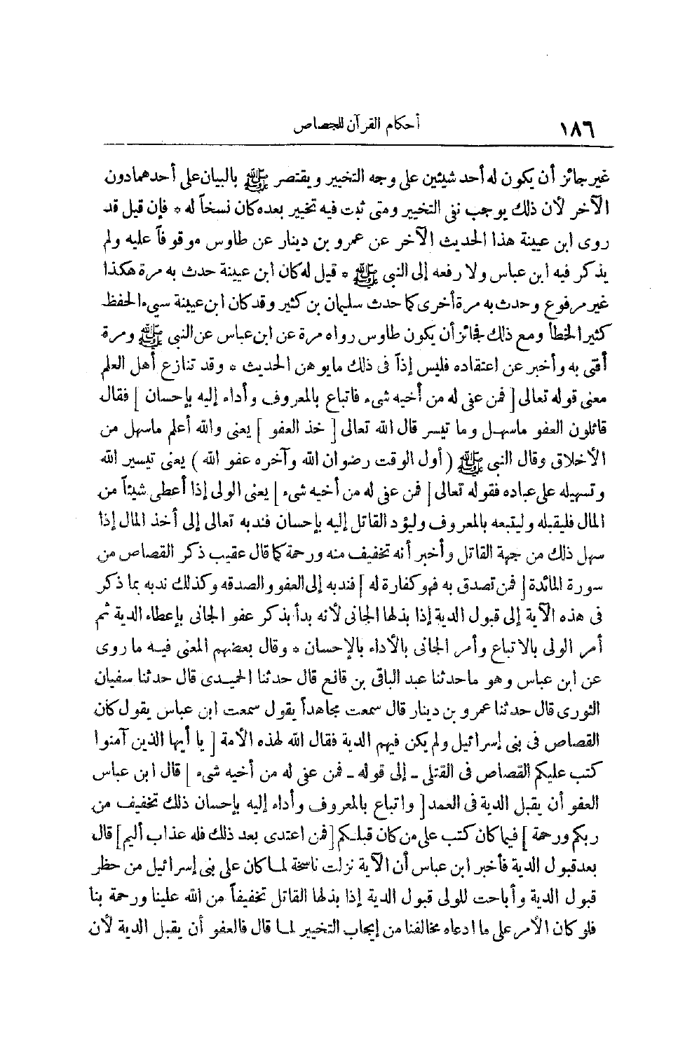 غَيْرُ جَائِزٍ أَنْ يَكُونَ لَهُ أَحَدُ شَيْئَيْنِ على وجه التخيير ويقتصر صلّى الله عليه وسلم بِالْبَيَانِ عَلَى أَحَدِهِمَا دُونَ الْآخَرِ لِأَنَّ ذَلِكَ يُوجِبُ نَفْيِ التَّخْيِيرِ وَمَتَى ثَبَتَ فِيهِ تَخْيِيرٌ بَعْدَهُ كَانَ نَسْخًا لَهُ فَإِنْ قِيلَ قَدْ رَوَى ابْنُ عُيَيْنَةَ هَذَا الْحَدِيثَ الْآخَرَ عَنْ عَمْرِو بْنِ دِينَارٍ عَنْ طَاوُسٍ مَوْقُوفًا عَلَيْهِ وَلَمْ يَذْكُرْ فِيهِ ابْنَ عَبَّاسٍ وَلَا رَفَعَهُ إلَى النَّبِيِّ صَلَّى اللَّهُ عَلَيْهِ وَسَلَّمَ قِيلَ لَهُ كَانَ ابْنُ عُيَيْنَةَ حَدَّثَ بِهِ مَرَّةً هَكَذَا غَيْرَ مَرْفُوعٍ وَحَدَّثَ بِهِ مَرَّةً أُخْرَى كَمَا حَدَّثَ سُلَيْمَانُ بْنُ كَثِيرٍ وَقَدْ كَانَ ابْنُ عُيَيْنَةَ سَيِّئَ الْحِفْظِ كَثِيرَ الْخَطَإِ وَمَعَ ذَلِكَ فَجَائِزٌ أَنْ يَكُونَ طَاوُسٌ رَوَاهُ مرة عَنْ ابْنِ عَبَّاسٍ عَنْ النَّبِيِّ صَلَّى اللَّهُ عليه وسلم وَمَرَّةً أَفْتَى بِهِ وَأَخْبَرَ عَنْ اعْتِقَادِهِ فَلَيْسَ إذًا فِي ذَلِكَ مَا يُوهِنُ الْحَدِيثَ وَقَدْ تَنَازَعَ أَهْلُ الْعِلْمِ مَعْنَى قَوْله تَعَالَى [فَمَنْ عُفِيَ لَهُ مِنْ أَخِيهِ شَيْءٌ فَاتِّباعٌ بِالْمَعْرُوفِ وَأَداءٌ إِلَيْهِ بِإِحْسانٍ] فَقَالَ قَائِلُونَ الْعَفْوُ مَا سَهُلَ وَمَا تَيَسَّرَ قال الله تعالى [خُذِ الْعَفْوَ] يَعْنِي وَاَللَّهُ أَعْلَمُ مَا سَهُلَ مِنْ الْأَخْلَاقِ