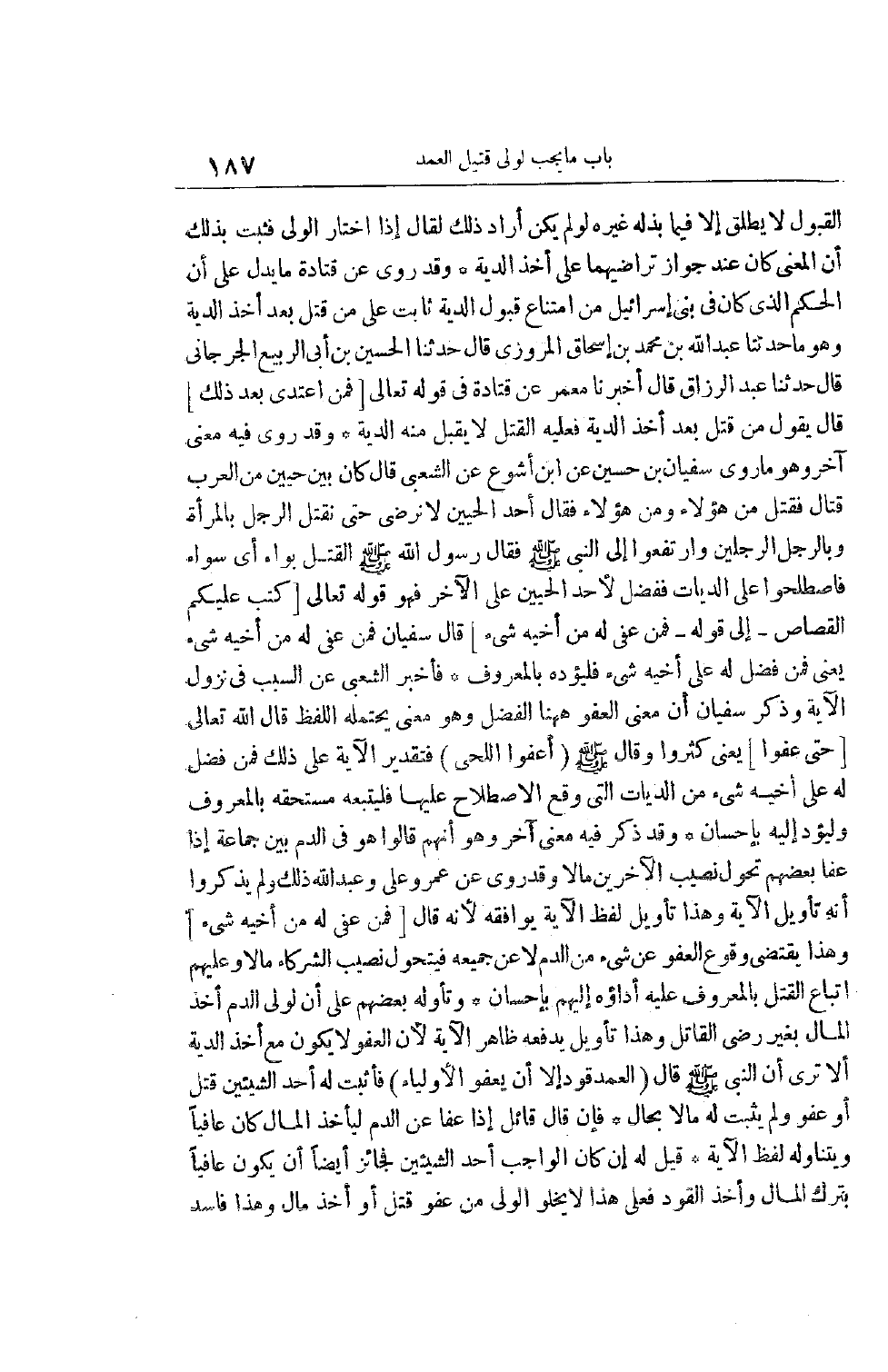 فَاصْطَلَحُوا عَلَى الدِّيَاتِ فَفَضَلَ لِأَحَدِ الْحَيَّيْنِ عَلَى الْآخَرِ فَهُوَ قَوْله تَعَالَى [كُتِبَ عَلَيْكُمُ الْقِصاصُ- إلَى قَوْلِهِ- فَمَنْ عُفِيَ لَهُ مِنْ أَخِيهِ شَيْءٌ] قَالَ سُفْيَانُ فَمَنْ عُفِيَ لَهُ مِنْ أَخِيهِ شيء يَعْنِي فَمَنْ فَضَلَ لَهُ عَلَى أَخِيهِ شَيْءٌ فَلْيُؤَدِّهِ بِالْمَعْرُوفِ فَأَخْبَرَ الشَّعْبِيُّ عَنْ السَّبَبِ فِي نُزُولِ الْآيَةِ وَذَكَرَ سُفْيَانُ أَنَّ مَعْنَى الْعَفْوِ هاهنا الْفَضْلُ وَهُوَ مَعْنًى يَحْتَمِلُهُ اللَّفْظُ قَالَ اللَّهُ تعالى [حَتَّى عَفَوْا] يعنى كثروا