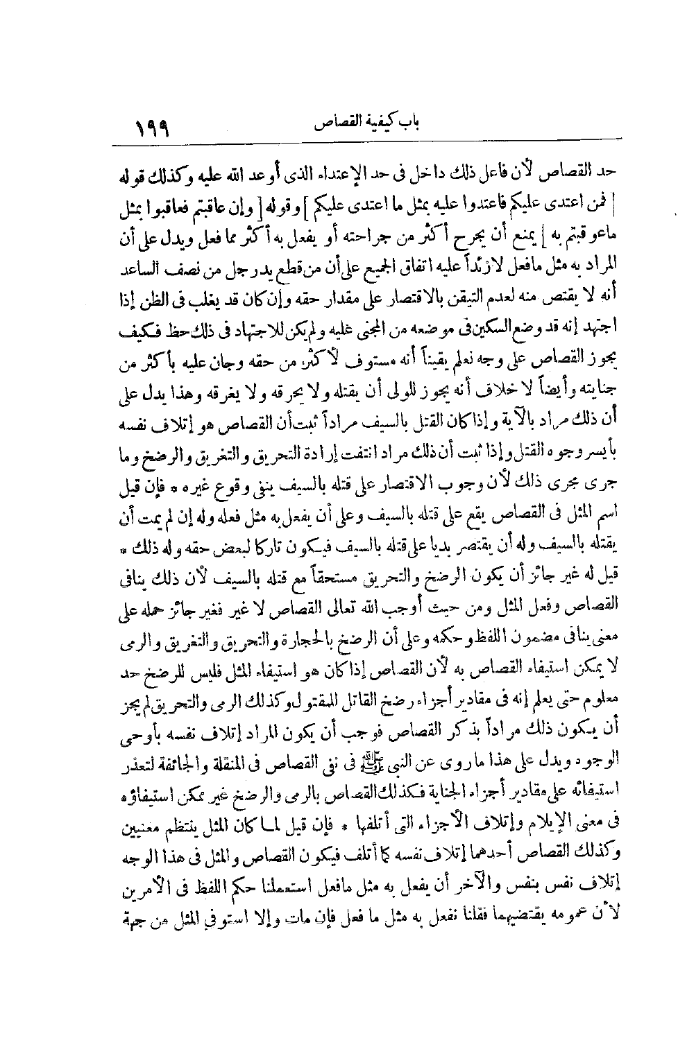 حَدِّ الْقِصَاصِ لِأَنَّ فَاعِلَ ذَلِكَ دَاخِلٌ فِي حَدِّ الِاعْتِدَاءِ الَّذِي أَوْعَدَ اللَّهُ عَلَيْهِ وَكَذَلِكَ قوله [فَمَنِ اعْتَدى عَلَيْكُمْ فَاعْتَدُوا عَلَيْهِ بِمِثْلِ مَا اعْتَدى عَلَيْكُمْ] وَقَوْلُهُ [وَإِنْ عاقَبْتُمْ فَعاقِبُوا بِمِثْلِ مَا عُوقِبْتُمْ بِهِ] يَمْنَعُ أَنْ يُجْرَحَ أَكْثَرَ مِنْ جِرَاحَتِهِ أَوْ يُفْعَلَ بِهِ أَكْثَرَ مِمَّا فَعَلَ وَيَدُلُّ عَلَى أَنَّ الْمُرَادَ بِهِ مِثْلُ مَا فَعَلَ لَا زَائِدًا عَلَيْهِ اتِّفَاقُ الْجَمِيعِ عَلَى أَنَّ مَنْ قَطَعَ يَدَ رَجُلٍ مِنْ نِصْفِ السَّاعِدِ أَنَّهُ لَا يُقْتَصُّ مِنْهُ لِعَدَمِ التَّيَقُّنِ بِالِاقْتِصَارِ عَلَى مِقْدَارِ حَقِّهِ وَإِنْ كَانَ قَدْ يَغْلِبُ فِي الظَّنِّ إذَا اجْتَهَدَ أَنَّهُ قَدْ وَضَعَ السِّكِّينَ فِي مَوْضِعِهِ مِنْ الْمَجْنِيّ عَلَيْهِ وَلَمْ يَكُنْ لِلِاجْتِهَادِ فِي ذَلِكَ حَظٌّ فَكَيْفَ يَجُوزُ الْقِصَاصُ عَلَى وَجْهٍ نَعْلَمُ يَقِينًا أَنَّهُ مُسْتَوْفٍ لِأَكْثَرَ مِنْ حَقِّهِ وَجَانٍ عَلَيْهِ بِأَكْثَرَ مِنْ جِنَايَتِهِ وَأَيْضًا لَا خِلَافَ أَنَّهُ يَجُوزُ لِلْوَلِيِّ أَنْ يَقْتُلَهُ وَلَا يُحَرِّقَهُ وَلَا يُغْرِقَهُ وَهَذَا يَدُلُّ على أن ذلك مراد بِالْآيَةِ وَإِذَا كَانَ الْقَتْلُ بِالسَّيْفِ مُرَادًا ثَبَتَ أَنَّ الْقِصَاصَ هُوَ إتْلَافُ نَفْسِهِ بِأَيْسَرِ وُجُوهِ القتل وإذا ثبت أن ذلك مراد انْتَفَتْ إرَادَةُ التَّحْرِيقِ وَالتَّغْرِيقِ وَالرَّضْخِ وَمَا جَرَى مَجْرَى ذَلِكَ لِأَنَّ وُجُوبَ الِاقْتِصَارِ عَلَى قَتْلِهِ بِالسَّيْفِ يَنْفِي وُقُوعَ غَيْرِهِ فَإِنْ قِيلَ اسْمُ الْمِثْلِ فِي الْقِصَاصِ يَقَعُ عَلَى قَتْلِهِ بِالسَّيْفِ وَعَلَى أَنْ يَفْعَلَ بِهِ مِثْلَ فِعْلِهِ وَلَهُ إنْ لَمْ يَمُتْ أَنْ يَقْتُلَهُ بِالسَّيْفِ وَلَهُ أَنْ يَقْتَصِرَ بَدِيًّا عَلَى قَتْلِهِ بِالسَّيْفِ فَيَكُونَ تَارِكًا لِبَعْضِ حَقِّهِ وَلَهُ ذَلِكَ قِيلَ لَهُ غَيْرُ جَائِزٍ أَنْ يَكُونَ الرَّضْخُ وَالتَّحْرِيقُ مُسْتَحِقًّا مَعَ قَتْلِهِ بِالسَّيْفِ لِأَنَّ ذَلِكَ يُنَافِي الْقِصَاصَ وَفِعْلَ الْمِثْلِ وَمِنْ حَيْثُ أَوْجَبَ اللَّهُ تَعَالَى الْقِصَاصَ لَا غَيْرُ فَغَيْرُ جَائِزٍ حَمْلُهُ عَلَى مَعْنًى يُنَافِي مَضْمُونَ اللَّفْظِ وَحُكْمَهُ وَعَلَى أَنَّ الرَّضْخ بِالْحِجَارَةِ وَالتَّحْرِيقَ وَالتَّغْرِيقَ وَالرَّمْيَ لَا يُمْكِنُ اسْتِيفَاءُ الْقِصَاصِ بِهِ لِأَنَّ الْقِصَاصَ إذَا كَانَ هُوَ اسْتِيفَاءَ الْمِثْلِ