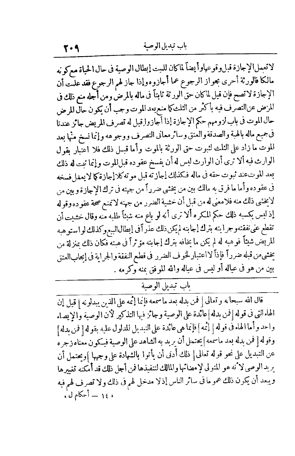 قال الله سبحانه وتعالى [فَمَنْ بَدَّلَهُ بَعْدَ ما سَمِعَهُ فَإِنَّما إِثْمُهُ عَلَى الَّذِينَ يُبَدِّلُونَهُ] قِيلَ إنَّ الْهَاءَ الَّتِي فِي قَوْلِهِ [فَمَنْ بَدَّلَهُ] عَائِدَةٌ عَلَى الْوَصِيَّةِ وَجَائِزٌ فِيهَا التَّذْكِيرُ لِأَنَّ الْوَصِيَّةَ وَالْإِيصَاءَ وَاحِدٌ وَأَمَّا الْهَاءُ فِي قَوْلِهِ [إِثْمُهُ] فَإِنَّمَا هِيَ عَائِدَةٌ عَلَى التَّبْدِيلِ الْمَدْلُولُ عَلَيْهِ بِقَوْلِهِ [فَمَنْ بَدَّلَهُ] وَقَوْلُهُ [فَمَنْ بَدَّلَهُ بَعْدَ ما سَمِعَهُ] يَحْتَمِلُ أَنْ يُرِيدَ بِهِ الشَّاهِدَ عَلَى الْوَصِيَّةِ فَيَكُونُ مَعْنَاهُ زَجْرَهُ عَنْ التَّبْدِيلِ عَلَى نَحْوِ قَوْله تَعَالَى [ذلِكَ أَدْنى أَنْ يَأْتُوا بِالشَّهادَةِ عَلى وَجْهِها] وَيَحْتَمِلُ أَنْ يُرِيدَ الْوَصِيُّ لِأَنَّهُ هُوَ الْمُتَوَلِّي لِإِمْضَائِهَا وَالْمَالِكُ لِتَنْفِيذِهَا فَمِنْ أَجْلِ ذَلِكَ قَدْ أَمْكَنَهُ تَغْيِيرُهَا وَيَبْعُدُ أَنْ يَكُونَ ذَلِكَ عُمُومًا فِي سَائِرِ النَّاسِ إذْ لَا مَدْخَلَ لَهُمْ فِي ذَلِكَ وَلَا تَصَرُّفَ لَهُمْ فِيهِ