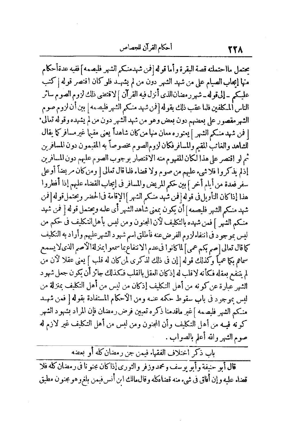 يَحْتَمِلُ مَا احْتَمَلَتْهُ قِصَةُ الْبَقَرَةِ وَأَمَّا قَوْلُهُ [فَمَنْ شَهِدَ مِنْكُمُ الشَّهْرَ فَلْيَصُمْهُ] فَفِيهِ عِدَّةُ أَحْكَامٍ مِنْهَا إيجَابُ الصِّيَامِ عَلَى مَنْ شَهِدَ الشَّهْرَ دُونَ مَنْ لَمْ يَشْهَدْ فلو كان اقتصر قوله [كُتِبَ عَلَيْكُمُ- إلَى قَوْلِهِ- شَهْرُ رَمَضانَ الَّذِي أُنْزِلَ فِيهِ الْقُرْآنُ] لَاقْتَضَى ذَلِكَ لُزُومَ الصَّوْمِ سَائِرَ النَّاسِ الْمُكَلَّفِينَ فَلَمَّا عَقَّبَ ذَلِكَ بِقَوْلِهِ [فَمَنْ شَهِدَ مِنْكُمُ الشَّهْرَ فَلْيَصُمْهُ] بَيَّنَ أَنَّ لُزُومَ صَوْمِ الشَّهْرِ مَقْصُورٌ عَلَى بَعْضِهِمْ دُونَ بَعْضٍ وَهُوَ مَنْ شَهِدَ الشَّهْرَ دُونَ مَنْ لَمْ يَشْهَدْهُ وقَوْله تَعَالَى [فَمَنْ شَهِدَ مِنْكُمُ الشَّهْرَ] يَعْتَوِرُهُ مَعَانٍ مِنْهَا مَنْ كَانَ شَاهِدًا يَعْنِي مُقِيمًا غَيْرَ مُسَافِرٍ كَمَا يُقَالُ لِلشَّاهِدِ وَالْغَائِبِ الْمُقِيمِ وَالْمُسَافِرِ فَكَانَ لُزُومُ الصَّوْمِ مَخْصُوصًا بِهِ الْمُقِيمُونَ دُونَ الْمُسَافِرِينَ ثُمَّ لَوْ اقْتَصَرَ عَلَى هَذَا لَكَانَ الْمَفْهُومُ مِنْهُ الِاقْتِصَارَ بِوُجُوبِ الصَّوْمِ عليهم دُونَ الْمُسَافِرِينَ ثُمَّ لَوْ اقْتَصَرَ عَلَى هَذَا لَكَانَ الْمَفْهُومُ مِنْهُ الِاقْتِصَارَ بِوُجُوبِ الصَّوْمِ عَلَيْهِمْ دُونَ الْمُسَافِرِينَ إذْ لَمْ يُذْكَرُوا فَلَا شَيْءَ عَلَيْهِمْ مِنْ صَوْمٍ وَلَا قَضَاءٍ فَلَمَّا قَالَ تَعَالَى [وَمَنْ كانَ مَرِيضاً أَوْ عَلى سَفَرٍ فَعِدَّةٌ مِنْ أَيَّامٍ أُخَرَ] بَيَّنَ حُكْمَ الْمَرِيضِ وَالْمُسَافِرِ فِي إيجَابِ الْقَضَاءِ عَلَيْهِمْ إذَا أَفْطَرُوا هَذَا إذَا كَانَ التَّأْوِيلُ في قوله [فَمَنْ شَهِدَ مِنْكُمُ الشَّهْرَ] الْإِقَامَةَ فِي الْحَضَرِ وَيَحْتَمِلُ قَوْلُهُ [فَمَنْ شَهِدَ مِنْكُمُ الشَّهْرَ فَلْيَصُمْهُ] أَنْ يَكُونَ بِمَعْنَى شَاهِدِ الشَّهْرِ أَيْ عَلِمَهُ ويحتمل قوله [فَمَنْ شَهِدَ مِنْكُمُ الشَّهْرَ] فَمَنْ شَهِدَهُ بِالتَّكْلِيفِ لِأَنَّ الْمَجْنُونَ وَمَنْ لَيْسَ بأهل التَّكْلِيفِ فِي حُكْمِ مَنْ لَيْسَ بِمَوْجُودٍ فِي انْتِفَاءِ لُزُومِ الْفَرْضِ عَنْهُ فَأَطْلَقَ اسْمَ شُهُودِ الشَّهْرِ عَلَيْهِمْ وَأَرَادَ بِهِ التَّكْلِيفَ كَمَا قَالَ تعالى [صُمٌّ بُكْمٌ عُمْيٌ] لَمَّا كَانُوا فِي عَدَمِ الِانْتِفَاعِ بِمَا سَمِعُوا بِمَنْزِلَةِ الْأَصَمِّ الَّذِي لَا يَسْمَعُ سَمَّاهُمْ بُكْمًا عُمْيًا وَكَذَلِكَ قَوْلُهُ [إِنَّ فِي ذلِكَ لَذِكْرى لِمَنْ كانَ لَهُ قَلْبٌ] يَعْنِي عَقْلًا لِأَنَّ مَنْ لَمْ يَنْتَفِعْ بِعَقْلِهِ فَكَأَنَّهُ لَا قَلْبَ لَهُ إذْ كَانَ الْعَقْلُ بِالْقَلْبِ فَكَذَلِكَ جَائِزٌ أَنْ يَكُونَ جَعَلَ شُهُودَ الشَّهْرِ عِبَارَةً عَنْ كَوْنِهِ مِنْ أَهْلِ التَّكْلِيفِ إذْ كَانَ مَنْ لَيْسَ مِنْ أَهْلِ التَّكْلِيفِ بمنزلة من ليس بموجود فِي بَابِ سُقُوطِ حُكْمِهِ عَنْهُ وَمِنْ الْأَحْكَامِ الْمُسْتَفَادَةِ بِقَوْلِهِ [فَمَنْ شَهِدَ مِنْكُمُ الشَّهْرَ فَلْيَصُمْهُ] غَيْرَ مَا قَدَّمْنَا ذِكْرَهُ تَعْيِينُ فَرْضِ رَمَضَانَ فَإِنَّ الْمُرَادَ بِشُهُودِ الشَّهْرِ كَوْنِهِ فِيهِ مِنْ أَهْلِ التَّكْلِيفِ وَأَنَّ الْمَجْنُونَ وَمَنْ لَيْسَ مِنْ أَهْلِ التَّكْلِيفِ غَيْرُ لَازِمٍ لَهُ صَوْمُ الشَّهْرِ والله أعلم بالصواب.