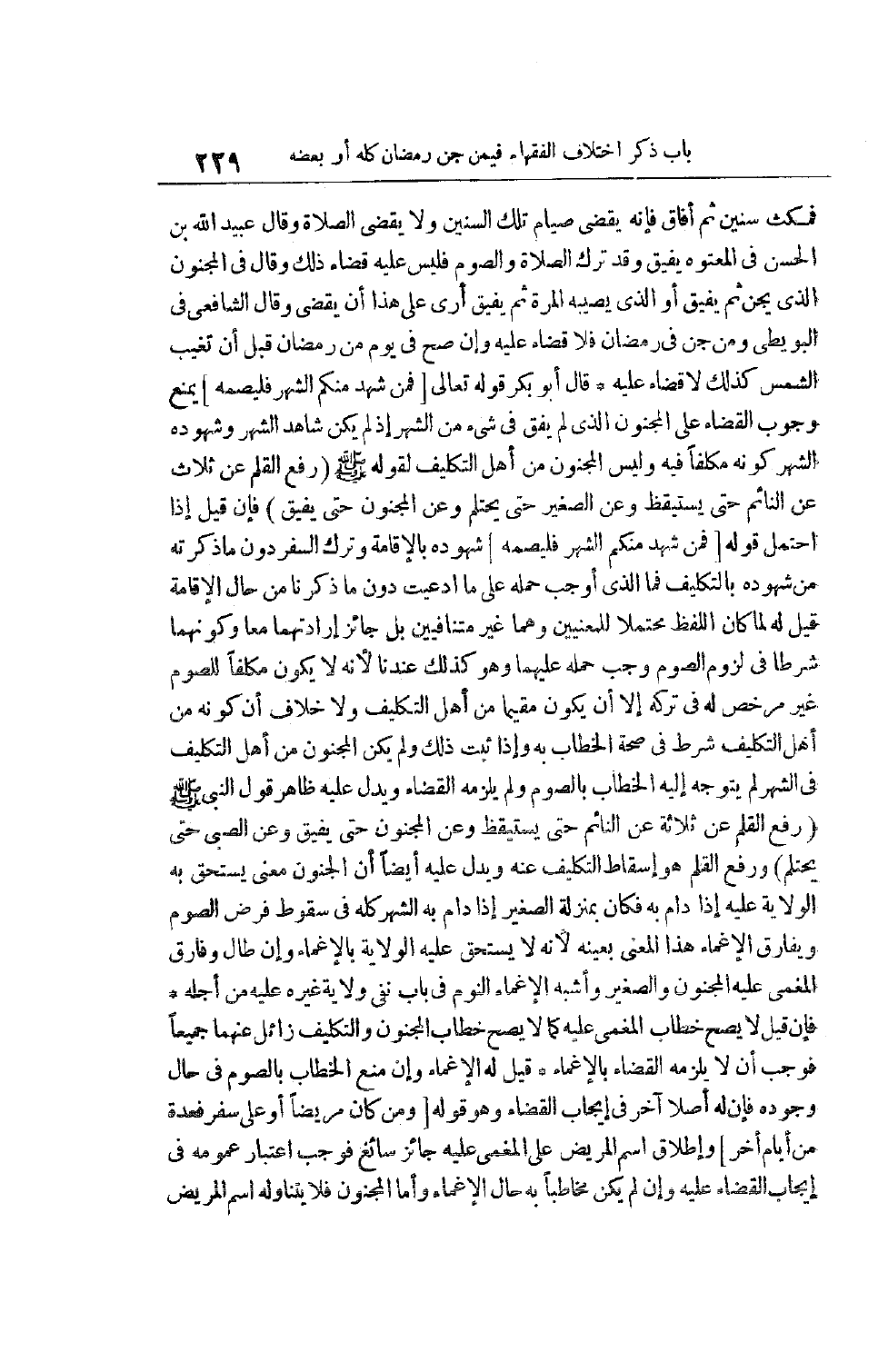 فَمَكَثَ سِنِينَ ثُمَّ أَفَاقَ فَإِنَّهُ يَقْضِي صِيَامَ تِلْكَ السِّنِينَ وَلَا يَقْضِي الصَّلَاةَ وَقَالَ عُبَيْدُ اللَّهِ بْنُ الْحَسَنِ فِي الْمَعْتُوهِ يُفِيقُ وَقَدْ تَرَكَ الصَّلَاةَ وَالصَّوْمَ فَلَيْسَ عَلَيْهِ قَضَاءُ ذَلِكَ وَقَالَ فِي الْمَجْنُونِ الَّذِي يُجَنُّ ثُمَّ يُفِيقُ أَوْ الَّذِي يُصِيبُهُ الْمِرَّةَ ثُمَّ يُفِيقُ أَرَى عَلَى هَذَا أَنْ يَقْضِيَ وَقَالَ الشَّافِعِيُّ فِي الْبُوَيْطِيِّ وَمَنْ جُنَّ فِي رَمَضَانَ فَلَا قَضَاءَ عَلَيْهِ وَإِنْ صَحَّ فِي يَوْمٍ مِنْ رَمَضَانَ قَبْلَ أَنْ تَغِيبَ الشَّمْسُ كَذَلِكَ لَا قَضَاءَ عَلَيْهِ قَالَ أَبُو بَكْرٍ قَوْله تَعَالَى [فَمَنْ شَهِدَ مِنْكُمُ الشَّهْرَ فَلْيَصُمْهُ] يَمْنَعُ وُجُوبَ الْقَضَاءِ عَلَى الْمَجْنُونِ الَّذِي لَمْ يُفِقْ فِي شَيْءٍ مِنْ الشَّهْرِ إذْ لَمْ يَكُنْ شَاهَدَ الشَّهْرَ وَشُهُودُهُ الشَّهْرَ كَوْنُهُ مُكَلَّفًا فِيهِ وَلَيْسَ الْمَجْنُونُ مِنْ أَهْلِ التَّكْلِيفِ