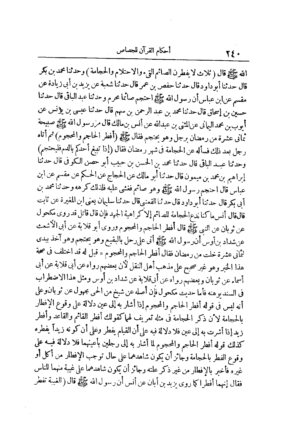 قِيلَ لَهُ قَدْ اُخْتُلِفَ فِي صِحَّةَ هَذَا الْخَبَرِ وَهُوَ غَيْرُ صَحِيحٍ عَلَى مَذْهَبِ أَهْلِ النَّقْلِ لِأَنَّ بَعْضَهُمْ رَوَاهُ عَنْ أَبِي قِلَابَةَ عَنْ أَبِي أَسْمَاءَ عَنْ ثَوْبَانَ وَبَعْضُهُمْ رَوَاهُ عَنْ أَبِي قِلَابَةَ عَنْ شَدَّادِ بْنِ أَوْسٍ وَمِثْلُ هَذَا الِاضْطِرَابِ فِي السَّنَدِ يُوهِنُهُ فَأَمَّا حَدِيثُ مَكْحُولٍ فَإِنَّ أَصْلَهُ عَنْ شَيْخِ مِنْ الْحَيِّ مَجْهُولٍ عَنْ ثَوْبَانَ وَعَلَى أَنَّهُ لَيْسَ فِي قَوْلِهِ أَفْطَرَ الْحَاجِمُ وَالْمَحْجُومُ إذَا أَشَارَ بِهِ إلَى عَيْنٍ دَلَالَةً عَلَى وُقُوعِ الْإِفْطَارِ بِالْحِجَامَةِ لِأَنَّ ذِكْرَ الْحِجَامَةِ فِي مِثْلِهِ تَعْرِيفٌ لَهُمَا كَقَوْلِكَ أَفْطَرَ الْقَائِمُ وَالْقَاعِدُ وَأَفْطَرَ زَيْدٌ إذَا أَشَرْتَ بِهِ إلَى عَيْنٍ فَلَا دَلَالَةَ فِيهِ عَلَى أَنَّ الْقِيَامَ يُفْطِرُ وَعَلَى أَنَّ كَوْنَهُ زَيْدًا يُفْطِرُهُ كَذَلِكَ قَوْلُهُ أَفْطَرَ الْحَاجِمُ وَالْمَحْجُومُ لَمَّا أَشَارَ بِهِ إلَى رَجُلَيْنِ بِأَعْيُنِهِمَا فَلَا دَلَالَةَ فِيهِ عَلَى وُقُوعِ الْفِطْرِ بِالْحِجَامَةِ وَجَائِزٌ أَنْ يَكُونَ شَاهَدَهُمَا عَلَى حَالٍ توجب الإفطار من أكل أو غيره فأخبر بِالْإِفْطَارِ مِنْ غَيْرِ ذِكْرِ عِلَّتِهِ وَجَائِزٌ أَنْ يَكُونَ شَاهَدَهُمَا عَلَى غَيْبَةٍ مِنْهُمَا لِلنَّاسِ فَقَالَ إنَّهُمَا أَفْطَرَا كَمَا
