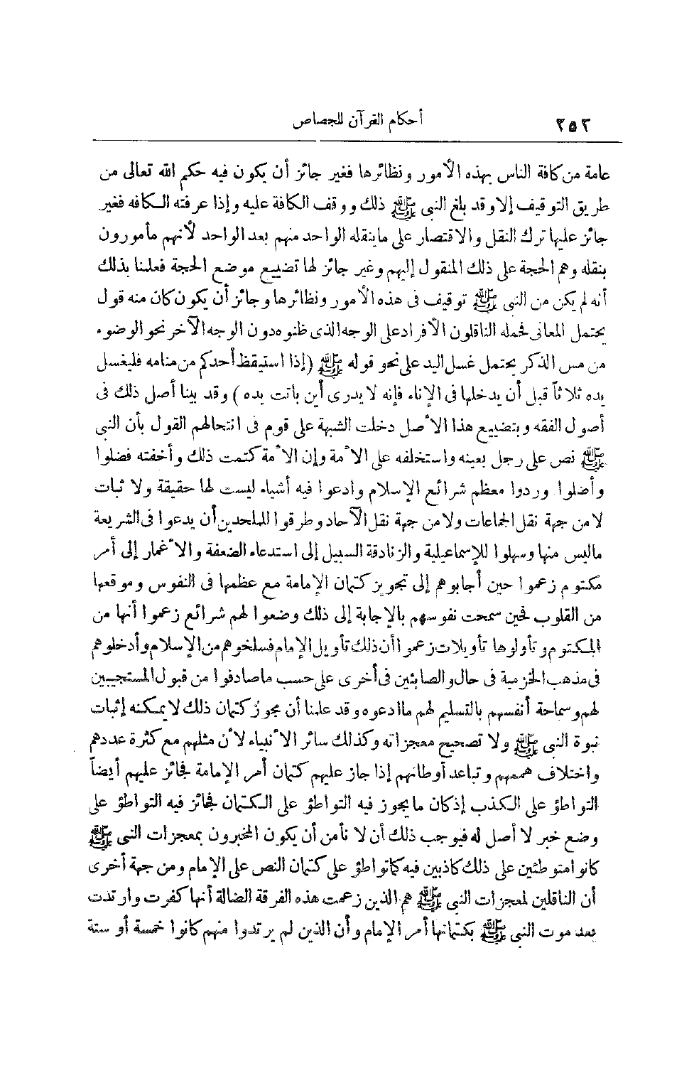 وَقَدْ بَيَّنَّا أَصْلَ ذَلِكَ فِي أُصُولِ الْفِقْهِ وَبِتَضْيِيعِ هَذَا الْأَصْلِ دَخَلْتَ الشُّبْهَةُ عَلَى قَوْمٍ فِي انْتِحَالِهِمْ الْقَوْلَ بِأَنَّ النَّبِيَّ صَلَّى اللَّهُ عَلَيْهِ وَسَلَّمَ نَصَّ عَلَى رَجُلٍ بِعَيْنِهِ وَاسْتَخْلَفَهُ عَلَى الْأُمَّةِ وَأَنَّ الْأُمَّةَ كَتَمَتْ ذَلِكَ وَأَخْفَتْهُ فَضَلُّوا وَأَضَلُّوا وَرَدُّوا مُعْظَمَ شَرَائِعِ الْإِسْلَامِ وَادَّعُوا فِيهِ أَشْيَاءَ لَيْسَتْ لَهَا حَقِيقَةٌ وَلَا ثَبَاتٌ لَا مِنْ جِهَةِ نَقْلِ الْجَمَاعَاتِ وَلَا مِنْ جِهَةِ نَقْلِ الْآحَادِ وَطَرَقُوا لِلْمُلْحِدِينَ أَنْ يَدَّعُوا فِي الشَّرِيعَةِ مَا لَيْسَ مِنْهَا وَسَهَّلُوا لِلْإِسْمَاعِيلِيَّةِ وَالزَّنَادِقَةِ السَّبِيلَ إلَى اسْتِدْعَاءِ الضَّعَفَةِ وَالْأَغْمَارِ إلَى أَمْرٍ مَكْتُومٍ زَعَمُوا حِينَ أَجَابُوهُمْ إلَى تَجْوِيزِ كِتْمَانِ الْإِمَامَةِ مَعَ عِظَمِهَا فِي النُّفُوسِ وَمَوْقِعِهَا مِنْ الْقُلُوبِ فَحِينَ سَمَحَتْ نُفُوسُهُمْ بِالْإِجَابَةِ إلَى ذَلِكَ وَضَعُوا لَهُمْ شَرَائِعَ زَعَمُوا أَنَّهَا مِنْ الْمَكْتُومِ وَتَأَوَّلُوهَا تَأْوِيلَاتٍ زَعَمُوا أَنَّ ذَلِكَ تَأْوِيلُ الْإِمَامِ فَسَلَخُوهُمْ من الإسلام وأدخلوهم في مذهب الخزمية فِي حَالٍ وَالصَّابِئِينَ فِي أُخْرَى عَلَى حَسَبِ مَا صَادَفُوا مِنْ قَبُولِ الْمُسْتَجِيبِينَ لَهُمْ وَسَمَاحَةِ أَنْفُسِهِمْ بِالتَّسْلِيمِ لَهُمْ مَا ادَّعُوهُ وَقَدْ عَلِمْنَا أَنَّ مُجَوِّزَ كِتْمَانِ ذَلِكَ لَا يُمْكِنُهُ إثْبَاتُ نُبُوَّةِ النَّبِيِّ صَلَّى اللَّهُ عَلَيْهِ وَسَلَّمَ وَلَا تَصْحِيحُ مُعْجِزَاتِهِ وَكَذَلِكَ سَائِرُ الْأَنْبِيَاءِ لِأَنَّ مِثْلَهُمْ مَعَ كَثْرَةِ عَدَدِهِمْ وَاخْتِلَافِ هِمَمِهِمْ وَتَبَاعُدِ أَوْطَانِهِمْ إذَا جَازَ عَلَيْهِمْ كِتْمَانُ أَمْرِ الْإِمَامَةِ فَجَائِزٌ عَلَيْهِمْ أَيْضًا التَّوَاطُؤُ عَلَى الْكَذِبِ إذْ كَانَ مَا يَجُوزُ فِيهِ التَّوَاطُؤُ عَلَى الْكِتْمَانِ فَجَائِزٌ فِيهِ التَّوَاطُؤُ عَلَى وَضْعِ خَبَرٍ لَا أَصْلَ لَهُ فَيُوجِبُ ذَلِكَ أَنْ لَا نَأْمَنَ أَنْ يَكُونَ الْمُخْبِرُونَ بِمُعْجِزَاتِ النَّبِيِّ صَلَّى اللَّهُ عَلَيْهِ وَسَلَّمَ كَانُوا مُتَوَاطِئِينَ عَلَى ذَلِكَ كَاذِبِينَ فِيهِ كما تواطؤ عَلَى كِتْمَانِ النَّصِّ عَلَى الْإِمَامِ وَمِنْ جِهَةٍ أُخْرَى أَنَّ النَّاقِلِينَ لِمُعْجِزَاتِ النَّبِيِّ صَلَّى اللَّهُ عَلَيْهِ وَسَلَّمَ هُمْ الَّذِينَ زَعَمَتْ هَذِهِ الْفِرْقَةُ الضَّالَّةُ أَنَّهَا كَفَرْتَ وَارْتَدَّتْ بَعْدَ مَوْتِ النَّبِيِّ صَلَّى اللَّهُ عَلَيْهِ وَسَلَّمَ بِكِتْمَانِهَا أَمْرَ الْإِمَامِ وَأَنَّ الَّذِينَ لَمْ يَرْتَدُّوا مِنْهُمْ كَانُوا خَمْسَةً أو ستة