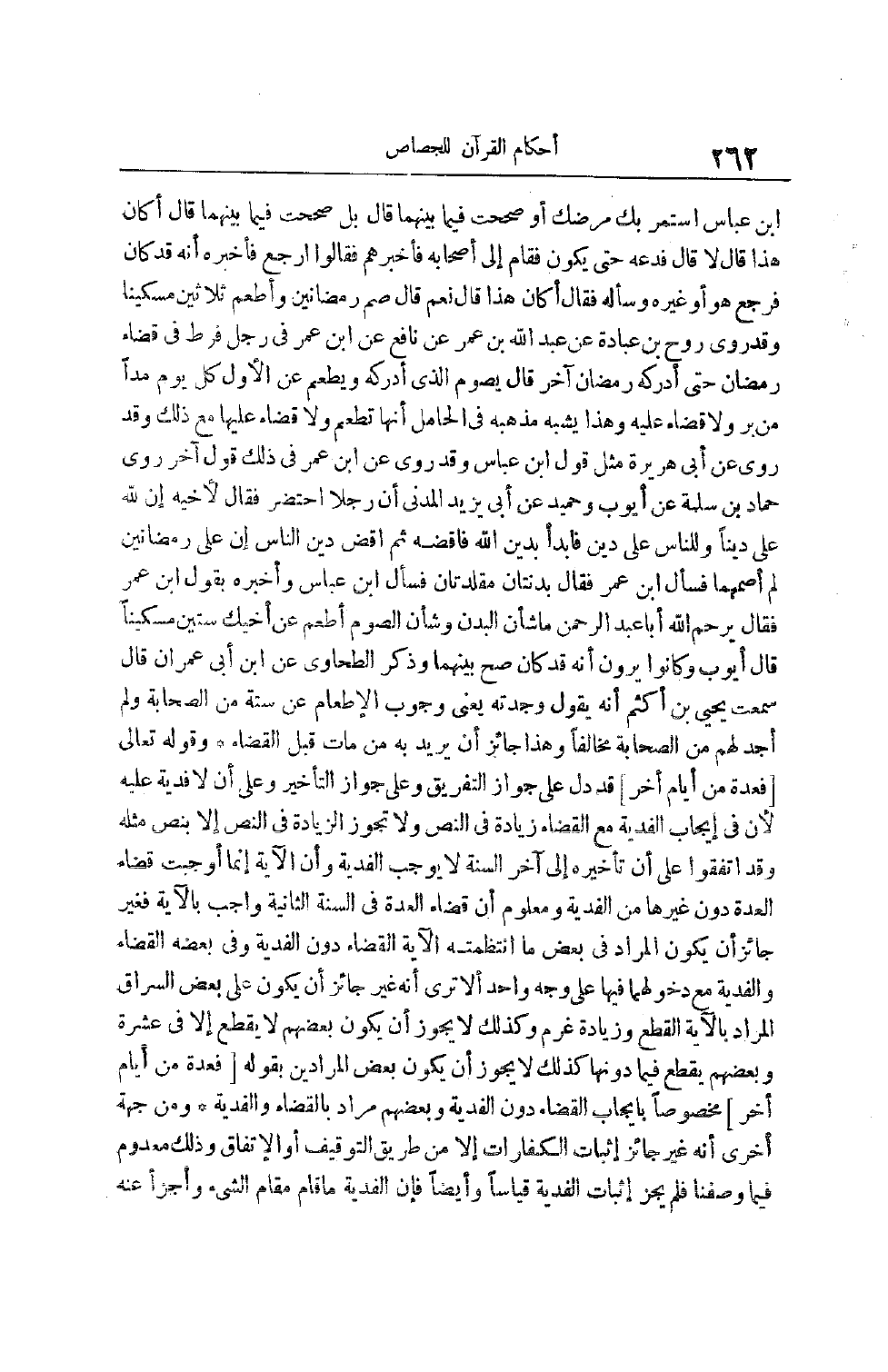 ابْنُ عَبَّاسٍ أَسْتَمَرَّ بِكَ مَرَضُكَ أَوْ صَحَحْتَ فِيمَا بَيْنَهُمَا قَالَ بَلْ صَحَحْت فِيمَا بَيْنَهُمَا قَالَ أَكَانَ هَذَا قَالَ لَا قَالَ فَدَعْهُ حَتَّى يَكُونَ فَقَامَ إلَى أَصْحَابِهِ فَأَخْبَرَهُمْ فَقَالُوا ارْجِعْ فَأَخْبِرْهُ أَنَّهُ قَدْ كَانَ فَرَجَعَ هُوَ أَوْ غَيْرُهُ وَسَأَلَهُ فَقَالَ أَكَانَ هَذَا قَالَ نَعَمْ قَالَ صُمْ رَمَضَانَيْنِ وَأُطْعِمْ ثَلَاثِينَ مِسْكِينًا وَقَدْ رَوَى رَوْحُ بْنُ عُبَادَةَ عَنْ عَبْدِ اللَّهِ بْنِ عُمَرَ عَنْ نَافِعٍ عَنْ ابْنِ عُمَرَ فِي رَجُلٍ فَرَّطَ فِي قَضَاءِ رَمَضَانَ حَتَّى أَدْرَكَهُ رَمَضَانُ آخَرُ قَالَ يَصُومُ الَّذِي أَدْرَكَهُ وَيُطْعِمُ عَنْ الْأَوَّلِ كُلَّ يَوْمٍ مُدًّا مِنْ بُرٍّ وَلَا قَضَاءَ عَلَيْهِ وَهَذَا يُشْبِهُ مَذْهَبَهُ فِي الْحَامِلِ أَنَّهَا تُطْعِمُ وَلَا قَضَاءَ عَلَيْهَا مَعَ ذَلِكَ وَقَدْ رُوِيَ عَنْ أَبِي هُرَيْرَةَ مِثْلُ قَوْلِ ابْنِ عَبَّاسٍ وَقَدْ رُوِيَ عَنْ ابْنِ عُمَرَ فِي ذَلِكَ قَوْلٌ آخَرُ رَوَى حَمَّادُ بْنُ سَلَمَةَ عَنْ أَيُّوبَ وَحُمَيْدٍ عَنْ أَبِي يَزِيدَ الْمَدَنِيِّ أَنَّ رَجُلًا اُحْتُضِرَ فَقَالَ لِأَخِيهِ إنَّ لِلَّهِ عَلَيَّ دَيْنًا وَلِلنَّاسِ عَلَيَّ دَيْنٌ فَابْدَأْ بِدَيْنِ اللَّهِ فَاقْضِهِ ثُمَّ اقْضِ دَيْنَ النَّاس إنَّ عَلَيَّ رَمَضَانَيْنِ لَمْ أَصُمْهُمَا فَسَأَلَ ابْنَ عُمَرَ فَقَالَ بَدَنَتَانِ مُقَلَّدَتَانِ فَسَأَلَ ابْنَ عَبَّاسٍ وَأَخْبَرَهُ بِقَوْلِ ابْنِ عُمَرَ فَقَالَ يَرْحَمُ اللَّهُ أَبَا عَبْدِ الرَّحْمَنِ مَا شَأْنُ الْبُدْنِ وَشَأْنُ الصَّوْمِ أَطْعِمْ عَنْ أَخِيكَ سِتِّينَ مِسْكِينًا قَالَ أَيُّوبُ وَكَانُوا يَرَوْنَ أَنَّهُ قَدْ كَانَ صَحَّ بَيْنَهُمَا وَذَكَرَ الطَّحَاوِيُّ عَنْ ابْنِ أَبِي عِمْرَانَ قَالَ سَمِعْتُ يَحْيَى بْنَ أَكْثَمَ أَنَّهُ يَقُولُ وَجَدْتُهُ يَعْنِي وُجُوبَ الْإِطْعَامِ عَنْ سِتَّةٍ مِنْ الصَّحَابَةِ وَلَمْ أَجِدْ لَهُمْ مِنْ الصَّحَابَةَ مُخَالِفًا وَهَذَا جَائِزٌ أَنْ يُرِيدَ بِهِ مَنْ مَاتَ قَبْلَ الْقَضَاءِ وقَوْله تَعَالَى [فَعِدَّةٌ مِنْ أَيَّامٍ أُخَرَ] قَدْ دَلَّ عَلَى جَوَازِ التَّفْرِيقِ وَعَلَى جَوَازِ التَّأْخِيرِ وَعَلَى أَنْ لَا فِدْيَةَ عَلَيْهِ لِأَنَّ فِي إيجَابِ الْفِدْيَةِ مَعَ الْقَضَاءِ زِيَادَةً فِي النَّصِّ وَلَا تَجُوزُ الزِّيَادَةُ فِي النَّصِّ إلَّا بِنَصٍّ مِثْلِهِ وَقَدْ اتَّفَقُوا عَلَى أَنَّ تَأْخِيرَهُ إلَى آخِرِ السَّنَةِ لَا يُوجِبُ الْفِدْيَةَ وَأَنَّ الْآيَةَ إنَّمَا أَوْجَبَتْ قَضَاءَ الْعِدَّةِ دُونَ غَيْرِهَا مِنْ الْفِدْيَةِ وَمَعْلُومٌ أَنَّ قَضَاءَ الْعِدَّةِ فِي السَّنَةِ الثَّانِيَةِ وَاجِبٌ بِالْآيَةِ فَغَيْرُ جَائِزٍ أَنْ يَكُونَ الْمُرَادُ فِي بَعْضِ مَا انْتَظَمَتْهُ الْآيَةُ الْقَضَاءَ دُونَ الْفِدْيَةِ وَفِي بَعْضِهِ الْقَضَاءُ وَالْفِدْيَةُ مَعَ دُخُولِهِمَا فِيهَا عَلَى وَجْهٍ وَاحِدٍ أَلَا تَرَى أَنَّهُ غَيْرُ جَائِزٍ أَنْ يَكُونَ عَلَى بَعْضِ السُّرَّاقِ الْمُرَادُ بِالْآيَةِ الْقَطْعُ وَزِيَادَةُ غُرْمٍ وَكَذَلِكَ لَا يَجُوزُ أَنْ يَكُونَ بَعْضُهُمْ لَا يُقْطَعُ إلَّا فِي عَشَرَةٍ وَبَعْضُهُمْ يُقْطَعُ فِيمَا دُونَهَا كَذَلِكَ لَا يَجُوزُ أَنْ يَكُونَ بَعْضُ المرادين بقوله [فَعِدَّةٌ مِنْ أَيَّامٍ أُخَرَ] مَخْصُوصًا بِإِيجَابِ الْقَضَاءِ دُونَ الْفِدْيَةِ وَبَعْضُهُمْ مُرَادٌ بالقضاء والفدية ومن جهة أخرى أنه غَيْرُ جَائِزٍ إثْبَاتُ الْكَفَّارَاتِ إلَّا مِنْ طَرِيقِ التَّوْقِيفِ أَوْ الِاتِّفَاقِ وَذَلِكَ مَعْدُومٌ فِيمَا وَصَفْنَا فَلَمْ يَجُزْ إثْبَاتُ الْفِدْيَةِ قِيَاسًا وَأَيْضًا فَإِنَّ الْفِدْيَةَ مَا قَامَ مَقَامَ الشَّيْءِ وَأ