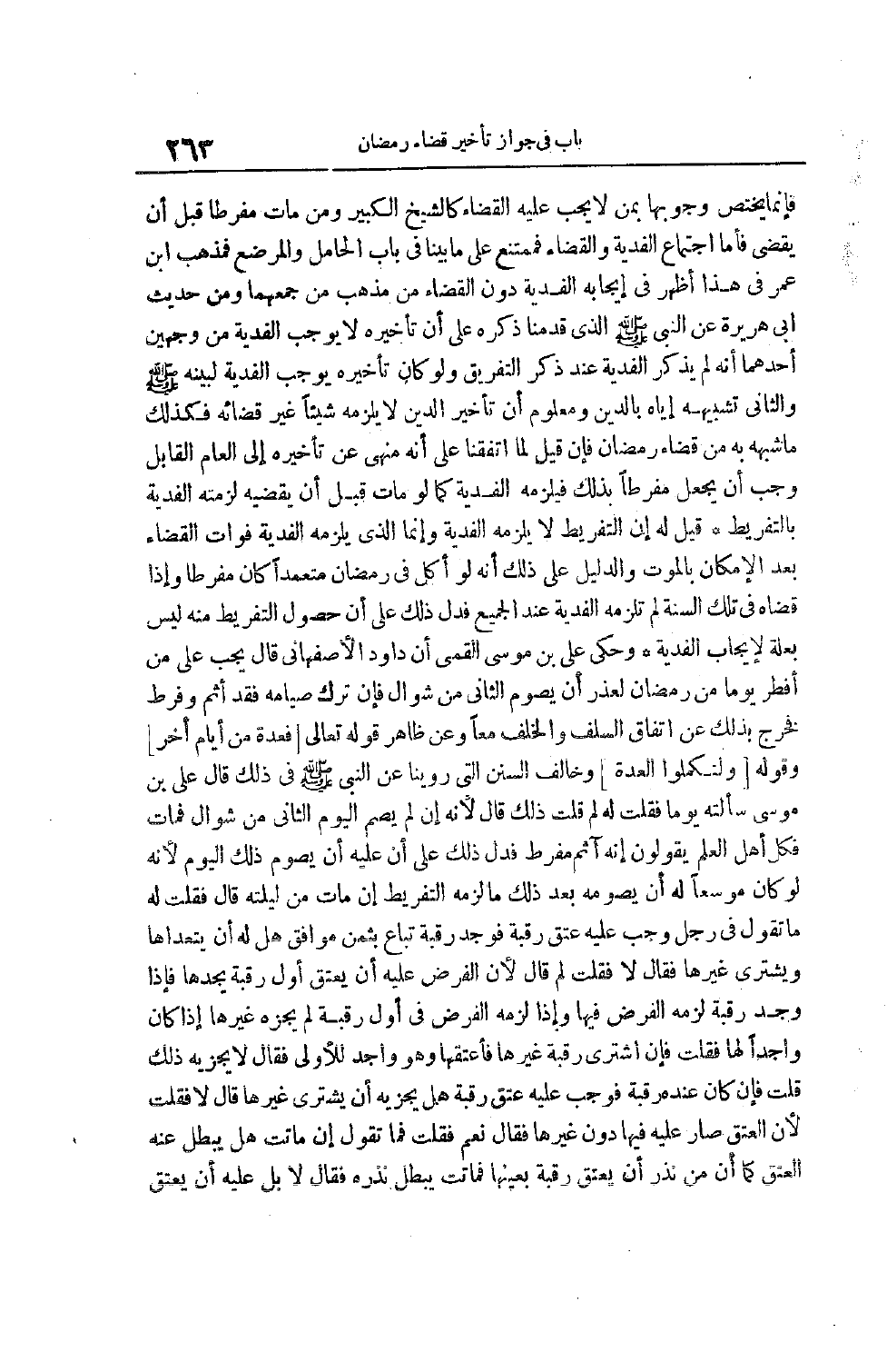 مِنْ رَمَضَانَ لِعُذْرٍ أَنْ يَصُومَ الثَّانِي مِنْ شَوَّالٍ فَإِنْ تَرَكَ صِيَامَهُ فَقَدْ أَثِمَ وَفَرَّطَ فَخَرَجَ بِذَلِكَ عَنْ اتِّفَاقِ السَّلَفِ وَالْخَلَفِ مَعًا وَعَنْ ظَاهِرِ قوله تعالى [فَعِدَّةٌ مِنْ أَيَّامٍ أُخَرَ] وقوله [وَلِتُكْمِلُوا الْعِدَّةَ] وَخَالَفَ السُّنَنَ الَّتِي رَوَيْنَا عَنْ النَّبِيِّ صَلَّى اللَّهُ عَلَيْهِ وَسَلَّمَ فِي ذَلِكَ قَالَ عَلِيُّ بن موسى سألته يوما فَقُلْتُ لَهُ لِمَ قُلْتَ ذَلِكَ قَالَ لِأَنَّهُ إنْ لَمْ يَصُمْ الْيَوْمَ الثَّانِي مِنْ شَوَّالٍ فَمَاتَ فَكُلُّ أَهْلِ الْعِلْمِ يَقُولُونَ إنَّهُ آثِمٌ مُفَرِّطٌ فَدَلَّ ذَلِكَ عَلَى أَنَّ عَلَيْهِ أَنْ يَصُومَ ذَلِكَ الْيَوْمَ لِأَنَّهُ لَوْ كَانَ مُوَسَّعًا لَهُ أَنْ يَصُومَهُ بَعْدَ ذَلِكَ مَا لَزِمَهُ التَّفْرِيطُ إنْ مَاتَ مِنْ لَيْلَتِهِ قَالَ فَقُلْتُ لَهُ مَا تَقُولُ فِي رَجُلٍ وَجَبَ عَلَيْهِ عِتْقُ رَقَبَةٍ فَوَجَدَ رَقَبَةً تُبَاعُ بِثَمَنٍ مُوَافِقٍ هَلْ لَهُ أَنْ يَتَعَدَّاهَا وَيَشْتَرِيَ غَيْرَهَا فَقَالَ لَا فَقُلْتُ لِمَ قَالَ لِأَنَّ الْفَرْضَ عَلَيْهِ أَنْ يُعْتِقْ أَوَّلَ رَقَبَةٍ يَجِدُهَا فَإِذَا وَجَدَ رقبة لزمه الفرض فيها وإذا لزمه الفرض فِي أَوَّلِ رَقَبَةٍ لَمْ يُجِزْهُ غَيْرُهَا إذَا كَانَ وَاجِدًا لَهَا فَقُلْتُ فَإِنَّ اشْتَرَى رَقَبَةً غيرها فأعتقها وَهُوَ وَاجِدٌ لِلْأُولَى فَقَالَ لَا يُجْزِيهِ ذَلِكَ قُلْتُ فَإِنْ كَانَ عِنْدَهُ رَقَبَةٌ فَوَجَبَ عَلَيْهِ عِتْقُ رَقَبَةٍ هَلْ يُجْزِيهِ أَنْ يَشْتَرِيَ غَيْرَهَا قَالَ لَا فَقُلْتُ لِأَنَّ الْعِتْقَ صَارَ عَلَيْهِ فِيهَا دُونَ غَيْرِهَا فَقَالَ نَعَمْ فَقُلْتُ فَمَا تَقُولُ إنْ مَاتَتْ هَلْ يَبْطُلُ عَنْهُ الْعِتْقُ كَمَا أَنَّ مَنْ نَذَرَ أَنْ يُعْتِقَ رَقَبَةً بِعَيْنِهَا فَمَاتَتْ يَبْطُلُ نَذْرُهُ فَقَالَ لَا بَلْ عَلَيْهِ أَنْ يُعْتِقَ