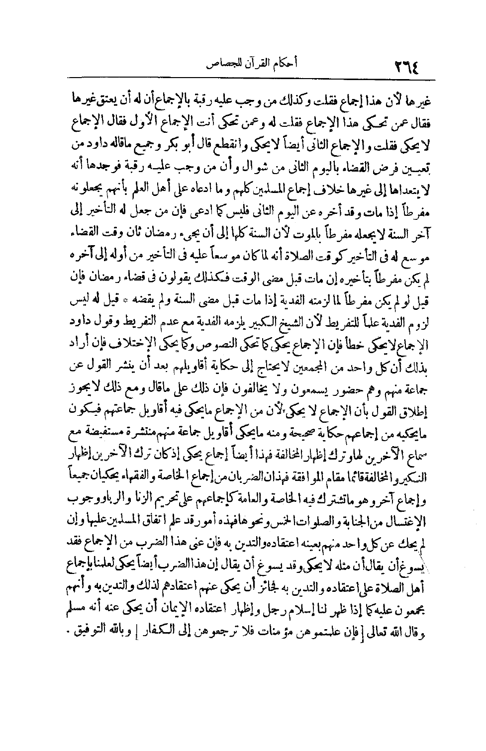 غَيْرَهَا لِأَنَّ هَذَا إجْمَاعٌ فَقُلْتُ وَكَذَلِكَ مَنْ وَجَبَ عَلَيْهِ رَقَبَةٌ بِالْإِجْمَاعِ أَنَّ لَهُ أَنْ يُعْتِقَ غَيْرَهَا فَقَالَ عَمَّنْ تَحْكِي هَذَا الْإِجْمَاعَ فَقُلْتُ لَهُ وَعَمَّنْ تَحْكِي أَنْتَ الْإِجْمَاعَ الْأَوَّلَ فَقَالَ الْإِجْمَاعُ لَا يُحْكَى فَقُلْتُ وَالْإِجْمَاعُ الثَّانِي أَيْضًا لَا يُحْكَى وَانْقَطَعَ قَالَ أَبُو بَكْرٍ وَجَمِيعُ مَا قَالَهُ دَاوُد مِنْ تَعْيِينِ فَرْضِ الْقَضَاءِ بِالْيَوْمِ الثَّانِي مِنْ شَوَّالٍ وَأَنَّ مَنْ وَجَبَ عَلَيْهِ رَقَبَةٌ فَوَجَدَهَا أَنَّهُ لَا يَتَعَدَّاهَا إلَى غَيْرِهَا خِلَافَ إجْمَاعِ الْمُسْلِمِينَ كُلِّهِمْ وَمَا ادَّعَاهُ عَلَى أَهْلِ الْعِلْمِ بِأَنَّهُمْ يَجْعَلُونَهُ مُفَرِّطًا إذَا مَاتَ وَقَدْ أَخَّرَهُ عَنْ الْيَوْمِ الثَّانِي فَلَيْسَ كَمَا ادَّعَى فَإِنَّ مَنْ جُعِلَ لَهُ التَّأْخِيرُ إلَى آخِرِ السَّنَةِ لَا يَجْعَلُهُ مُفَرِّطًا بِالْمَوْتِ لِأَنَّ السَّنَةَ كُلَّهَا إلَى أَنْ يَجِيءَ رَمَضَانُ ثَانٍ وَقْتَ الْقَضَاءِ مُوَسَّعٌ لَهُ فِي التَّأْخِيرِ كَوَقْتِ الصَّلَاةِ أَنَّهُ لَمَّا كَانَ مُوَسَّعًا عَلَيْهِ فِي التَّأْخِيرِ مِنْ أَوَّلَهُ إلَى آخِرِهِ لَمْ يَكُنْ مُفَرِّطًا بِتَأْخِيرِهِ إنْ مَاتَ قَبْلَ مُضِيِّ الْوَقْتِ فَكَذَلِكَ يَقُولُونَ فِي قَضَاءِ رَمَضَانَ فَإِنْ قِيلَ لَوْ لَمْ يَكُنْ مُفَرِّطًا لَمَا لَزِمَتْهُ الْفِدْيَةُ إذَا مَاتَ قَبْلَ مُضِيِّ السَّنَةِ وَلَمْ يَقْضِهِ قِيلَ لَهُ لَيْسَ لُزُومُ الْفِدْيَةِ عَلَمًا لِلتَّفْرِيطِ لِأَنَّ الشَّيْخَ الْكَبِيرَ يَلْزَمُهُ الْفِدْيَةُ مَعَ عَدَمِ التَّفْرِيطِ وَقَوْلُ دَاوُد الْإِجْمَاعُ لَا يُحْكَى خَطَأٌ فَإِنَّ الْإِجْمَاعَ يُحْكَى كَمَا تُحْكَى النُّصُوصُ وَكَمَا يُحْكَى الِاخْتِلَافُ فَإِنْ أَرَادَ بِذَلِكَ أَنَّ كُلَّ وَاحِدٍ مِنْ الْمُجْمِعِينَ لَا يَحْتَاجُ إلَى حِكَايَةِ أَقَاوِيلِهِمْ بَعْدَ أَنْ يُنْشَرَ الْقَوْلُ عَنْ جَمَاعَةٍ مِنْهُمْ وَهُمْ حُضُورٌ يَسْمَعُونَ وَلَا يُخَالِفُونَ فَإِنَّ ذَلِكَ عَلَى مَا قَالَ وَمَعَ ذَلِكَ لَا يَجُوزُ إطْلَاقُ الْقَوْلِ بِأَنَّ الْإِجْمَاعَ لَا يُحْكَى لِأَنَّ مِنْ الْإِجْمَاعِ مَا يُحْكَى فِيهِ أَقَاوِيلُ جَمَاعَتِهِمْ فَيَكُونُ مَا يَحْكِيهِ مِنْ إجْمَاعِهِمْ حِكَايَةً صَحِيحَةً وَمِنْهُ مَا يُحْكَى أَقَاوِيلُ جَمَاعَةٍ مِنْهُمْ مُنْتَشِرَةٌ مُسْتَفِيضَةٌ مَعَ سَمَاعِ الْآخَرِينَ لَهَا وَتَرْكِ إظْهَارِ الْمُخَالَفَةِ فَهَذَا أَيْضًا إجْمَاعٌ يُحْكَى إذْ كَانَ تَرْكُ الْآخَرِينَ إظْهَارَ النَّكِيرِ وَالْمُخَالَفَةِ قَائِمًا مَقَامَ الْمُوَافَقَةِ فَهَذَانِ الضَّرْبَانِ مِنْ إجْمَاعِ الْخَاصَّةِ وَالْفُقَهَاءِ يُحْكَيَانِ جَمِيعًا وَإِجْمَاعٌ آخَرُ وَهُوَ مَا تَشْتَرِكُ فِيهِ الْخَاصَّةُ وَالْعَامَّةُ كَإِجْمَاعِهِمْ عَلَى تَحْرِيمِ الزِّنَا وَالرِّبَا وَوُجُوبِ الِاغْتِسَالِ مِنْ الْجَنَابَةِ وَالصَّلَوَاتِ الْخَمْسِ وَنَحْوِهَا فَهَذِهِ أُمُورٌ قَدْ عُلِمَ اتِّفَاقُ الْمُسْلِمِينَ عَلَيْهَا وَإِنْ لَمْ يُحْكَ عَنْ كُلِّ وَاحِدٍ مِنْهُمْ بِعَيْنِهِ اعْتِقَادُهُ وَالتَّدَيُّنِ بِهِ فَإِنْ عُنِيَ هَذَا الضَّرْبُ مِنْ الْإِجْمَاعِ فَقَدْ يَسُوغُ أَنْ يُقَالَ إنَّ مِثْلَهُ لَا يُحْكَى وَقَدْ يَسُوغُ أَنْ يُقَالَ إنَّ هَذَا الضَّرْبَ أَيْضًا يُحْكَى لِعِلْمِنَا بِإِجْمَاعِ أَهْلِ الصَّلَاةِ عَلَى اعْتِقَادِهِ وَالتَّدَيُّنِ بِهِ فَجَائِزٌ أَنْ يُحْكَى عَنْهُمْ اعْتِقَادُهُمْ لِذَلِكَ وَالتَّدَيُّنُ بِهِ وَأَنَّهُمْ مُجْمِعُونَ عَلَيْهِ كَمَا إذَا ظَهَرَ لَنَا إسْلَامُ رَجُلٍ وَإِظْهَارُ اعْتِقَادِهِ الْإِيمَانَ أَنْ يُحْكَى عَنْهُ أَنَّ