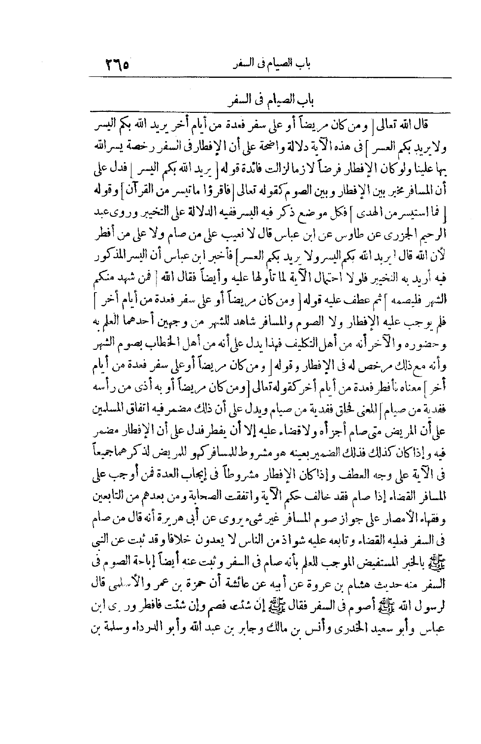 قَالَ اللَّهُ تَعَالَى [وَمَنْ كانَ مَرِيضاً أَوْ عَلى سَفَرٍ فَعِدَّةٌ مِنْ أَيَّامٍ أُخَرَ يُرِيدُ اللَّهُ بِكُمُ الْيُسْرَ وَلا يُرِيدُ بِكُمُ الْعُسْرَ] فِي هَذِهِ الْآيَةِ دَلَالَةٌ وَاضِحَةٌ عَلَى أَنَّ الْإِفْطَارَ فِي السَّفَرِ رُخْصَةٌ يَسَّرَ اللَّهُ بِهَا عَلَيْنَا وَلَوْ كَانَ الْإِفْطَارُ فَرْضًا لَازِمًا لَزَالَتْ فائدة قوله [يُرِيدُ اللَّهُ بِكُمُ الْيُسْرَ] فَدَلَّ عَلَى أَنَّ الْمُسَافِرَ مُخَيَّرٌ بَيْنَ الْإِفْطَارِ وبين الصوم كقوله تعالى [فَاقْرَؤُا ما تَيَسَّرَ مِنَ الْقُرْآنِ] وقوله [فَمَا اسْتَيْسَرَ مِنَ الْهَدْيِ] فَكُلُّ مَوْضِعٍ ذُكِرَ فِيهِ الْيُسْرُ فَفِيهِ الدَّلَالَةُ عَلَى التَّخْيِيرِ وَرَوَى عَبْدُ الرَّحِيمِ الْجَزَرِيُّ عَنْ طَاوُسٍ عَنْ ابْنِ عَبَّاسٍ قَالَ لَا نَعِيبُ عَلَى مَنْ صَامَ وَلَا عَلَى مَنْ أَفْطَرَ لِأَنَّ اللَّهَ قَالَ [يُرِيدُ اللَّهُ بِكُمُ الْيُسْرَ وَلا يُرِيدُ بِكُمُ الْعُسْرَ] فَأَخْبَرَ ابْنُ عَبَّاسٍ أَنَّ الْيُسْرَ الْمَذْكُورَ فِيهِ أُرِيدَ بِهِ التَّخْيِيرُ فَلَوْلَا احْتِمَالُ الْآيَةِ لَمَا تَأَوَّلَهَا عَلَيْهِ وَأَيْضًا فَقَالَ اللَّهُ [فَمَنْ شَهِدَ مِنْكُمُ الشَّهْرَ فَلْيَصُمْهُ] ثُمَّ عَطَفَ عَلَيْهِ قَوْلَهُ [وَمَنْ كانَ مَرِيضاً أَوْ عَلى سَفَرٍ فَعِدَّةٌ مِنْ أَيَّامٍ أُخَرَ] فَلَمْ يُوجِبْ عَلَيْهِ الْإِفْطَارَ وَلَا الصَّوْمَ وَالْمُسَافِرُ شَاهِدٌ لِلشَّهْرِ مِنْ وَجْهَيْنِ أَحَدُهُمَا الْعِلْمُ بِهِ وَحُضُورُهُ وَالْآخَرُ أَنَّهُ مِنْ أَهْلِ التَّكْلِيفِ فَهَذَا يَدُلُّ عَلَى أَنَّهُ مِنْ أَهْلِ الْخِطَابِ بِصَوْمِ الشَّهْرِ وَأَنَّهُ مَعَ ذَلِكَ مُرَخَّصٌ لَهُ فِي الْإِفْطَارِ وَقَوْلُهُ [وَمَنْ كانَ مَرِيضاً أَوْ عَلى سَفَرٍ فَعِدَّةٌ مِنْ أَيَّامٍ أُخَرَ] مَعْنَاهُ فَأَفْطَرَ فَعِدَّةٌ مِنْ أَيَّامٍ أُخَرَ كَقَوْلِهِ تَعَالَى [فَمَنْ كانَ مِنْكُمْ مَرِيضاً أَوْ بِهِ أَذىً مِنْ رَأْسِهِ فَفِدْيَةٌ مِنْ صِيامٍ] الْمَعْنَى فَحَلَقَ فَفِدْيَةٌ مِنْ صِيَامٍ وَيَدُلُّ عَلَى أَنَّ ذَلِكَ مُضْمَرٌ فِيهِ اتِّفَاقُ الْمُسْلِمِينَ عَلَى أَنَّ الْمَرِيضَ مَتَى صَامَ أَجْزَأَهُ وَلَا قَضَاءَ عَلَيْهِ إلَّا أَنْ يُفْطِرَ فَدَلَّ عَلَى أَنَّ الْإِفْطَارَ مُضْمَرٌ فِيهِ وَإِذَا كَانَ كَذَلِكَ فَذَلِكَ الضَّمِيرُ بِعَيْنِهِ هُوَ مَشْرُوطٌ لِلْمُسَافِرِ كَهُوَ لِلْمَرِيضِ لذكرهما جَمِيعًا فِي الْآيَةِ عَلَى وَجْهِ الْعَطْفِ وَإِذَا كَانَ الْإِفْطَارُ مَشْرُوطًا فِي إيجَابِ الْعِدَّةِ فَمَنْ أَوْجَبَ عَلَى الْمُسَافِرِ الْقَضَاءَ إذَا صَامَ فَقَدْ خَالَفَ حَكَمَ الْآيَةِ وَاتَّفَقَتْ الصَّحَابَةُ وَمَنْ بَعْدَهُمْ مِنْ التَّابِعِينَ وَفُقَهَاءِ الْأَمْصَارِ عَلَى جَوَازِ صَوْمِ الْمُسَافِرِ غَيْرَ شَيْءٍ
