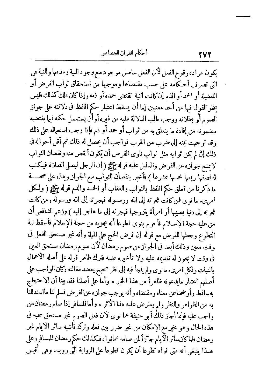 يَكُونَ مُرَادُهُ وُقُوعَ الْفِعْلِ لِأَنَّ الْفِعْلَ حَاصِلٌ مَوْجُودٌ مَعَ وُجُودِ النِّيَّةِ وَعَدَمِهَا وَالنِّيَّةُ هِيَ الَّتِي تُصَرِّفُ أَحْكَامَهُ عَلَى حَسَبِ مُقْتَضَاهَا وَمُوجِبِهَا مِنْ اسْتِحْقَاقِ ثَوَابِ الْفَرْضِ أَوْ الْفَضِيلَةِ أَوْ الْحَمْدِ أَوْ الذَّمِّ إنْ كَانَتْ النِّيَّةُ تَقْتَضِي حَمْدَهُ أَوْ ذَمَّهُ وَإِذَا كَانَ ذَلِكَ كَذَلِكَ فَلَيْسَ يَخْلُو الْقَوْلُ فِيهَا مِنْ أَحَدِ مَعْنَيَيْنِ إمَّا أَنْ يَسْقُطَ اعْتِبَارُ حُكْمِ اللَّفْظِ فِي دَلَالَتِهِ عَلَى جَوَازِ الصَّوْمِ أَوْ بُطْلَانِهِ وَوَجَبَ طَلَبُ الدَّلَالَةِ عَلَيْهِ مِنْ غَيْرِهِ أَوْ أَنْ يُسْتَعْمَلَ حُكْمُهُ فِيمَا يَقْتَضِيهِ مَضْمُونُهُ مِنْ إفَادَةِ مَا يَتَعَلَّقُ بِهِ مِنْ ثَوَابٍ أَوْ حمد أو ذم فإذا وجب استعماله عَلَى ذَلِكَ وَقَدْ تَوَجَّهَتْ نِيَّتُهُ إلَى ضَرْبٍ مِنْ الْقُرْبِ فَوَاجِبٌ أَنْ يَحْصُلَ لَهُ ذَلِكَ ثُمَّ أَقَلُّ أَحْوَالِهِ فِي ذَلِكَ إنْ لَمْ يَكُنْ ثَوَابُهُ مِثْلَ ثَوَابِ نَاوِي الْفَرْضِ أَنْ يَكُونَ أُنْقَصَ مِنْهُ وَنُقْصَانُ الثَّوَابِ لَا يَمْنَعُ جَوَازَهُ عَنْ الْفَرْضِ وَالدَّلِيلُ عَلَيْهِ