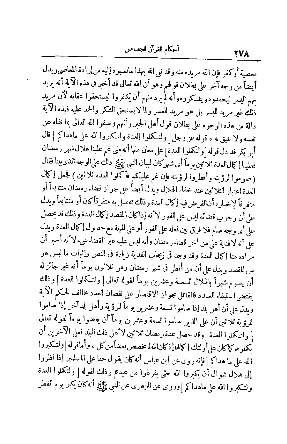 مَعْصِيَةٍ أَوْ كُفْرٍ فَإِنَّ اللَّهَ مُرِيدُهُ مِنْهُ وَقَدْ نَفَى اللَّهُ بِهَذَا مَا نَسَبُوهُ إلَيْهِ مِنْ إرَادَةِ الْمَعَاصِي وَيَدُلُّ أَيْضًا مِنْ وَجْهٍ آخَرَ عَلَى بُطْلَانِ قَوْلِهِمْ وَهُوَ أَنَّ اللَّهَ تَعَالَى قَدْ أَخْبَرَ فِي هَذِهِ الْآيَةِ أَنَّهُ يُرِيدُ بِهِمْ الْيُسْرَ لِيَحْمَدُوهُ وَيَشْكُرُوهُ وَأَنَّهُ لَمْ يُرِدْ مِنْهُمْ أَنْ يَكْفُرُوا لِيَسْتَحِقُّوا عِقَابَهُ لِأَنَّ مُرِيدَ ذَلِكَ غَيْرُ مُرِيدٍ لِلْيُسْرِ بَلْ هُوَ مُرِيدٌ لِلْعُسْرِ وَلِمَا لَا يَسْتَحِقُّ الشُّكْرَ وَالْحَمْدَ عَلَيْهِ فَهَذِهِ الْآيَةُ دَالَّةٌ مِنْ هَذِهِ الْوُجُوهِ عَلَى بُطْلَانِ قَوْلِ أَهْلِ الْجَبْرِ وَأَنَّهُمْ وَصَفُوا اللَّهَ تَعَالَى بِمَا نَفَاهُ عَنْ نَفْسِهِ وَلَا يَلِيقُ بِهِ قَوْلُهُ عَزَّ وَجَلَّ [وَلِتُكْمِلُوا الْعِدَّةَ وَلِتُكَبِّرُوا اللَّهَ عَلى ما هَداكُمْ] قَالَ أَبُو بَكْرٍ قَدْ دَلَّ قَوْلُهُ [وَلِتُكْمِلُوا الْعِدَّةَ] عَلَى مَعَانٍ مِنْهَا أَنَّهُ مَتَى غُمَّ عَلَيْنَا هِلَالُ شَهْرِ رَمَضَانَ فَعَلَيْنَا إكْمَالُ الْعِدَّةِ ثَلَاثِينَ يَوْمًا أَيَّ شَهْرٍ كَانَ لِبَيَانِ النَّبِيِّ صَلَّى اللَّهُ عَلَيْهِ وَسَلَّمَ ذَلِكَ عَلَى الْوَجْهِ الَّذِي بَيَّنَّا