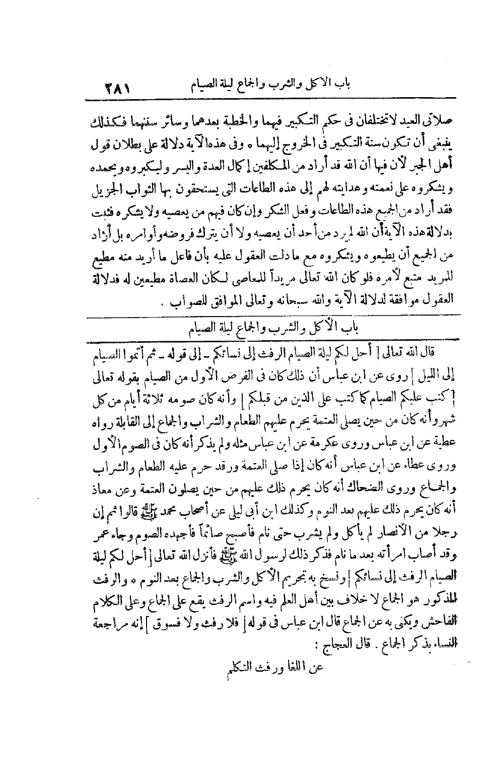 قَالَ اللَّهُ تَعَالَى [أُحِلَّ لَكُمْ لَيْلَةَ الصِّيامِ الرَّفَثُ إِلى نِسائِكُمْ- إلَى قَوْلِهِ- ثُمَّ أَتِمُّوا الصِّيامَ إِلَى اللَّيْلِ] رُوِيَ عَنْ ابْنِ عَبَّاسٍ أَنَّ ذَلِكَ كَانَ فِي الْفَرْضِ الْأَوَّلِ مِنْ الصِّيَامِ بِقَوْلِهِ تَعَالَى [كُتِبَ عَلَيْكُمُ الصِّيامُ كَما كُتِبَ عَلَى الَّذِينَ مِنْ قَبْلِكُمْ] وأنه كان صومه ثَلَاثَةِ أَيَّامٍ مِنْ كُلِّ شَهْرٍ وَأَنَّهُ كَانَ مِنْ حِينِ يُصَلِّي الْعَتَمَةَ يَحْرُمُ عَلَيْهِمْ الطَّعَامُ وَالشَّرَابُ وَالْجِمَاعُ إلَى الْقَابِلَةِ رَوَاهُ عَطِيَّةُ عَنْ ابْنِ عَبَّاسٍ وَرَوَى عِكْرِمَةُ عَنْ ابْنِ عَبَّاسٍ مِثْلَهُ وَلَمْ يَذْكُرْ أَنَّهُ كَانَ فِي الصَّوْمِ الْأَوَّلِ وَرَوَى عَطَاءٌ عَنْ ابْنِ عَبَّاسٍ أَنَّهُ كَانَ إذَا صَلَّى الْعَتَمَةَ وَرَقَدَ حَرُمَ عَلَيْهِ الطَّعَامُ وَالشَّرَابُ وَالْجِمَاعُ وَرَوَى الضَّحَّاكُ أَنَّهُ كَانَ يُحَرِّمُ ذَلِكَ عَلَيْهِمْ مِنْ حِينِ يُصَلُّونَ الْعَتَمَةَ وَعَنْ مُعَاذٍ أَنَّهُ كَانَ يُحَرِّمُ ذَلِكَ عَلَيْهِمْ بَعْدَ النَّوْمِ وَكَذَلِكَ ابْنُ أَبِي لَيْلَى عَنْ أَصْحَابِ مُحَمَّدٍ صَلَّى اللَّهُ عَلَيْهِ وَسَلَّمَ قَالُوا ثُمَّ إنَّ رَجُلًا مِنْ الْأَنْصَارِ لَمْ يَأْكُلْ وَلَمْ يَشْرَبْ حَتَّى نَامَ فَأَصْبَحَ صَائِمًا فَأَجْهَدَهُ الصَّوْمُ وَجَاءَ عُمَرُ وَقَدْ أَصَابَ امْرَأَتَهُ بَعْدَ مَا نَامَ فَذَكَرَ ذَلِكَ لِرَسُولِ اللَّه صَلَّى اللَّهُ عَلَيْهِ وَسَلَّمَ فَأَنْزَلَ اللَّهُ تَعَالَى [أُحِلَّ لَكُمْ لَيْلَةَ الصِّيامِ الرَّفَثُ إِلى نِسائِكُمْ] وَنَسَخَ بِهِ تَحْرِيمَ الْأَكْلِ وَالشُّرْبِ وَالْجِمَاعِ بَعْدَ النوم