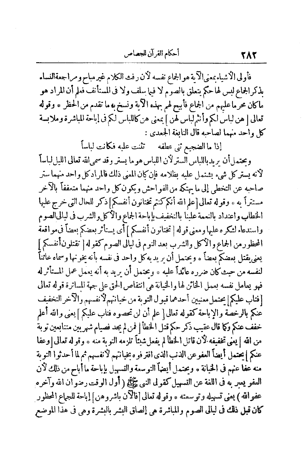 وَيُحْتَمَلُ أَنْ يُرِيدَ بِاللِّبَاسِ السِّتْرُ لِأَنَّ اللِّبَاسَ هُوَ مَا يَسْتُرُ وَقَدْ سَمَّى اللَّهُ تَعَالَى اللَّيْلَ لِبَاسَا لِأَنَّهُ يَسْتُرُ كُلَّ شَيْءٍ يَشْتَمِلُ عَلَيْهِ بِظَلَامِهِ فَإِنْ كَانَ الْمَعْنَى ذَلِكَ فَالْمُرَادُ كُلُّ وَاحِدٍ مِنْهُمَا سَتَرَ صَاحِبَهُ عَنْ التَّخَطِّي إلَى مَا يَهْتِكُهُ مِنْ الْفَوَاحِشِ وَيَكُونُ كُلُّ وَاحِدٍ مِنْهُمَا مُتَعَفِّفًا بِالْآخَرِ مُسْتَتِرَا بِهِ وقَوْله تَعَالَى [عَلِمَ اللَّهُ أَنَّكُمْ كُنْتُمْ تَخْتانُونَ أَنْفُسَكُمْ] ذِكْرٌ لِلْحَالِ الَّتِي خَرَجَ عَلَيْهَا الْخِطَابُ وَاعْتِدَادٌ بِالنِّعْمَةِ عَلَيْنَا بِالتَّخْفِيفِ بِإِبَاحَةِ الْجِمَاعِ وَالْأَكْلِ وَالشُّرْبِ فِي لَيَالِي الصَّوْمِ وَاسْتِدْعَاءٌ لِشُكْرِهِ عَلَيْهَا وَمَعْنَى قوله [تَخْتانُونَ أَنْفُسَكُمْ] أَيْ يَسْتَأْثِرُ بَعْضُكُمْ بَعْضًا فِي مُوَاقَعَةِ الْمَحْظُورِ مِنْ الْجِمَاعِ وَالْأَكْلِ وَالشُّرْبِ بَعْدَ النَّوْمِ فِي ليالي الصوم كقوله [تَقْتُلُونَ أَنْفُسَكُمْ] يَعْنِي يَقْتُلُ بَعْضُكُمْ بَعْضًا وَيُحْتَمَلُ أَنْ يُرِيدَ بِهِ كُلَّ وَاحِدٍ فِي نَفْسِهِ بِأَنَّهُ يَخُونُهَا وَسَمَّاهُ خَائِنًا لِنَفْسِهِ مِنْ حَيْثُ كَانَ ضَرَرُهُ عَائِدًا عَلَيْهِ وَيُحْتَمَلُ أَنْ يُرِيدَ بِهِ أَنَّهُ يَعْمَلُ عَمَلَ الْمُسْتَأْثِرِ لَهُ فَهُوَ يُعَامِلُ نَفْسَهُ بِعَمَلِ الْخَائِنِ لَهَا وَالْخِيَانَةُ هِيَ انْتِقَاصُ الْحَقِّ على جهة المساترة قوله تعالى [فَتابَ عَلَيْكُمْ] يَحْتَمِلُ مَعْنَيَيْنِ أَحَدُهُمَا قَبُولُ التَّوْبَةِ مِنْ خِيَانَتِهِمْ لِأَنْفُسِهِمْ وَالْآخَرُ التَّخْفِيفُ عَنْكُمْ بِالرُّخْصَةِ وَالْإِبَاحَةِ كَقَوْلِهِ تَعَالَى [عَلِمَ أَنْ لَنْ تُحْصُوهُ فَتابَ عَلَيْكُمْ] يَعْنِي وَاَللَّهُ أَعْلَمُ خَفَّفَ عَنْكُمْ وَكَمَا قَالَ عَقِيبَ ذِكْرِ حُكْمِ قَتْلِ الْخَطَإِ [فَمَنْ لَمْ يَجِدْ فَصِيامُ شَهْرَيْنِ مُتَتابِعَيْنِ تَوْبَةً مِنَ اللَّهِ] يَعْنِي تَخْفِيفَهُ. لِأَنَّ قَاتِلَ الْخَطَأ لَمْ يَفْعَلْ شَيْئًا تَلْزَمُهُ التَّوْبَةُ مِنْهُ وقَوْله تَعَالَى [وَعَفا عَنْكُمْ] يَحْتَمِلُ أَيْضًا الْعَفْوَ عَنْ الذَّنْبِ الَّذِي اقْتَرَفُوهُ بِخِيَانَتِهِمْ لِأَنْفُسِهِمْ ثُمَّ لَمَّا أَحْدَثُوا التَّوْبَةَ مِنْهُ عَفَا عَنْهُمْ فِي الْخِيَانَةِ وَيُحْتَمَلُ أَيْضًا التَّوْسِعَةُ وَالتَّسْهِيلُ بِإِبَاحَةِ مَا أَبَاحَ مِنْ ذَلِكَ لِأَنَّ الْعَفْوَ يُعَبَّرُ بِهِ فِي اللُّغَةِ عَنْ التَّسْهِيلِ