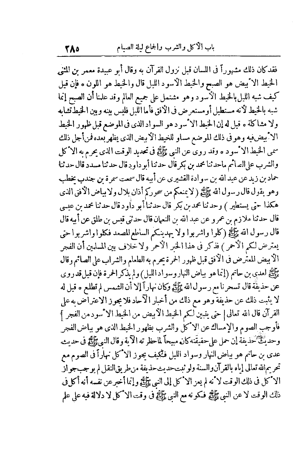 فَقَدْ كَانَ ذَلِكَ مَشْهُورًا فِي اللِّسَانِ قَبَلَ نُزُولِ الْقُرْآنِ بِهِ وَقَالَ أَبُو عُبَيْدَةَ مَعْمَرُ بْنُ الْمُثَنَّى الْخَيْطُ الْأَبْيَضُ هُوَ الصُّبْحُ وَالْخَيْطُ الْأَسْوَدُ اللَّيْلُ قَالَ وَالْخَيْطُ هُوَ اللَّوْنُ فَإِنْ قِيلِ كَيْفَ شَبَّهَ اللَّيْلَ بِالْخَيْطِ الْأَسْوَدِ وَهُوَ مُشْتَمِلٌ عَلَى جَمِيعِ الْعَالَمِ وَقَدْ عَلِمْنَا أَنَّ الصُّبْحَ إنَّمَا شُبِّهَ بِالْخَيْطِ لِأَنَّهُ مُسْتَطِيلٌ أَوْ مُسْتَعْرِضٌ فِي الْأُفُقِ فَأَمَّا اللَّيْلُ فَلَيْسَ بَيْنَهُ وَبَيْنَ الْخَيْطِ تَشَابُهٌ وَلَا مُشَاكَلَةٌ قِيلَ لَهُ إنَّ الْخَيْطَ الْأَسْوَدَ هُوَ السَّوَادُ الَّذِي فِي الْمَوْضِعِ قَبْلَ ظُهُورِ الْخَيْطِ الْأَبْيَضِ فِيهِ وَهُوَ فِي ذَلِكَ الْمَوْضِعِ مُسَاوٍ لِلْخَيْطِ الْأَبْيَضِ الَّذِي يَظْهَرُ بَعْدَهُ فَمِنْ أَجْلِ ذَلِكَ سُمِّيَ الْخَيْطُ الْأَسْوَدُ وَقَدْ رُوِيَ عَنْ النَّبِيِّ صَلَّى اللَّهُ عَلَيْهِ وَسَلَّمَ فِي تَحْدِيدِ الْوَقْتِ الَّذِي يَحْرُمُ بِهِ الْأَكْلُ وَالشُّرْبُ عَلَى الصَّائِمِ مَا