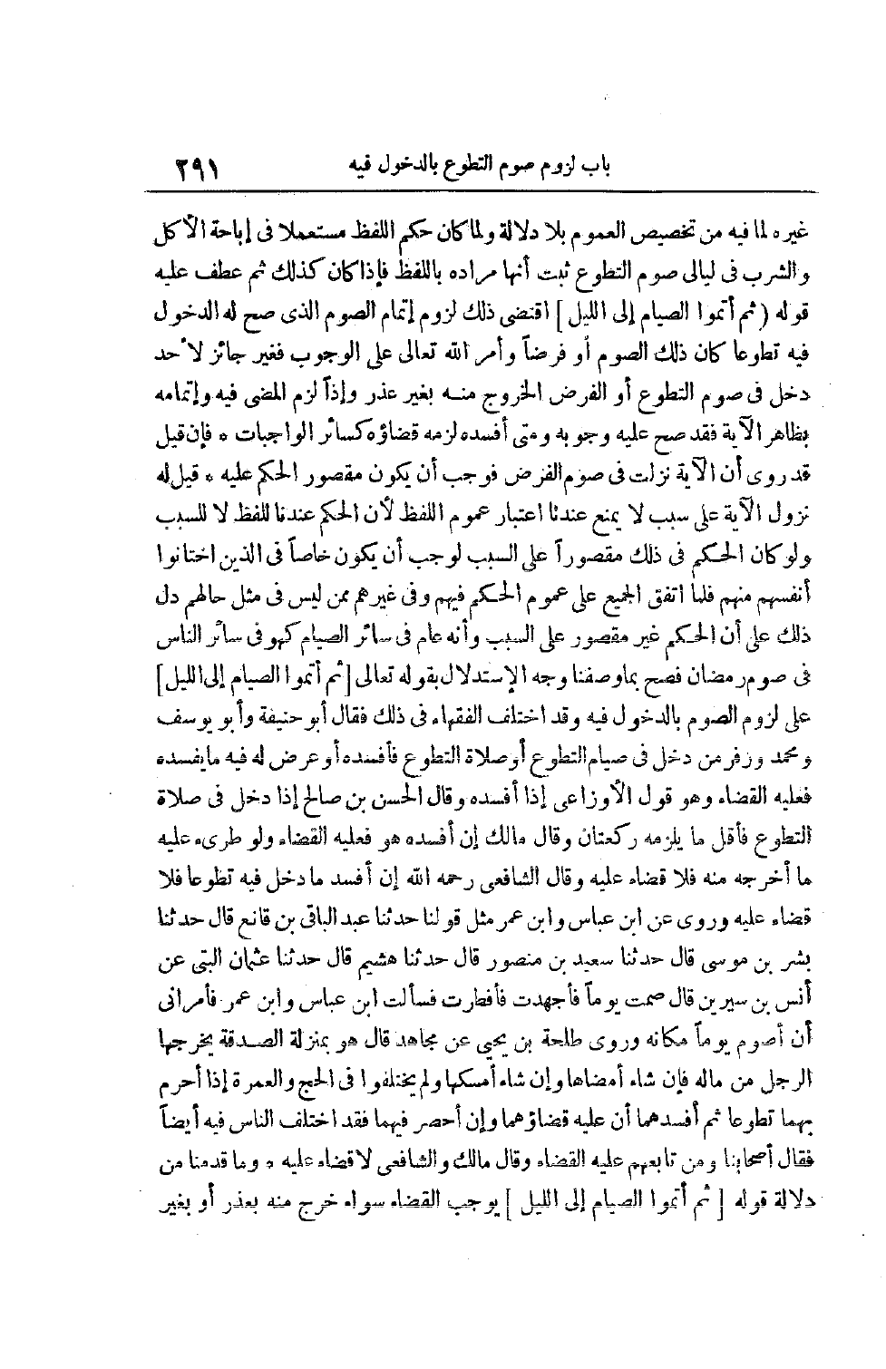 غَيْرِهِ لِمَا فِيهِ مِنْ تَخْصِيصِ الْعُمُومِ بِلَا دَلَالَةٍ وَلَمَّا كَانَ حُكْمُ اللَّفْظِ مُسْتَعْمَلًا فِي إبَاحَةِ الْأَكْلِ وَالشُّرْبِ فِي لَيَالِي صَوْمِ التَّطَوُّعِ ثَبَتَ أَنَّهَا مُرَادَةٌ بِاللَّفْظِ فَإِذَا كَانَ كَذَلِكَ ثُمَّ عَطَفَ عَلَيْهِ قَوْلَهُ ( [ثُمَّ أَتِمُّوا الصِّيامَ إِلَى اللَّيْلِ] اقْتَضَى ذَلِكَ لُزُومَ إتْمَامِ الصَّوْمِ الَّذِي صَحَّ لَهُ الدُّخُولُ فِيهِ تَطَوُّعًا كَانَ ذَلِكَ الصَّوْمُ أو فرضا وأمر اللَّهِ تَعَالَى عَلَى الْوُجُوبِ فَغَيْرُ جَائِزٍ لِأَحَدٍ دَخَلَ فِي صَوْمِ التَّطَوُّعِ أَوْ الْفَرْضِ الْخُرُوجُ مِنْهُ بِغَيْرِ عُذْرٍ وَإِذَا لَزِمَ الْمُضِيُّ فِيهِ وَإِتْمَامُهُ بِظَاهِرِ الْآيَةِ فَقَدْ صَحَّ عَلَيْهِ وُجُوبُهُ وَمَتَى أَفْسَدَهُ لَزِمَهُ قَضَاؤُهُ كَسَائِرِ الْوَاجِبَاتِ فَإِنْ قِيلَ قَدْ رُوِيَ أَنَّ الْآيَةَ نَزَلَتْ فِي صَوْمِ الْفَرْضِ فَوَجَبَ أَنْ يَكُونَ مَقْصُورُ الْحُكْمِ عَلَيْهِ قِيلَ لَهُ نُزُولُ الْآيَةِ عَلَى سَبَبٍ لَا يَمْنَعُ عِنْدَنَا اعْتِبَارَ عُمُومِ اللَّفْظِ لِأَنَّ الْحُكْمَ عِنْدَنَا لِلَّفْظِ لَا لِلسَّبَبِ وَلَوْ كَانَ الْحُكْمُ فِي ذَلِكَ مَقْصُورًا عَلَى السَّبَبِ لَوَجَبَ أَنْ يَكُونَ خَاصًّا فِي الَّذِينَ اخْتَانُوا أَنْفُسَهُمْ مِنْهُمْ فَلَمَّا اتَّفَقَ الْجَمِيعُ عَلَى عُمُومِ الْحُكْمِ فِيهِمْ وَفِي غَيْرِهِمْ مِمَّنْ لَيْسَ فِي مِثْلِ حَالِهِمْ دَلَّ ذَلِكَ عَلَى أَنَّ الْحُكْمَ غَيْرُ مَقْصُورٍ عَلَى السَّبَبِ وَأَنَّهُ عَامٌّ فِي سَائِرِ الصِّيَامِ كَهُوَ فِي سَائِر النَّاسِ فِي صَوْمِ رمضان فصح بِمَا وَصَفْنَا وَجْهُ الِاسْتِدْلَالِ بِقَوْلِهِ تَعَالَى [ثُمَّ أَتِمُّوا الصِّيامَ إِلَى اللَّيْلِ] عَلَى لُزُومِ الصَّوْمِ بِالدُّخُولِ فِيهِ وَقَدْ اخْتَلَفَ الْفُقَهَاءُ فِي ذَلِكَ فَقَالَ أَبُو حَنِيفَةَ وَأَبُو يُوسُفَ وَمُحَمَّدٌ وَزُفَرُ مَنْ دَخَلَ فِي صِيَامِ التَّطَوُّعِ أَوْ صَلَاةِ التَّطَوُّعِ فَأَفْسَدَهُ أَوْ عَرَضَ لَهُ فِيهِ مَا يُفْسِدُهُ فَعَلَيْهِ الْقَضَاءُ وَهُوَ قَوْلُ الْأَوْزَاعِيِّ إذَا أَفْسَدَهُ وَقَالَ الْحَسَنُ بْنُ صَالِحٍ إذَا دَخَلَ فِي صَلَاةِ التَّطَوُّعِ فَأَقَلُّ مَا يَلْزَمُهُ رَكْعَتَانِ وَقَالَ مَالِكٌ إنْ أَفْسَدَهُ هو فعليه القضاء ولو طرئ عَلَيْهِ مَا أَخْرَجَهُ مِنْهُ فَلَا قَضَاءَ عَلَيْهِ وقال الشافعى رحمه الله إن أفسد ما دخل فيه تطوعا فَلَا قَضَاءَ عَلَيْهِ وَرُوِيَ عَنْ ابْنِ عَبَّاسٍ وَابْنِ عُمَرَ مِثْلُ قَوْلِنَا حَدَّثَنَا عَبْدُ الْبَاقِي بْنُ قَانِعٍ قَالَ حَدَّثَنَا بشر بن موسى قَالَ حَدَّثَنَا سَعِيدُ بْنُ مَنْصُورٍ قَالَ حَدَّثَنَا هُشَيْمٌ قَالَ حَدَّثَنَا عُثْمَانُ الْبَتِّيُّ عَنْ أَنَسِ بْنِ سِيرِينَ قَالَ صُمْتُ يَوْمًا فَأُجْهِدْتُ فَأَفْطَرْتُ فسألت ابن عباس وابن عمر فأمر انى أَنْ أَصُومَ يَوْمًا مَكَانَهُ وَرَوَى طَلْحَةُ بْنُ يَحْيَى عَنْ مُجَاهِدٍ قَالَ هُوَ بِمَنْزِلَةِ الصَّدَقَةِ يُخْرِجُهَا الرَّجُلُ مِنْ مَالِهِ فَإِنْ شَاءَ أَمْضَاهَا وَإِنْ شَاءَ أَمْسَكَهَا وَلَمْ يَخْتَلِفُوا فِي الْحَجِّ وَالْعُمْرَةِ إذَا أَحْرَمَ بِهِمَا تَطَوُّعًا ثُمَّ أَفْسَدَهُمَا أن عليه قضاؤهما وَإِنْ أُحْصِرَ فِيهِمَا فَقَدْ اخْتَلَفَ النَّاسُ فِيهِ أَيْضًا فَقَالَ أَصْحَابُنَا وَمَنْ تَابَعَهُمْ عَلَيْهِ الْقَضَاءُ وَقَالَ مَالِكٌ وَالشَّافِعِيُّ لَا قَضَاءَ عَلَيْهِ وَمَا قَدَّمْنَا مِنْ دَلَالَةِ قَوْلِهِ [ثُمَّ أَتِمُّوا الصِّيامَ إِلَى اللَّيْلِ] يُوجِبُ الْقَضَاءَ سَوَاءٌ خَرَجَ مِنْهُ بِعُذْرٍ أَوْ بغير