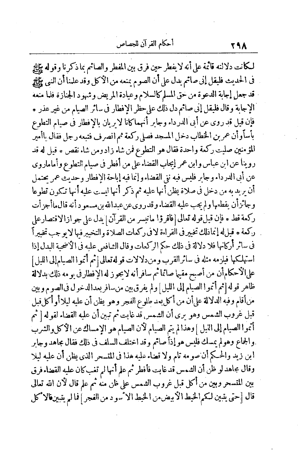 يَدُلُّ عَلَى أَنَّ الصَّوْم يَمْنَعُهُ مِنْ الْأَكْلِ وَقَدْ عَلِمْنَا أَنَّ النَّبِيَّ صَلَّى اللَّهُ عَلَيْهِ وَسَلَّمَ قَدْ جَعَلَ إجَابَةَ الدَّعْوَةِ مِنْ حَقِّ الْمُسْلِمِ كَالسَّلَامِ وَعِيَادَةِ الْمَرِيضِ وَشُهُودِ الْجِنَازَةِ فَلَمَّا مَنَعَهُ الْإِجَابَةَ وَقَالَ فَلْيَقُلْ إنِّي صَائِمٌ دَلَّ ذَلِكَ عَلَى حَظْرِ الْإِفْطَارِ فِي سَائِرِ الصِّيَامِ مِنْ غَيْرِ عُذْرٍ فَإِنْ قِيلَ قَدْ رُوِيَ عَنْ أَبِي الدَّرْدَاءِ وَجَابِرٍ أَنَّهُمَا كَانَا لَا يَرَيَانِ بِالْإِفْطَارِ فِي صِيَامِ التَّطَوُّعِ بَأْسًا وَأَنَّ عُمَرَ بْنَ الْخَطَّابِ دَخَلَ الْمَسْجِدَ فَصَلَّى رَكْعَةً ثُمَّ انْصَرَفَ فَتَبِعَهُ رَجُلٌ فَقَالَ يَا أَمِيرَ الْمُؤْمِنِينَ صَلَّيْتَ رَكْعَةً وَاحِدَةً فَقَالَ هُوَ التَّطَوُّعُ فَمَنْ شَاءَ زَادَ وَمَنْ شَاءَ نَقَصَ قِيلَ لَهُ قَدْ رَوَيْنَا عَنْ ابْنِ عَبَّاسٍ وَابْنِ عُمَرَ إيجَابَ الْقَضَاءِ عَلَى مَنْ أَفْطَرَ فِي صِيَامِ التَّطَوُّعِ وَأَمَّا مَا رُوِيَ عَنْ أَبِي الدَّرْدَاءِ وَجَابِرٍ فَلَيْسَ فِيهِ نَفْيُ الْقَضَاءِ وَإِنَّمَا فِيهِ إبَاحَةُ الْإِفْطَارِ وَحَدِيثُ عُمَرَ يَحْتَمِلُ أَنْ يُرِيدَ بِهِ مَنْ دَخَلَ فِي صَلَاةٍ يَظُنُّ أَنَّهَا عَلَيْهِ ثُمَّ ذَكَرَ أَنَّهَا لَيْسَتْ عَلَيْهِ أَنَّهَا تَكُونُ تَطَوُّعًا وَجَائِزٌ أَنْ يَقْطَعَهَا وَلَمْ يَجِبْ عَلَيْهِ الْقَضَاءُ وَقَدْ رُوِيَ عَنْ عَبْدِ اللَّهِ بْنِ مَسْعُودٍ أَنَّهُ قَالَ مَا أَجْزَأَتْ رَكْعَةٌ قَطُّ فإن قيل قوله تعالى [فَاقْرَؤُا ما تَيَسَّرَ مِنَ الْقُرْآنِ] يَدُلُّ عَلَى جَوَازِ الِاقْتِصَارِ عَلَى رَكْعَةٍ قِيلَ له إنما ذلك تخيير فِي الْقِرَاءَةِ لَا فِي رَكَعَاتِ الصَّلَاةِ وَالتَّخْيِيرُ فِيهَا لَا يُوجِبُ تَخْيِيرًا فِي سَائِرِ أَرْكَانِهَا فلا دلالة في ذلك حُكْمِ الرَّكَعَاتِ وَقَالَ الشَّافِعِيُّ عَلَيْهِ فِي الْأُضْحِيَّةِ الْبَدَلُ إذَا اسْتَهْلَكَهَا فَيَلْزَمُهُ مِثْلُهُ فِي سَائِرِ الْقُرَبِ وَمِنْ دَلَالَاتِ قَوْله تَعَالَى [ثُمَّ أَتِمُّوا الصِّيامَ إِلَى اللَّيْلِ] عَلَى الْأَحْكَامِ أَنَّ مَنْ أَصْبَحَ مُقِيمًا صَائِمًا ثُمَّ سَافَرَ أَنَّهُ لَا يَجُوزُ لَهُ الْإِفْطَارُ فِي يَوْمِهِ ذَلِكَ بِدَلَالَةِ ظَاهِرِ قَوْلِهِ [ثُمَّ أَتِمُّوا الصِّيامَ إِلَى اللَّيْلِ] وَلَمْ يُفَرِّقْ بَيْنَ مَنْ سَافَرَ بَعْدَ الدُّخُولِ فِي الصَّوْمِ وَبَيْنَ مَنْ أَقَامَ وَفِيهِ الدَّلَالَةُ عَلَى أَنَّ مَنْ أَكَلَ بَعْدَ طُلُوعِ الْفَجْرِ وَهُوَ يَظُنُّ أَنَّ عَلَيْهِ لَيْلًا أَوْ أَكَلَ قبل قَبْلَ غُرُوبِ الشَّمْسِ وَهُوَ يَرَى أَنَّ الشَّمْسَ قَدْ غَابَتْ ثُمَّ تَبَيَّنَ أَنَّ عَلَيْهِ الْقَضَاءَ لقوله [ثُمَّ أَتِمُّوا الصِّيامَ إِلَى اللَّيْلِ] وَهَذَا لَمْ يُتِمَّ الصِّيَامَ لِأَنَّ الصِّيَامَ هُوَ الْإِمْسَاكُ عَنْ الْأَكْلِ وَالشُّرْبِ وَالْجِمَاعِ وَهُوَ لَمْ يُمْسِكْ فَلَيْسَ هُوَ إذًا صَائِمٌ وَقَدْ اخْتَلَفَ السلف في ذلك فقال مجاهد وجابر ابن زَيْدٍ وَالْحَكَمُ إنَّ صَوْمَهُ تَامٌّ وَلَا قَضَاءَ عَلَيْهِ هَذَا فِي الْمُتَسَحِّرِ الَّذِي يَظُنُّ أَنَّ عَلَيْهِ لَيْلًا وَقَالَ مُجَاهِدٌ لَوْ ظَنَّ أَنَّ الشَّمْسَ قَدْ غَابَتْ فَأَفْطَرَ ثُمَّ عَلِمَ أَنَّهَا لَمْ تَغِبْ كَانَ عَلَيْهِ الْقَضَاءُ فَرَّقَ بَيْنَ الْمُتَسَحِّرِ وَبَيْنَ مَنْ أَكَلَ قَبْلَ غُرُوبِ الشَّمْسِ عَلَى ظَنٍّ مِنْهُ ثُمَّ عَلِمَ قَالَ لِأَنَّ اللَّهَ تَعَالَى قَالَ [حَتَّى يَتَبَيَّنَ لَكُمُ الْخَيْطُ الْأَبْيَضُ مِنَ الْخَيْطِ الْأَسْوَدِ مِنَ الْفَجْرِ] فَمَا لَمْ يَتَبَيَّنْ فَالْأَكْلُ