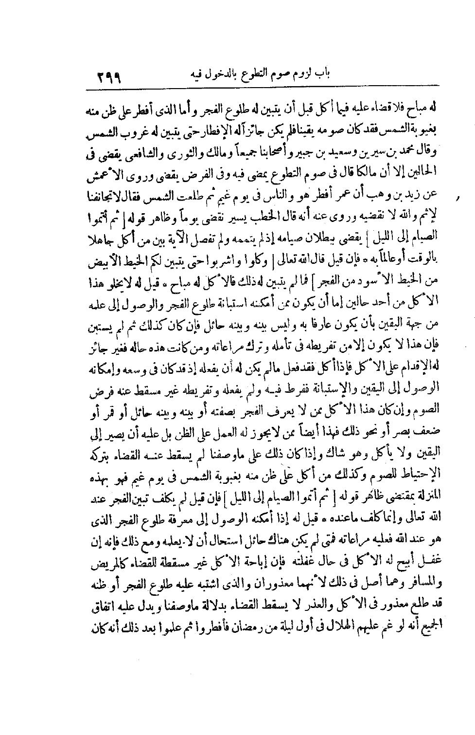 لَهُ مُبَاحٌ فَلَا قَضَاءَ عَلَيْهِ فِيمَا أَكَلَ قَبْلَ أَنْ يَتَبَيَّنَ لَهُ طُلُوعُ الْفَجْرِ وَأَمَّا الَّذِي أَفْطَرَ عَلَى ظَنٍّ مِنْهُ بِغَيْبُوبَةِ الشَّمْسِ فَقَدْ كَانَ صَوْمُهُ يَقِينًا فَلَمْ يَكُنْ جَائِزًا لَهُ الْإِفْطَارُ حَتَّى يَتَبَيَّنَ لَهُ غُرُوبُ الشَّمْس وَقَالَ مُحَمَّدُ بْنُ سِيرِينَ وَسَعِيدُ بْنُ جُبَيْرٍ وَأَصْحَابُنَا جَمِيعًا وَمَالِكٌ وَالثَّوْرِيُّ وَالشَّافِعِيُّ يَقْضِي فِي الْحَالَيْنِ إلَّا أَنَّ مَالِكًا قَالَ فِي صَوْمِ التَّطَوُّعِ يَمْضِي فِيهِ وَفِي الْفَرْضِ يَقْضِي وَرَوَى الْأَعْمَشُ عَنْ زَيْدِ بْنِ وَهْبٍ أَنَّ عُمَرَ أَفْطَرَ هُوَ وَالنَّاسُ فِي يَوْمِ غَيْمٍ ثُمَّ طلعت الشمس فقال لا تَجَانَفْنَا لِإِثْمٍ وَاَللَّهِ لَا نَقْضِيهِ وَرُوِيَ عَنْهُ أَنَّهُ قَالَ الْخَطْبُ يَسِيرٌ نَقْضِي يَوْمًا وَظَاهِرُ قوله [ثُمَّ أَتِمُّوا الصِّيامَ إِلَى اللَّيْلِ] يَقْضِي بِبُطْلَانِ صِيَامِهِ إذْ لَمْ يُتْمِمْهُ وَلَمْ تُفَصِّلْ الْآيَةُ بَيْنَ مَنْ أَكَلَ جَاهِلًا بِالْوَقْتِ أَوْ عَالِمًا بِهِ فَإِنْ قِيلَ قَالَ اللَّهُ تَعَالَى [وَكُلُوا وَاشْرَبُوا حَتَّى يَتَبَيَّنَ لَكُمُ الْخَيْطُ الْأَبْيَضُ مِنَ الْخَيْطِ الْأَسْوَدِ مِنَ الْفَجْرِ] فَمَا لَمْ يَتَبَيَّنْ لَهُ ذَلِكَ فَالْأَكْلُ لَهُ مُبَاحٌ قِيلَ لَهُ لَا يَخْلُو هَذَا الْأَكْلُ مِنْ أَحَدِ حَالَيْنِ إمَّا أَنْ يَكُونَ مِمَّنْ أَمْكَنَهُ اسْتِبَانَةُ طُلُوعِ الْفَجْرِ وَالْوُصُولُ إلَى عِلْمِهِ مِنْ جِهَةِ الْيَقِينِ بِأَنْ يَكُونَ عَارِفًا بِهِ وَلَيْسَ بَيْنَهُ وَبَيْنَهُ حَائِلٌ فَإِنْ كَانَ كَذَلِكَ ثُمَّ لَمْ يَسْتَبِنْ فَإِنَّ هَذَا لَا يَكُونُ إلَّا مِنْ تَفْرِيطِهِ فِي تَأَمُّلِهِ وَتَرْكِ مُرَاعَاتِهِ ومن كانت هذه حاله فَغَيْرُ جَائِزٍ لَهُ الْإِقْدَامُ عَلَى الْأَكْلِ فَإِذَا أَكَلَ فَقَدْ فَعَلَ مَا لَمْ يَكُنْ لَهُ أَنْ يَفْعَلَهُ إذْ قَدْ كَانَ فِي وُسْعِهِ وَإِمْكَانِهِ الْوُصُولُ إلَى الْيَقِينِ وَالِاسْتِبَانَةُ فَفَرَّطَ فِيهِ وَلَمْ يَفْعَلْهُ وَتَفْرِيطُهُ غَيْرُ مُسْقِطٍ عَنْهُ فَرْضَ الصَّوْمِ وَإِنْ كَانَ هَذَا الْآكِلُ مِمَّنْ لَا يَعْرِفُ الْفَجْرَ بِصِفَتِهِ أَوْ بَيْنَهُ وَبَيْنَهُ حَائِلٌ أَوْ قَمَرٌ