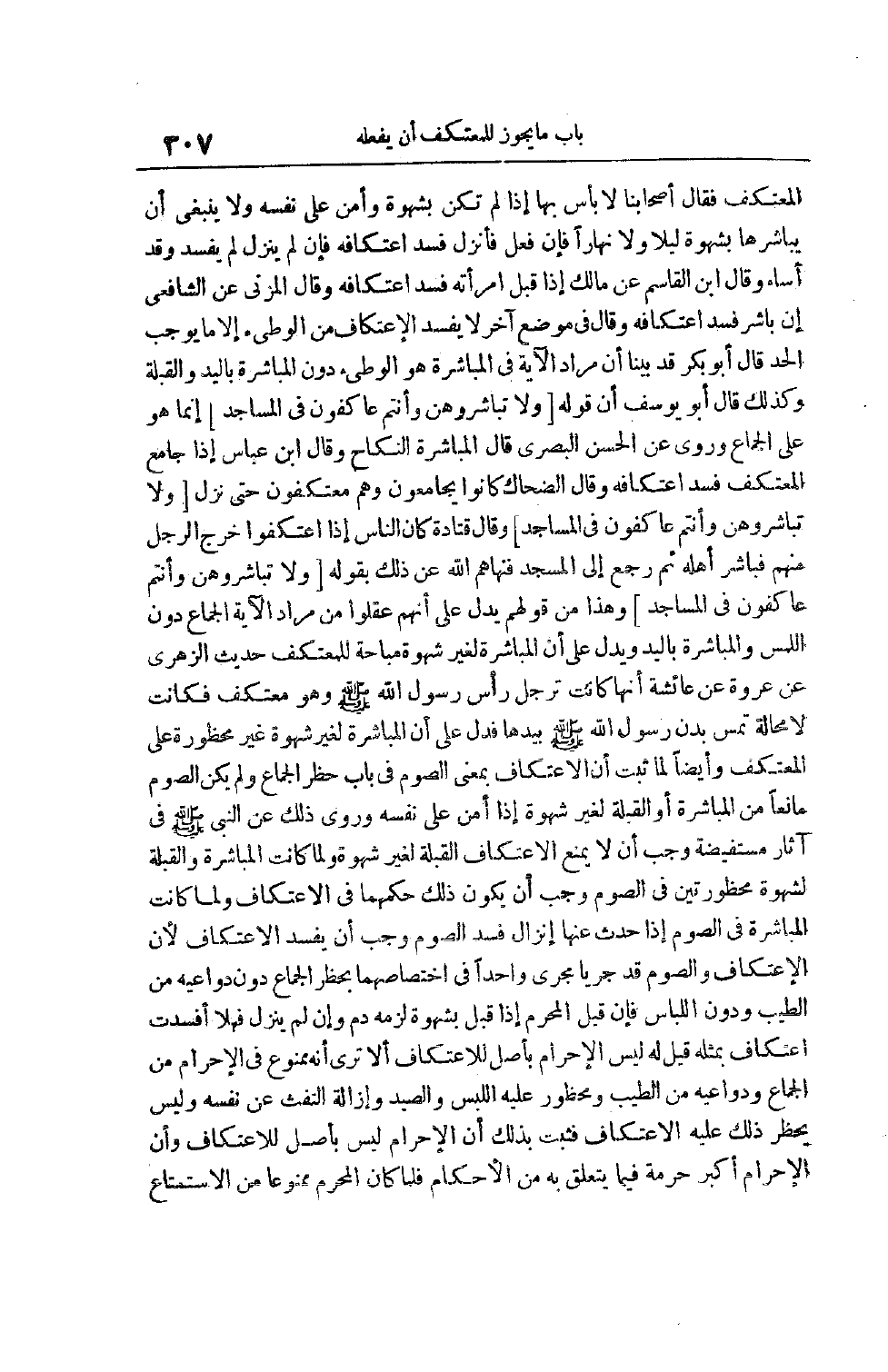 الْمُعْتَكِفِ فَقَالَ أَصْحَابُنَا لَا بَأْسَ بِهَا إذَا لَمْ تَكُنْ بِشَهْوَةٍ وَأَمِنَ عَلَى نَفْسِهِ وَلَا يَنْبَغِي أَنْ يُبَاشِرَهَا بِشَهْوَةٍ لَيْلًا وَلَا نَهَارًا فَإِنْ فَعَلَ فَأَنْزَلَ فَسَدَ اعْتِكَافُهُ فَإِنْ لَمْ يُنْزِلْ لَمْ يَفْسُدْ وَقَدْ أَسَاءَ وَقَالَ ابْنُ الْقَاسِمِ عَنْ مَالِكٍ إذَا قَبَّلَ امْرَأَتَهُ فَسَدَ اعْتِكَافُهُ وَقَالَ الْمُزَنِيّ عَنْ الشَّافِعِيِّ إنْ بَاشَرَ فَسَدَ اعْتِكَافُهُ وَقَالَ فِي مَوْضِعٍ آخَرَ لَا يُفْسِدُ الِاعْتِكَافَ مِنْ الْوَطْءِ إلَّا مَا يُوجِبُ الْحَدَّ قَالَ أَبُو بَكْرٍ قَدْ بَيَّنَّا أَنَّ مُرَادَ الْآيَةِ فِي الْمُبَاشَرَةِ هُوَ الْوَطْءُ دُونَ الْمُبَاشَرَةِ بِالْيَدِ وَالْقُبْلَةِ وَكَذَلِكَ قَالَ أَبُو يُوسُفَ إنَّ قَوْلَهُ [وَلا تُبَاشِرُوهُنَّ وَأَنْتُمْ عاكِفُونَ فِي الْمَساجِدِ] إنَّمَا هُوَ عَلَى الْجِمَاعِ وَرُوِيَ عَنْ الْحَسَنِ الْبَصْرِيِّ قَالَ الْمُبَاشَرَةُ النِّكَاحُ وَقَالَ ابْنُ عَبَّاسٍ إذَا جَامَعَ الْمُعْتَكِفُ فَسَدَ اعْتِكَافُهُ وَقَالَ الضَّحَّاكُ كَانُوا يُجَامِعُونَ وَهُمْ مُعْتَكِفُونَ حَتَّى نَزَلَ [وَلا تُبَاشِرُوهُنَّ وَأَنْتُمْ عاكِفُونَ فِي الْمَساجِدِ] وَقَالَ قَتَادَةُ كَانَ النَّاسُ إذَا اعْتَكَفُوا خَرَجَ الرَّجُلُ مِنْهُمْ فَبَاشَرَ أَهْلَهُ ثُمَّ رَجَعَ إلَى الْمَسْجِدِ فَنَهَاهُمْ اللَّهُ عَنْ ذَلِكَ بِقَوْلِهِ [وَلا تُبَاشِرُوهُنَّ وَأَنْتُمْ عاكِفُونَ فِي الْمَساجِدِ] وَهَذَا مِنْ قَوْلِهِمْ يَدُلُّ عَلَى أَنَّهُمْ عَقَلُوا مِنْ مُرَادِ الْآيَةِ الْجِمَاعَ دُونَ اللَّمْسِ وَالْمُبَاشَرَةِ بِالْيَدِ وَيَدُلُّ عَلَى أَنَّ الْمُبَاشَرَةَ لِغَيْرِ شَهْوَةٍ مُبَاحَةٌ لِلْمُعْتَكِفِ حَدِيثُ الزُّهْرِيِّ عَنْ عُرْوَةَ عَنْ عائشة أنها كانت رجل رَأْسَ رَسُولِ اللَّهِ صَلَّى اللَّهُ عَلَيْهِ وَسَلَّمَ وَهُوَ مُعْتَكِفٌ فَكَانَتْ لَا مَحَالَةَ تَمَسُّ بَدَنَ رَسُولِ اللَّهِ صَلَّى اللَّهُ عَلَيْهِ وَسَلَّمَ بِيَدِهَا فَدَلَّ عَلَى أَنَّ الْمُبَاشَرَةَ لِغَيْرِ شَهْوَةٍ غَيْرُ مَحْظُورَةٍ عَلَى الْمُعْتَكِفِ وَأَيْضًا لِمَا ثَبَتَ أَنَّ الِاعْتِكَافَ بِمَعْنَى الصَّوْمِ فِي بَابِ حَظْرِ الْجِمَاعِ