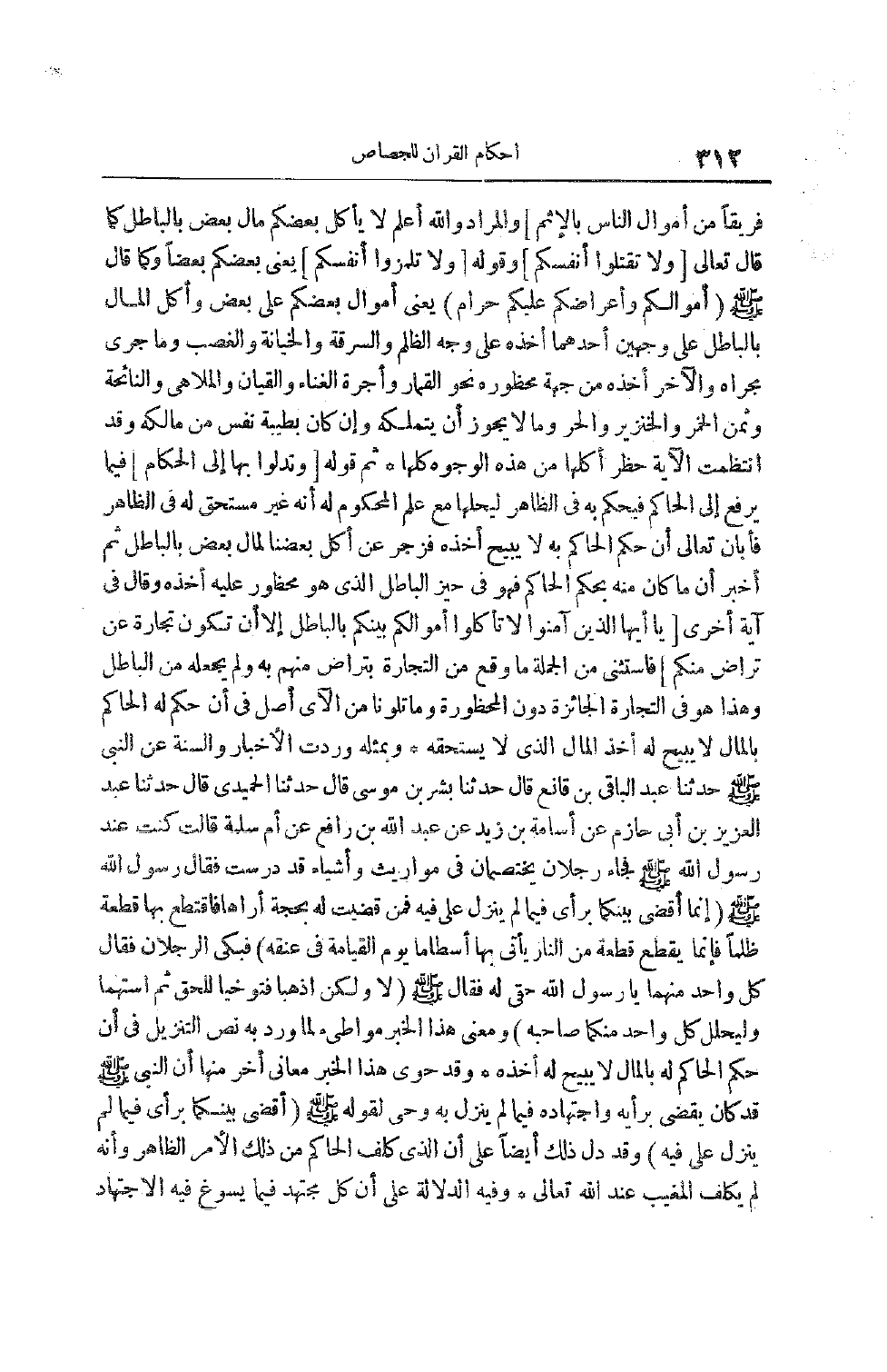 يَعْنِي أَمْوَالَ بَعْضِكُمْ على بعض وأكل الْمَالِ بِالْبَاطِلِ عَلَى وَجْهَيْنِ أَحَدُهُمَا أَخْذُهُ عَلَى وَجْهِ الظُّلْمِ وَالسَّرِقَةِ وَالْخِيَانَةِ وَالْغَصْبِ وَمَا جَرَى مَجْرَاهُ وَالْآخَرُ أَخْذُهُ مِنْ جِهَةٍ مَحْظُورَةٍ نَحْوُ القمار وَأُجْرَةِ الْغِنَاءِ وَالْقِيَانِ وَالْمَلَاهِي وَالنَّائِحَةِ وَثَمَنِ الْخَمْرِ وَالْخِنْزِيرِ وَالْحُرِّ وَمَا لَا يَجُوزُ أَنْ يَتَمَلَّكَهُ وَإِنْ كَانَ بِطِيبَةِ نَفْسٍ مِنْ مَالِكِهِ وَقَدْ انْتَظَمَتْ الْآيَةُ حَظْرَ أَكْلِهَا مِنْ هَذِهِ الْوُجُوهِ كُلِّهَا ثُمَّ قَوْلُهُ [وَتُدْلُوا بِها إِلَى الْحُكَّامِ] فِيمَا يُرْفَعُ إلَى الْحَاكِمِ فَيَحْكُمُ بِهِ فِي الظَّاهِرِ لِيُحِلَّهَا مَعَ عِلْمِ الْمَحْكُومِ لَهُ أَنَّهُ غَيْرُ مُسْتَحِقٍّ لَهُ فِي الظَّاهِرِ فَأَبَانَ تَعَالَى أَنَّ حُكْمَ الْحَاكِمِ بِهِ لَا يُبِيحُ أَخْذَهُ فَزَجَرَ عَنْ أَكْلِ بَعْضِنَا لِمَالِ بَعْضٍ بِالْبَاطِلِ ثُمَّ أَخْبَرَ أَنَّ مَا كَانَ مِنْهُ بِحُكْمِ الْحَاكِمِ فَهُوَ فِي حَيِّزِ الْبَاطِلِ الَّذِي هُوَ مَحْظُورٌ عَلَيْهِ أَخْذُهُ وَقَالَ فِي آيَةٍ أُخْرَى [يَا أَيُّهَا الَّذِينَ آمَنُوا لا تَأْكُلُوا أَمْوالَكُمْ بَيْنَكُمْ بِالْباطِلِ إِلَّا أَنْ تَكُونَ تِجارَةً عَنْ تَراضٍ مِنْكُمْ] فَاسْتَثْنَى مِنْ الْجُمْلَةِ مَا وَقَعَ مِنْ التِّجَارَةِ بِتَرَاضٍ مِنْهُمْ بِهِ وَلَمْ يَجْعَلْهُ مِنْ الْبَاطِلِ وَهَذَا هُوَ فِي التِّجَارَةِ الْجَائِزَةِ دُونَ الْمَحْظُورَةِ وَمَا تَلَوْنَا مِنْ الْآيِ أَصْلٌ فِي أَنَّ حكم له الحاكم بِالْمَالِ لَا يُبِيحُ لَهُ أَخْذَ الْمَالِ الَّذِي لَا يَسْتَحِقُّهُ وَبِمِثْلِهِ وَرَدَتْ الْأَخْبَارُ وَالسُّنَّةُ عَنْ النَّبِيِّ صَلَّى اللَّهُ عَلَيْهِ وَسَلَّمَ