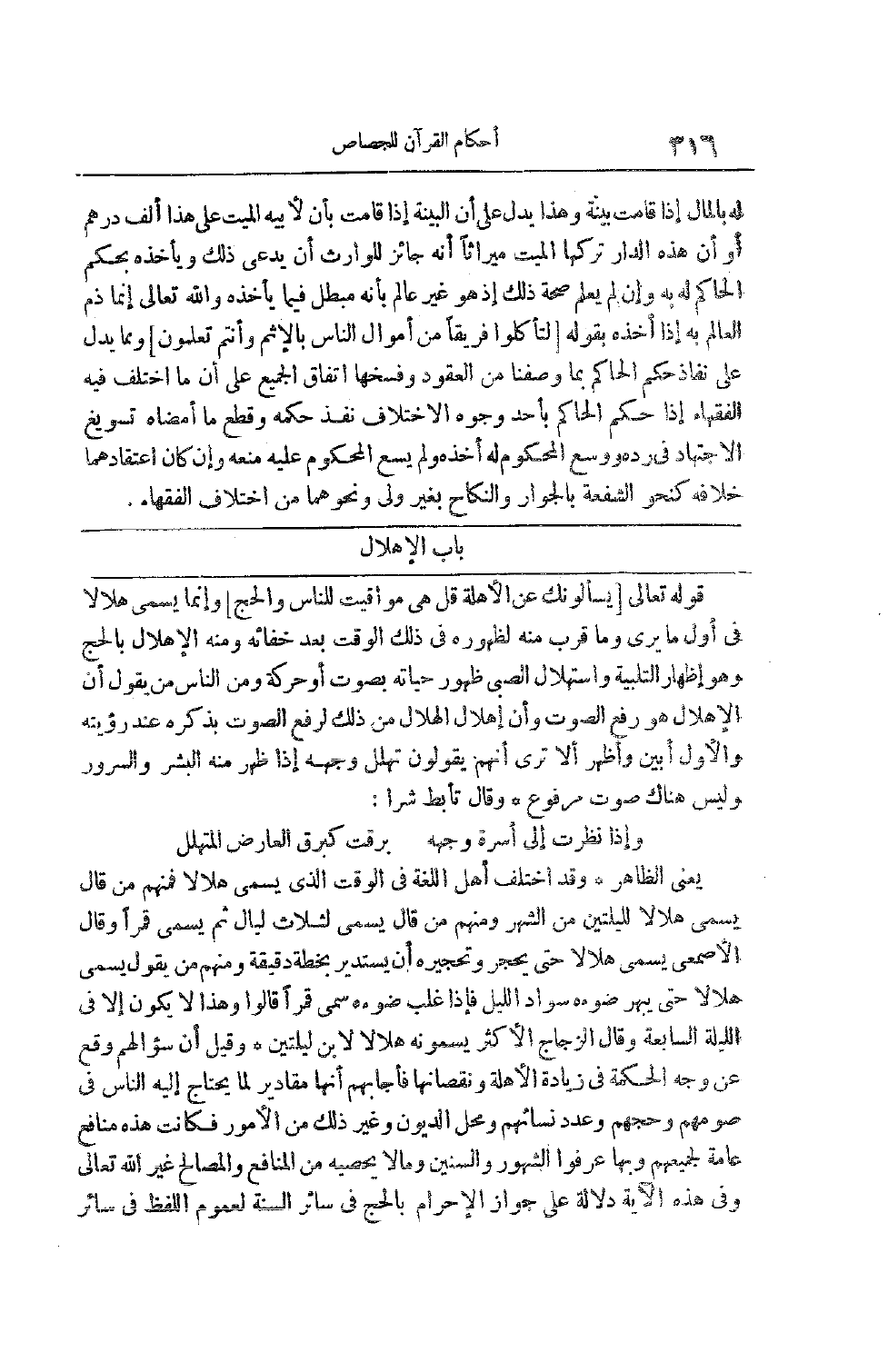 قوله تعالى [يَسْئَلُونَكَ عَنِ الْأَهِلَّةِ قُلْ هِيَ مَواقِيتُ لِلنَّاسِ وَالْحَجِ] وَإِنَّمَا يُسَمَّى هِلَالًا فِي أَوَّلِ مَا يُرَى وَمَا قَرُبَ مِنْهُ لِظُهُورِهِ فِي ذَلِكَ الْوَقْتِ بَعْدَ خَفَائِهِ وَمِنْهُ الْإِهْلَالُ بِالْحَجِّ وَهُوَ إظْهَارُ التَّلْبِيَةِ وَاسْتِهْلَالُ الصَّبِيِّ ظُهُورُ حَيَاتِهِ بِصَوْتٍ أَوْ حَرَكَةٍ وَمِنْ النَّاسِ مَنْ يَقُولُ إنَّ الْإِهْلَالَ هُوَ رَفْعُ الصَّوْتِ وَإِنَّ إهْلَالَ الْهِلَالِ مِنْ ذَلِكَ لِرَفْعِ الصَّوْتِ بِذِكْرِهِ عِنْدَ رُؤْيَتِهِ وَالْأَوَّلُ أَبْيَنُ وَأَظْهَرُ أَلَا تَرَى أَنَّهُمْ يَقُولُونَ تَهَلَّلَ وَجْهُهُ إذَا ظَهَرَ مِنْهُ الْبِشْرُ وَالسُّرُورُ وَلَيْسَ هُنَاكَ صَوْتٌ مَرْفُوعٌ وَقَالَ تَأَبَّطَ شَرًّا: وَإِذَا نَظَرْتَ إلَى أَسِرَّةِ وَجْهِهِ بَرَقَتْ كَبَرْقِ الْعَارِضِ الْمُتَهَلِّلِ يَعْنِي الظَّاهِرَ وَقَدْ اخْتَلَفَ أَهْلُ اللُّغَةِ فِي الْوَقْتِ الَّذِي يُسَمَّى هِلَالًا فَمِنْهُمْ مَنْ قَالَ يُسَمَّى هِلَالًا لِلَيْلَتَيْنِ مِنْ الشَّهْر وَمِنْهُمْ مَنْ قَالَ يُسَمَّى لِثَلَاثِ لَيَالٍ ثُمَّ يُسَمَّى قَمَرًا وَقَالَ الْأَصْمَعِيُّ يُسَمَّى هِلَالًا حَتَّى يَحْجُرَ وَتَحْجِيرُهُ أَنْ يَسْتَدِيرَ بِخُطَّةٍ دَقِيقَةٍ وَمِنْهُمْ مَنْ يَقُولُ يُسَمَّى هِلَالًا حَتَّى يُبْهِرَ ضَوْءُهُ سَوَادَ اللَّيْلِ فَإِذَا غَلَبَ ضَوْءُهُ سُمِّيَ قَمَرًا قَالُوا وَهَذَا لَا يَكُونُ إلَّا فِي اللَّيْلَةِ السَّابِعَةِ وَقَالَ الزَّجَّاجُ الْأَكْثَرُ يُسَمُّونَهُ هِلَالًا لِابْنِ لَيْلَتَيْنِ وَقِيلَ إنَّ سُؤَالَهُمْ وَقَعَ عَنْ وَجْهِ الْحِكْمَةِ فِي زِيَادَةِ الْأَهِلَّةِ وَنُقْصَانِهَا فَأَجَابَهُمْ إنَّهَا مَقَادِيرُ لِمَا يَحْتَاجُ إلَيْهِ النَّاسُ فِي صَوْمِهِمْ وَحَجِّهِمْ وَعِدَدِ نِسَائِهِمْ وَمَحَلِّ الدُّيُونِ وَغَيْرِ ذَلِكَ مِنْ الْأُمُورِ فَكَانَتْ هَذِهِ مَنَافِعَ عَامَّةً لِجَمِيعِهِمْ وَبِهَا عَرَفُوا الشُّهُورَ وَالسِّنِينَ وَمَا لَا يُحْصِيهِ مِنْ الْمَنَافِعِ وَالْمَصَالِحِ غَيْرُ اللَّهِ تَعَالَى وَفِي هَذِهِ الْآيَةِ دَلَالَةٌ عَلَى جَوَازِ الْإِحْرَامِ بِالْحَجِّ فِي سَائِرِ السَّنَةِ لِعُمُومِ اللَّفْظِ فِي سَائِرِ