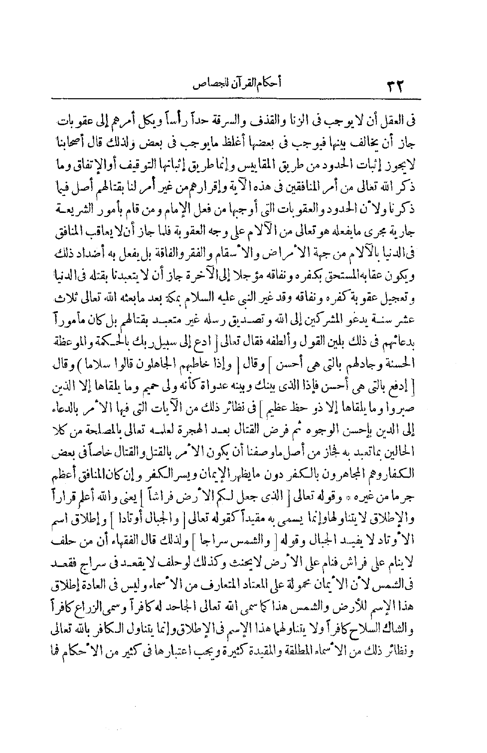 فِي الْعَقْلِ أَنْ لَا يُوجِبَ فِي الزِّنَا وَالْقَذْفِ وَالسَّرِقَةِ حَدًّا رَأْسًا وَيَكِلَ أَمْرَهُمْ إلَى عقوبات جَازَ أَنْ يُخَالِفَ بَيْنَهَا فَيُوجِبَ فِي بَعْضِهَا أغلظ ما يُوجِبُ فِي بَعْضٍ وَلِذَلِكَ قَالَ أَصْحَابُنَا لَا يَجُوزُ إثْبَاتُ الْحُدُودِ مِنْ طَرِيقِ الْمَقَايِيسِ وَإِنَّمَا طريق إثباتها التوقيف أو الاتفاق وما ذكر اللَّهُ تَعَالَى مِنْ أَمْرِ الْمُنَافِقِينَ فِي هَذِهِ الْآيَةِ وَإِقْرَارِهِمْ مِنْ غَيْرِ أَمْرٍ لَنَا بِقِتَالِهِمْ أَصْلٌ فِيمَا ذَكَرْنَا وَلِأَنَّ الْحُدُودَ وَالْعُقُوبَاتِ الَّتِي أَوْجَبَهَا مِنْ فِعْلِ الْإِمَامِ وَمَنْ قَامَ بِأُمُورِ الشَّرِيعَةِ جَارِيَةٌ مَجْرَى مَا يَفْعَلُهُ هُوَ تَعَالَى مِنْ الْآلَامِ عَلَى وَجْهِ الْعُقُوبَةِ فَلَمَّا جَازَ أَنْ لَا يُعَاقِبَ الْمُنَافِقَ فِي الدُّنْيَا بِالْآلَامِ مِنْ جِهَةِ الْأَمْرَاضِ وَالْأَسْقَامِ وَالْفَقْرِ وَالْفَاقَةِ بَلْ يَفْعَلُ بِهِ أَضْدَادَ ذَلِكَ وَيَكُونَ عِقَابُهُ الْمُسْتَحِقَّ بِكُفْرِهِ وَنِفَاقِهِ مُؤَجَّلًا إلَى الْآخِرَةِ جَازَ أَنْ لَا يَتَعَبَّدَنَا بِقَتْلِهِ فِي الدُّنْيَا وَتَعْجِيلِ عُقُوبَةِ كفره ونفاقه وقد غير النَّبِيُّ عَلَيْهِ السَّلَامُ بِمَكَّةَ بَعْدَ مَا بَعَثَهُ الله تعالى ثلاث عشر سَنَةً يَدْعُو الْمُشْرِكِينَ إلَى اللَّهِ وَتَصْدِيقِ رُسُلِهِ غَيْرَ مُتَعَبِّدٍ بِقِتَالِهِمْ بَلْ كَانَ مَأْمُورًا بِدُعَائِهِمْ في ذلك بلين الْقَوْلِ وَأَلْطَفِهِ فَقَالَ تَعَالَى [ادْعُ إِلى سَبِيلِ رَبِّكَ بِالْحِكْمَةِ وَالْمَوْعِظَةِ الْحَسَنَةِ وَجادِلْهُمْ بِالَّتِي هِيَ أَحْسَنُ] وقال [وَإِذا خاطَبَهُمُ الْجاهِلُونَ قالُوا سَلاماً] وَقَالَ [ادْفَعْ بِالَّتِي هِيَ أَحْسَنُ فَإِذَا الَّذِي بَيْنَكَ وَبَيْنَهُ عَداوَةٌ كَأَنَّهُ وَلِيٌّ حَمِيمٌ وَما يُلَقَّاها إِلَّا الَّذِينَ صَبَرُوا وَما يُلَقَّاها إِلَّا ذُو حَظٍّ عَظِيمٍ] فِي نَظَائِرِ ذَلِكَ مِنْ الْآيَاتِ الَّتِي فِيهَا الْأَمْرُ بِالدُّعَاءِ إلَى الدِّينِ بِأَحْسَنِ الْوُجُوهِ ثُمَّ فَرَضَ الْقِتَالَ بَعْدَ الْهِجْرَةِ لِعِلْمِهِ تَعَالَى بِالْمَصْلَحَةِ مِنْ كِلَا الْحَالَيْنِ بِمَا تَعَبَّدَ بِهِ فَجَازَ مِنْ أَصْلِ مَا وَصَفْنَا أَنْ يَكُونَ الْأَمْرُ بِالْقَتْلِ وَالْقِتَالِ خَاصًّا فِي بَعْضِ الْكُفَّارِ وَهُمْ المجاهرون بالكفر دون ما يُظْهِرُ الْإِيمَانَ وَيُسِرُّ الْكُفْرَ وَإِنْ كَانَ الْمُنَافِقُ أَعْظَمَ جُرْمًا مِنْ غَيْرِهِ