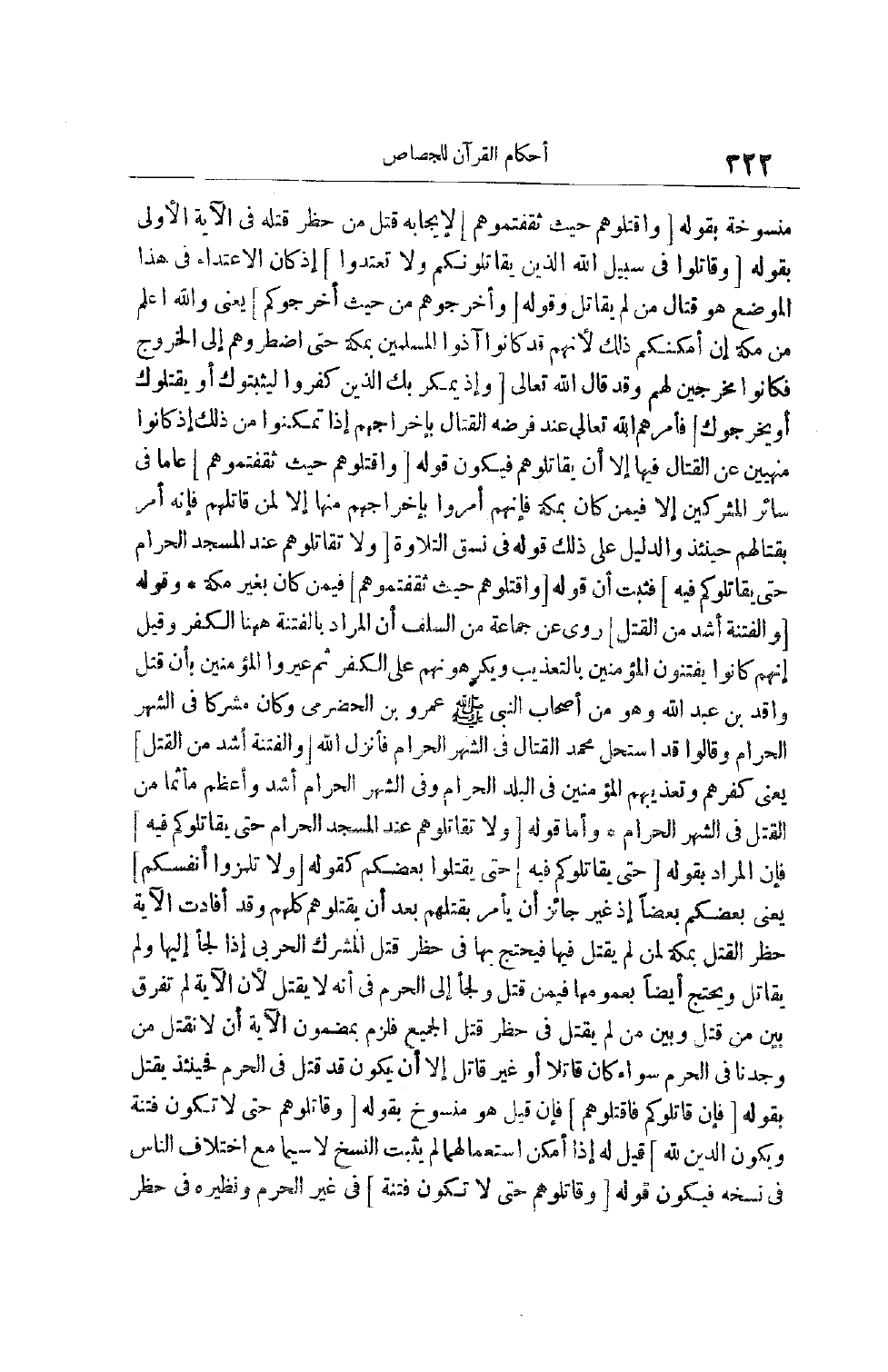 منسوخة بقوله [وَاقْتُلُوهُمْ حَيْثُ ثَقِفْتُمُوهُمْ] لِإِيجَابِهِ قَتْلَ مَنْ حُظِرَ قَتْلُهُ فِي الْآيَةِ الْأُولَى بِقَوْلِهِ [وَقاتِلُوا فِي سَبِيلِ اللَّهِ الَّذِينَ يُقاتِلُونَكُمْ وَلا تَعْتَدُوا] إذْ كَانَ الِاعْتِدَاءُ فِي هَذَا الْمَوْضِعِ هُوَ قِتَالَ مَنْ لَمْ يُقَاتِلْ وَقَوْلُهُ [وَأَخْرِجُوهُمْ مِنْ حَيْثُ أَخْرَجُوكُمْ] يَعْنِي وَاَللَّهُ أَعْلَمُ مِنْ مَكَّةَ إنْ أَمْكَنَكُمْ ذَلِكَ لِأَنَّهُمْ قَدْ كَانُوا آذَوْا الْمُسْلِمِينَ بِمَكَّةَ حَتَّى اضْطَرُّوهُمْ إلَى الْخُرُوجِ فَكَانُوا مُخْرِجِينَ لَهُمْ وَقَدْ قَالَ اللَّهُ تَعَالَى [وَإِذْ يَمْكُرُ بِكَ الَّذِينَ كَفَرُوا لِيُثْبِتُوكَ أَوْ يَقْتُلُوكَ أَوْ يُخْرِجُوكَ] فَأَمَرَهُمْ اللَّهُ تَعَالَى عِنْدَ فَرْضِهِ الْقِتَالَ بِإِخْرَاجِهِمْ إذَا تَمَكَّنُوا مِنْ ذَلِكَ إذْ كَانُوا مَنْهِيِّينَ عَنْ الْقِتَالِ فِيهَا إلَّا أَنْ يُقَاتِلُوهُمْ فَيَكُونُ قوله [وَاقْتُلُوهُمْ حَيْثُ ثَقِفْتُمُوهُمْ] عَامًّا فِي سَائِرِ الْمُشْرِكِينَ إلَّا فِيمَنْ كَانَ بِمَكَّةَ فَإِنَّهُمْ أُمِرُوا بِإِخْرَاجِهِمْ مِنْهَا إلَّا لِمَنْ قَاتَلَهُمْ فَإِنَّهُ أُمِرَ بِقِتَالِهِمْ حِينَئِذٍ وَالدَّلِيلُ عَلَى ذَلِكَ قَوْلُهُ فِي نَسَقِ التِّلَاوَةِ [وَلا تُقاتِلُوهُمْ عِنْدَ الْمَسْجِدِ الْحَرامِ حَتَّى يُقاتِلُوكُمْ فِيهِ] فثبت أن قوله [وَاقْتُلُوهُمْ حَيْثُ ثَقِفْتُمُوهُمْ] فِيمَنْ كَانَ بِغَيْرِ مَكَّةَ وَقَوْلُهُ [وَالْفِتْنَةُ أَشَدُّ مِنَ الْقَتْلِ] رُوِيَ عَنْ جَمَاعَةٍ مِنْ السَّلَفِ أَنَّ الْمُرَادَ بالفتنة هاهنا الْكُفْرُ وَقِيلَ إنَّهُمْ كَانُوا يَفْتِنُونَ الْمُؤْمِنِينَ بِالتَّعْذِيبِ وَيُكْرِهُونَهُمْ عَلَى الْكُفْرِ ثُمَّ عَيَّرُوا الْمُؤْمِنِينَ بِأَنْ قَتَلَ وَاقِدُ بْنُ عَبْدِ اللَّهِ وَهُوَ مِنْ أَصْحَابِ النَّبِيِّ صَلَّى اللَّهُ عَلَيْهِ وَسَلَّمَ عَمْرَو بْنَ الْحَضْرَمِيِّ وَكَانَ مُشْرِكًا فِي الشَّهْرِ الْحَرَامِ وَقَالُوا قَدْ اسْتَحَلَّ مُحَمَّدٌ الْقِتَالَ فِي الشَّهْرِ الْحَرَامِ فَأَنْزَلَ اللَّهُ [وَالْفِتْنَةُ أَشَدُّ مِنَ الْقَتْلِ] يَعْنِي كُفْرَهُمْ وَتَعْذِيبَهُمْ الْمُؤْمِنِينَ فِي الْبَلَدِ الْحَرَامِ وَفِي الشَّهْرِ الْحَرَامِ أَشَدَّ وَأَعْظَمَ مَأْثَمًا مِنْ الْقَتْلِ فِي الشَّهْرِ الْحَرَامِ وَأَمَّا قَوْلُهُ [وَلا تُقاتِلُوهُمْ عِنْدَ الْمَسْجِدِ الْحَرامِ حَتَّى يُقاتِلُوكُمْ فِيهِ] فإن المراد بقوله [حَتَّى يُقاتِلُوكُمْ فِيهِ] حَتَّى يَقْتُلُوا بَعْضَكُمْ كَقَوْلِهِ [وَلا تَلْمِزُوا أَنْفُسَكُمْ] يَعْنِي بَعْضُكُمْ بَعْضًا إذْ غَيْرُ جَائِزٍ أَنْ يَأْمُرَ بِقَتْلِهِمْ بَعْدَ أَنْ يَقْتُلُوهُمْ كُلَّهُمْ وَقَدْ أَفَادَتْ الْآيَةُ حَظْرَ الْقَتْلِ بِمَكَّةَ لِمَنْ لَمْ يُقْتَلْ فِيهَا فَيُحْتَجُّ بِهَا فِي حَظْرِ قَتْلِ الْمُشْرِكِ الْحَرْبِيِّ إذَا لَجَأَ إلَيْهَا وَلَمْ يُقَاتِلْ وَيُحْتَجُّ أَيْضًا بِعُمُومِهَا فِيمَنْ قَتَلَ وَلَجَأَ إلَى الْحَرَمِ فِي أَنَّهُ لَا يُقْتَلُ لِأَنَّ الْآيَةَ لَمْ تُفَرِّقْ بَيْنَ مَنْ قَتَلَ وَبَيْنَ مَنْ لَمْ يَقْتُلْ فِي حَظْرِ قَتْلِ الْجَمِيعِ فَلَزِمَ بِمَضْمُونِ الْآيَةِ أَنْ لَا نَقْتُلَ مَنْ وَجَدْنَا فِي الْحَرَمِ سَوَاءٌ كَانَ قَاتِلًا أَوْ غَيْرَ قَاتِلٍ إلَّا أَنْ يَكُونَ قَدْ قَتَلَ فِي الْحَرَمِ فَحِينَئِذٍ يُقْتَلُ بِقَوْلِهِ [فَإِنْ قاتَلُوكُمْ فَاقْتُلُوهُمْ] فَإِنْ قِيلَ هُوَ مَنْسُوخٌ بِقَوْلِهِ [وَقاتِلُوهُمْ حَتَّى لا تَكُونَ فِتْنَةٌ وَيَكُونَ الدِّينُ لِلَّهِ] قيل له إذا أمكن استعمالهما لَمْ يَثْبُتْ النَّسْخُ لَا سِيَّمَا مَعَ اخْتِلَافِ النَّاسِ فِي نَسْخِهِ فَيَكُونُ قَوْلُهُ [وَقاتِلُوهُمْ ح