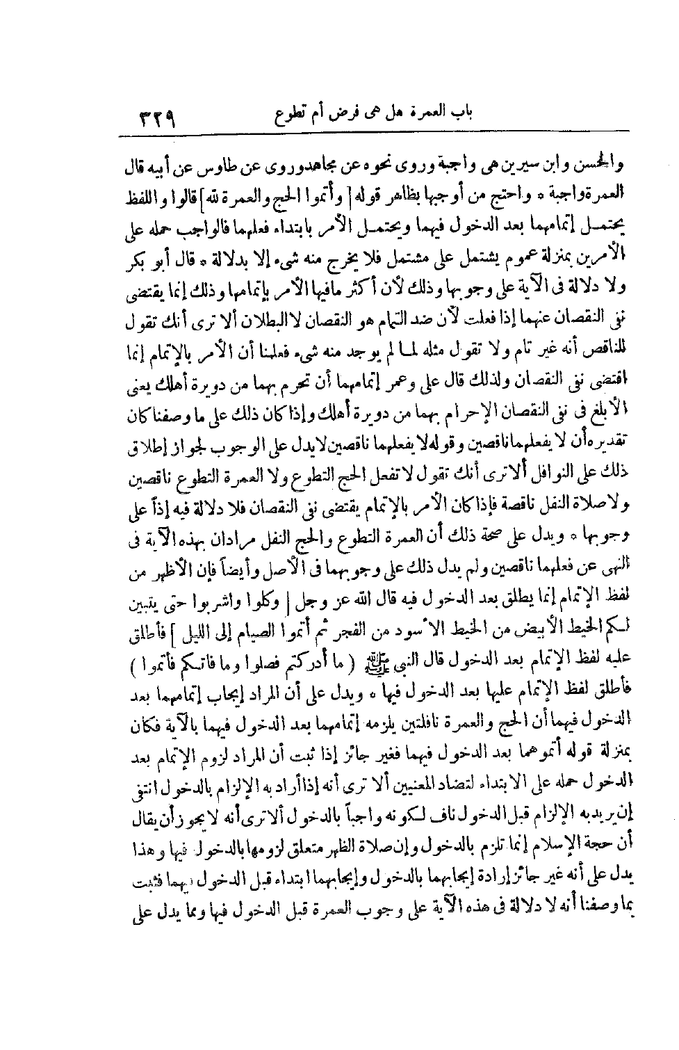 وَالْحَسَنُ وَابْنُ سِيرِينَ هِيَ وَاجِبَةٌ وَرُوِيَ نَحْوَهُ عَنْ مُجَاهِدٍ وَرُوِيَ عَنْ طَاوُسٍ عَنْ أَبِيهِ قَالَ الْعُمْرَةُ وَاجِبَةٌ وَاحْتَجَّ مِنْ أَوْجَبَهَا بِظَاهِرِ قوله [وَأَتِمُّوا الْحَجَّ وَالْعُمْرَةَ لِلَّهِ] قَالُوا وَاللَّفْظُ يَحْتَمِلُ إتْمَامُهُمَا بَعْدَ الدُّخُولِ فِيهِمَا وَيَحْتَمِلُ الْأَمْرَ بِابْتِدَاءِ فِعْلِهِمَا فَالْوَاجِبُ حَمْلُهُ عَلَى الْأَمْرَيْنِ بِمَنْزِلَةِ عُمُومٍ يَشْتَمِلُ عَلَى مُشْتَمِلٍ فَلَا يَخْرُجُ مِنْهُ شَيْءٌ إلَّا بِدَلَالَةٍ قَالَ أَبُو بَكْرٍ وَلَا دَلَالَةَ فِي الْآيَةِ عَلَى وُجُوبِهَا وذلك لأن أكثر ما فيها الأمر بإتمامها وَذَلِكَ إنَّمَا يَقْتَضِي نَفْيَ النُّقْصَانِ عَنْهُمَا إذَا فُعِلَتْ لِأَنَّ ضِدَّ التَّمَامِ هُوَ النُّقْصَانُ لَا الْبُطْلَانُ أَلَا تَرَى أَنَّكَ تَقُولُ لِلنَّاقِصِ إنَّهُ غَيْرُ تَامٍّ وَلَا تَقُولُ مِثْلَهُ لِمَا لَمْ يُوجَدْ مِنْهُ شَيْءٌ فَعَلِمْنَا أَنَّ الْأَمْرَ بِالْإِتْمَامِ إنَّمَا اقْتَضَى نَفْيَ النُّقْصَانِ وَلِذَلِكَ