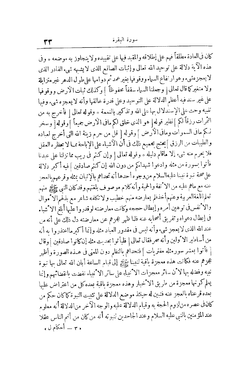 وقَوْله تَعَالَى [وَإِنْ كُنْتُمْ فِي رَيْبٍ مِمَّا نَزَّلْنا عَلى عَبْدِنا فَأْتُوا بِسُورَةٍ مِنْ مِثْلِهِ وَادْعُوا شُهَداءَكُمْ مِنْ دُونِ اللَّهِ إِنْ كُنْتُمْ صادِقِينَ] فِيهِ أَكْبَرُ دَلَالَةٍ عَلَى صِحَّةِ نُبُوَّةِ نَبِيِّنَا عَلَيْهِ السَّلَامُ مِنْ وُجُوهٍ أَحَدُهَا أَنَّهُ تَحَدَّاهُمْ بِالْإِتْيَانِ بِمِثْلِهِ وَقَرَعَهُمْ بِالْعَجْزِ عَنْهُ مَعَ مَا هُمْ عَلَيْهِ مِنْ الْأَنَفَةِ وَالْحَمِيَّةِ وَأَنَّهُ كَلَامٌ مَوْصُوفٌ بِلُغَتِهِمْ وَقَدْ كَانَ النَّبِيُّ صَلَّى اللَّهُ عَلَيْهِ وَسَلَّمَ مِنْهُمْ تَعَلَّمَ اللُّغَةَ الْعَرَبِيَّةَ وَعَنْهُمْ أَخَذَ فَلَمْ يُعَارِضْهُ مِنْهُمْ خَطِيبٌ وَلَا تَكَلَّفَهُ شَاعِرٌ مَعَ بَذْلِهِمْ الْأَمْوَالَ وَالْأَنْفُسَ فِي تُوهِينِ أَمْرِهِ وَإِبْطَالِ حُجَجِهِ وَكَانَتْ مُعَارَضَتُهُ لَوْ قَدَرُوا عَلَيْهَا أَبْلَغَ الْأَشْيَاءِ فِي إبْطَالِ دَعْوَاهُ وَتَفْرِيقِ أَصْحَابِهِ عَنْهُ فَلَمَّا ظَهَرَ عَجْزُهُمْ عَنْ مُعَارَضَتِهِ دَلَّ ذَلِكَ عَلَى أَنَّهُ مِنْ عِنْدِ اللَّهِ الذي لا يعجز شَيْءٌ وَأَنَّهُ لَيْسَ فِي مَقْدُورِ الْعِبَادِ مِثْلُهُ وَإِنَّمَا أَكْبَرُ مَا اعْتَذَرُوا بِهِ أَنَّهُ مِنْ أَسَاطِيرِ الْأَوَّلِينَ وَأَنَّهُ سِحْرٌ فَقَالَ تَعَالَى [فَلْيَأْتُوا بِحَدِيثٍ مِثْلِهِ إِنْ كانُوا صادِقِينَ] وقال [فَأْتُوا بِعَشْرِ سُوَرٍ مِثْلِهِ مُفْتَرَياتٍ] فَتَحَدَّاهُمْ بِالنَّظْمِ دُونَ الْمَعْنَى فِي هَذِهِ الصُّورَةِ وَأَظْهَرَ عَجْزَهُمْ عَنْهُ فَكَانَتْ هَذِهِ مُعْجِزَةً بَاقِيَةً لنبينا صلّى الله عَلَيْهِ وَسَلَّمَ إلَى قِيَامِ السَّاعَةِ أَبَانَ اللَّهُ تعالى بها نبوة نبيه وفضله بها لأن سائر معجزات الأنبياء على سائر الأنبياء نقضت بِانْقِضَائِهِمْ وَإِنَّمَا يُعْلَمُ كَوْنُهَا مُعْجِزَةً مِنْ طَرِيقِ الْأَخْبَارِ وَهَذِهِ مُعْجِزَةٌ بَاقِيَةٌ بَعْدَهُ كُلُّ مَنْ اعتراض عليها بعده قَرَّعْنَاهُ بِالْعَجْزِ عَنْهُ فَتَبَيَّنَ لَهُ حِينَئِذٍ مَوْضِعُ الدَّلَالَةِ عَلَى تَثْبِيتِ النُّبُوَّةِ كَمَا كَانَ حُكْمُ مَنْ كَانَ فِي عَصْرِهِ مِنْ لُزُومِ الْحُجَّةِ بِهِ وَقِيَامِ الدَّلَالَةِ عَلَيْهِ وَالْوَجْهُ الْآخَرُ مِنْ الدَّلَالَةِ أَنَّهُ مَعْلُومٌ عِنْدَ الْمُؤْمِنِينَ بِالنَّبِيِّ عَلَيْهِ السلام وعند الجاحدين لنبوته أنه من كَانَ مِنْ أَتَمِّ النَّاسِ عَقْلًا